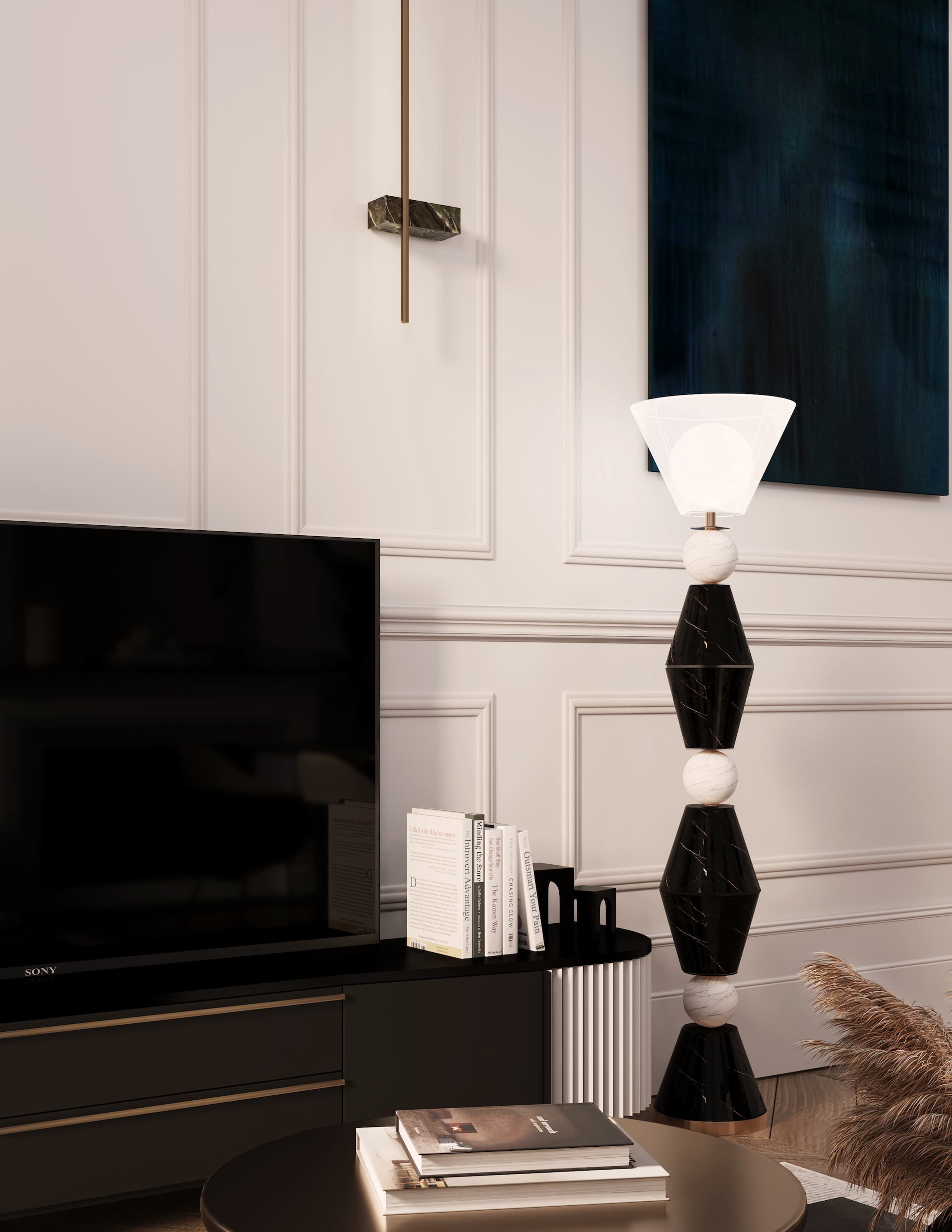 Appartamento neo classico a Londra con arredamento italiano moderno, uso di materiali come marmo, legno e metalli.
