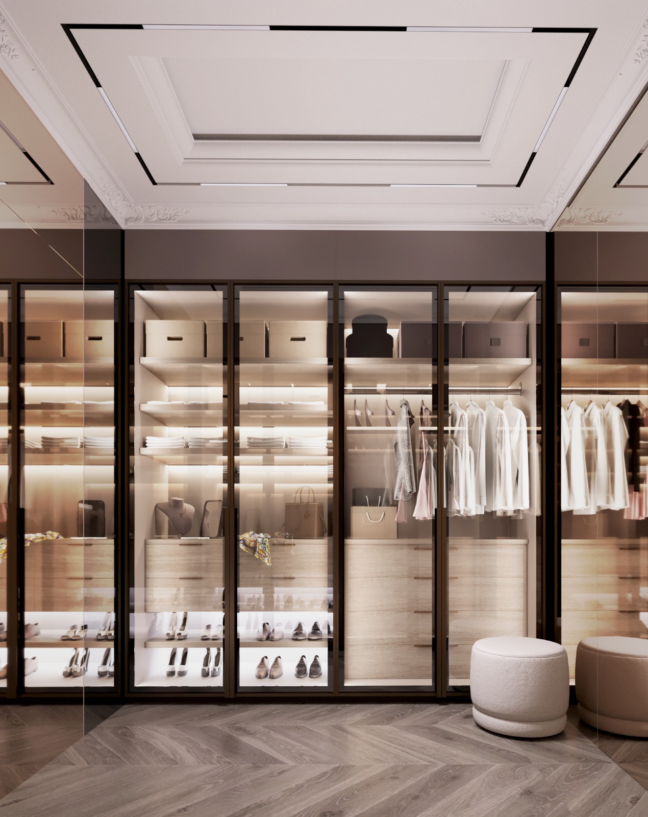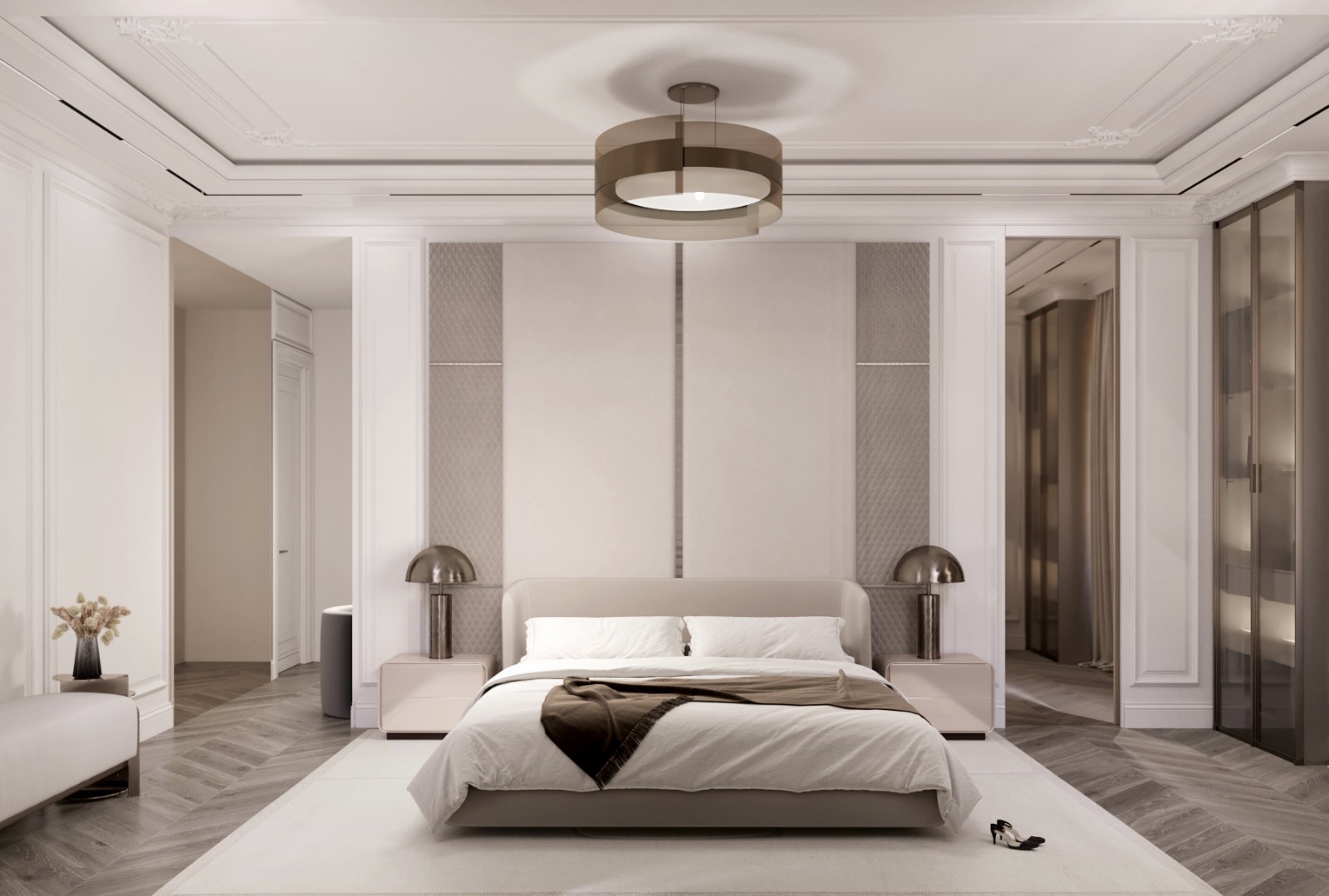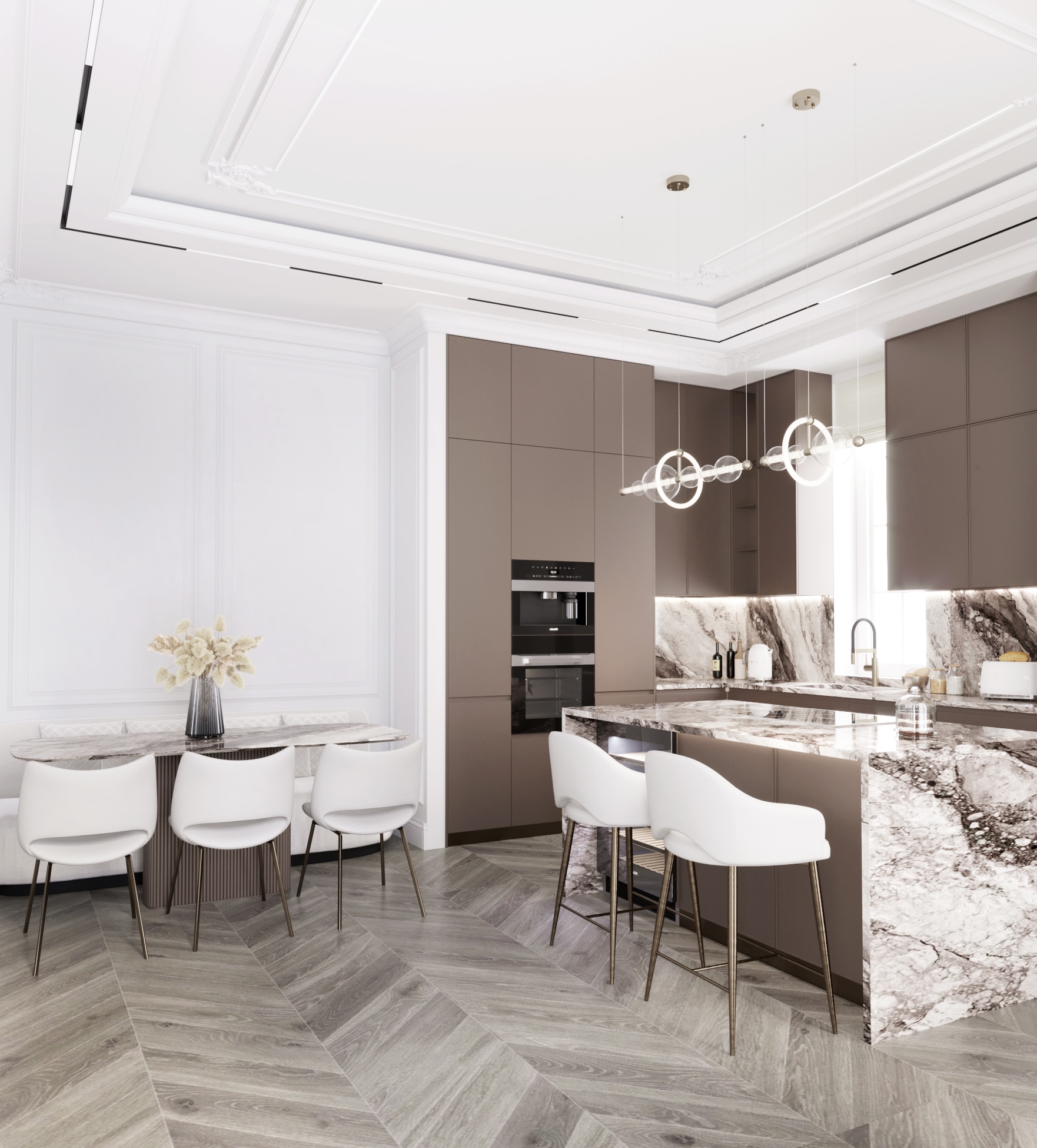 Casa di lusso contemporanea a Roma con arredamento moderno, boiserie alle pareti, soffitto decorato, uso di materiali come marmo, legno e specchi.