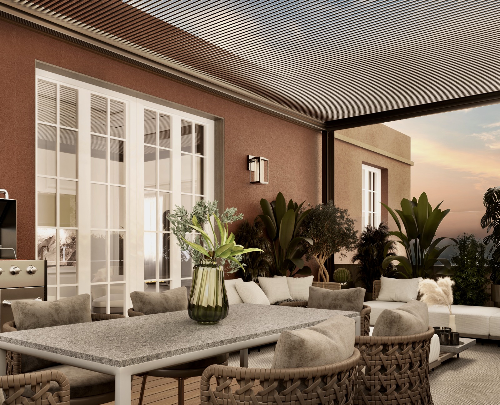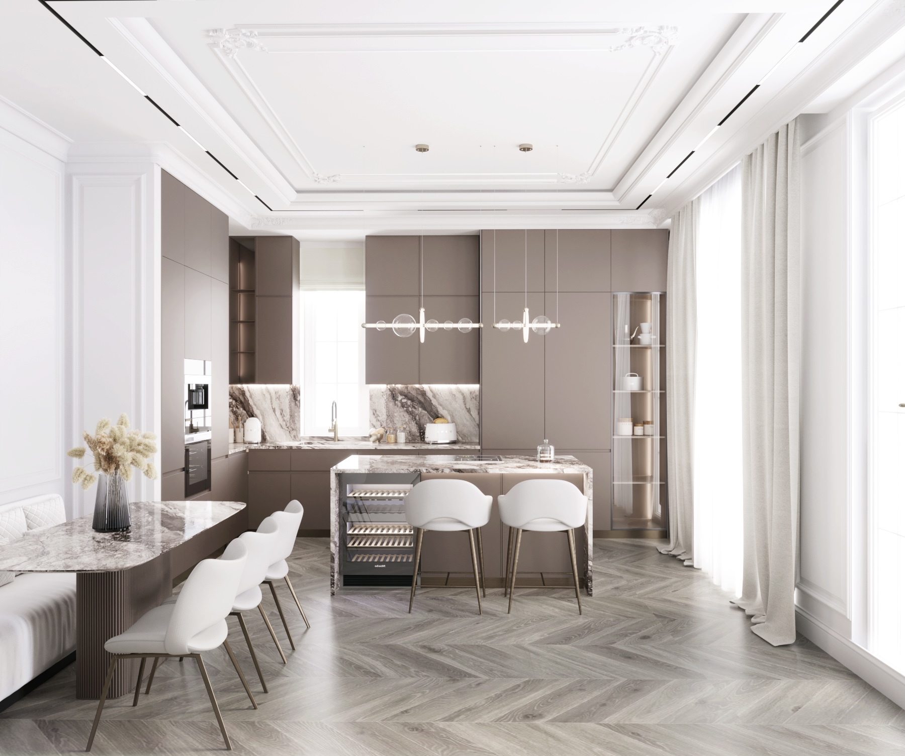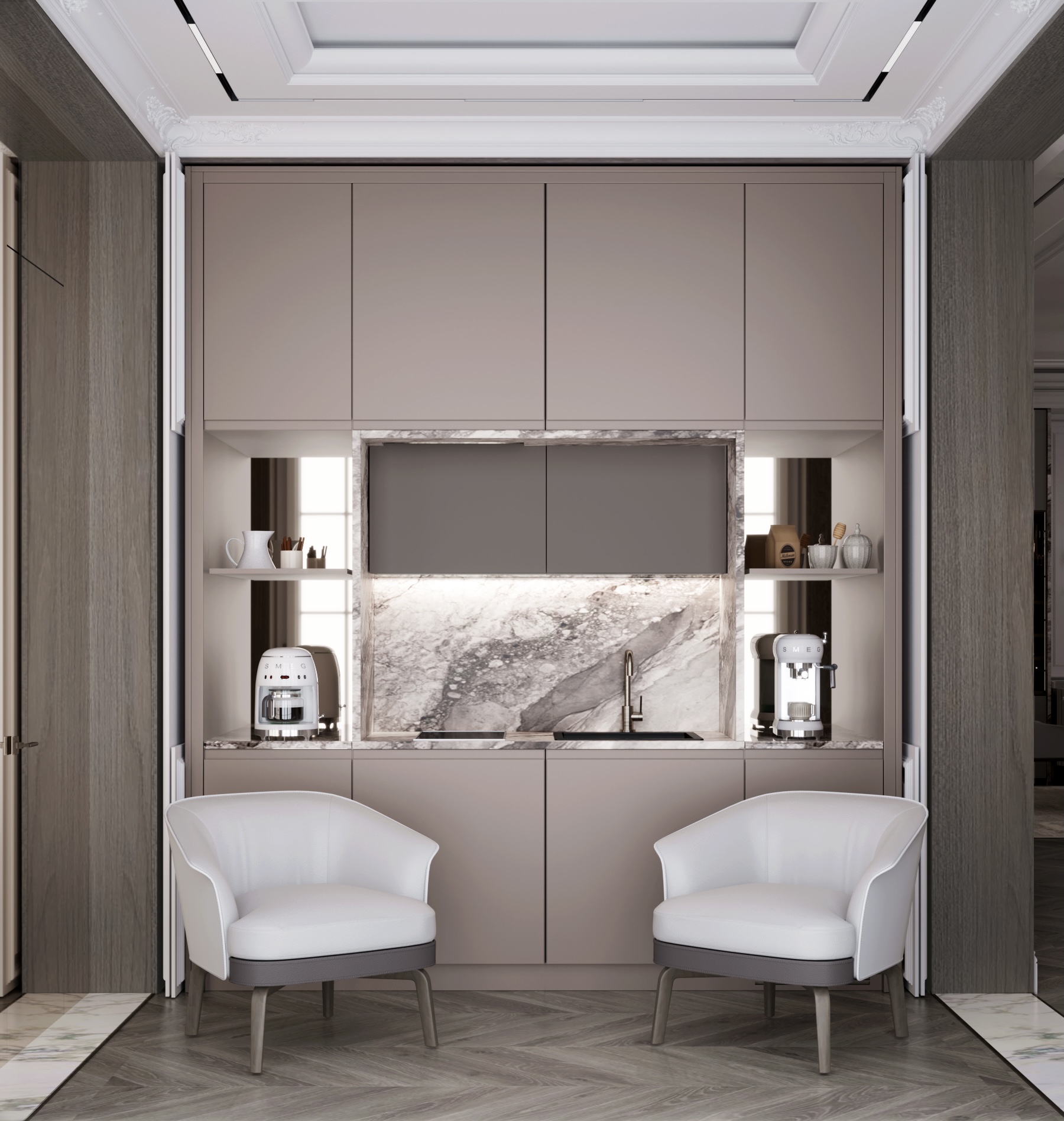 Casa di lusso contemporanea a Roma con arredamento moderno, boiserie alle pareti, soffitto decorato, uso di materiali come marmo, legno e specchi.