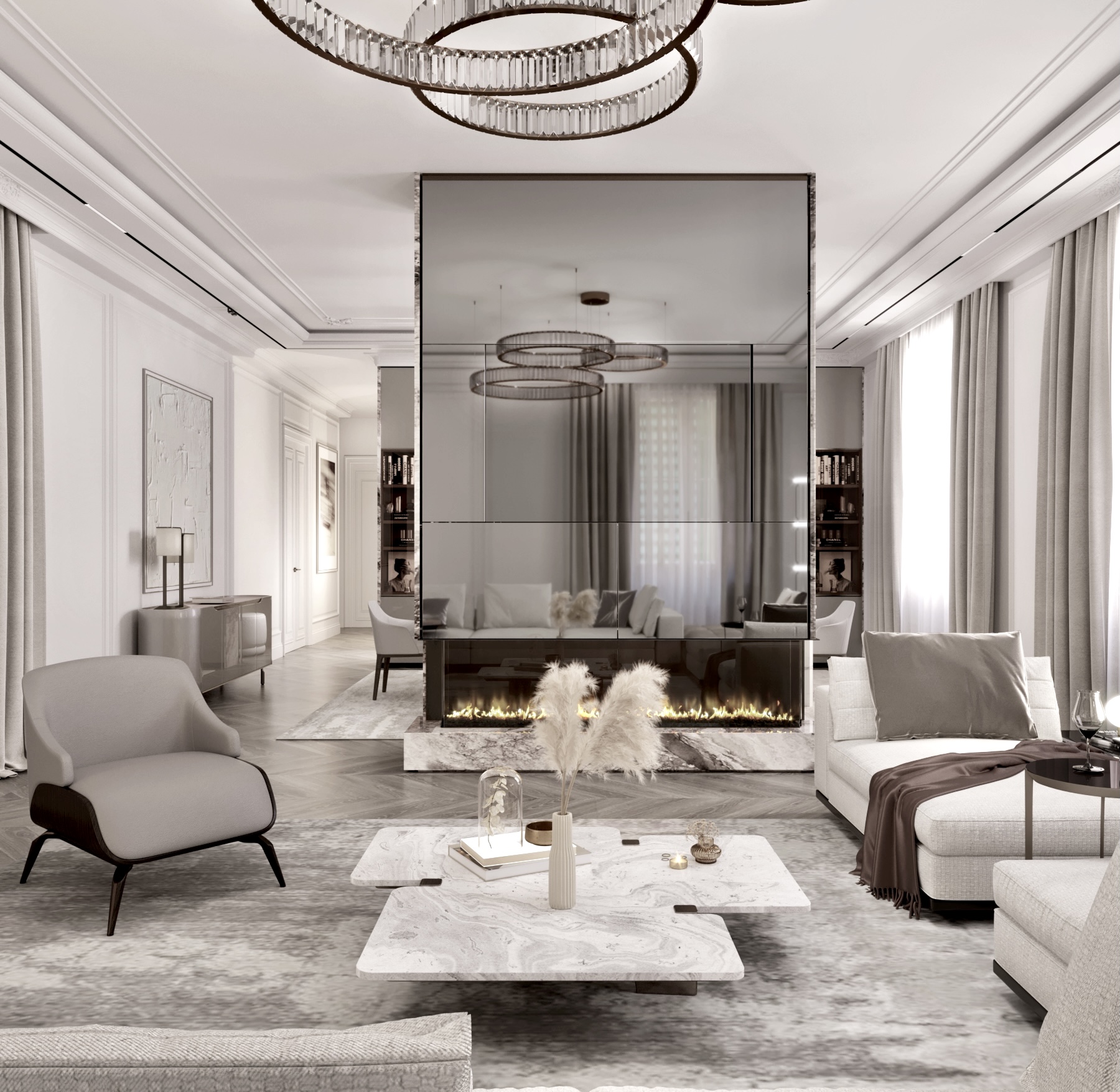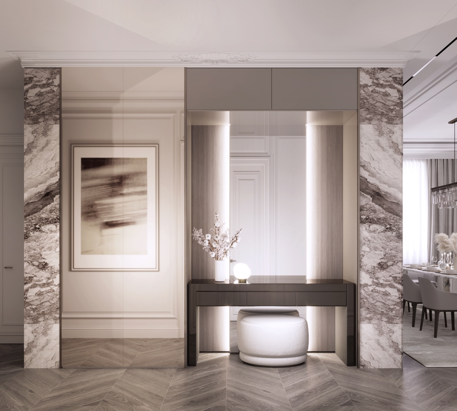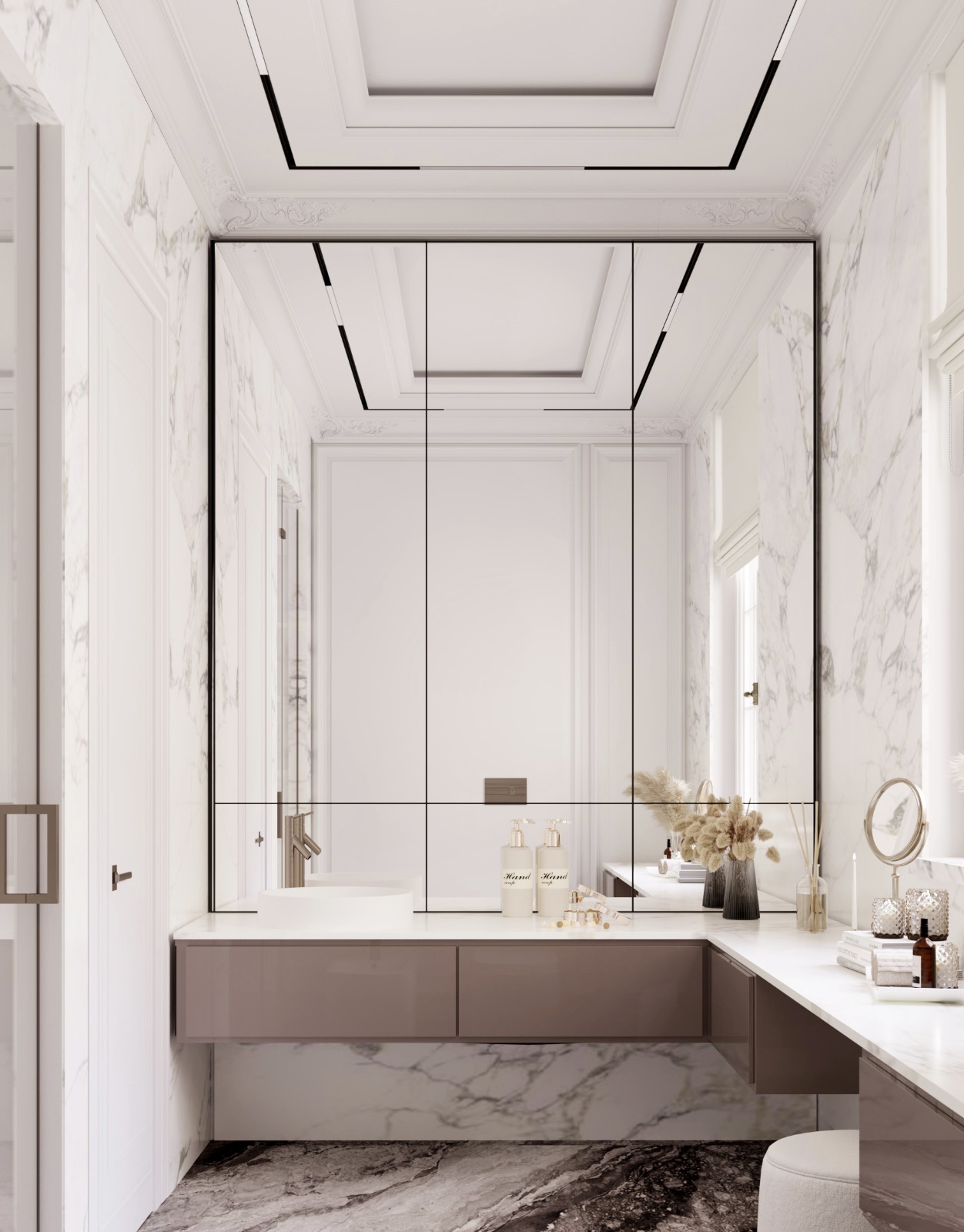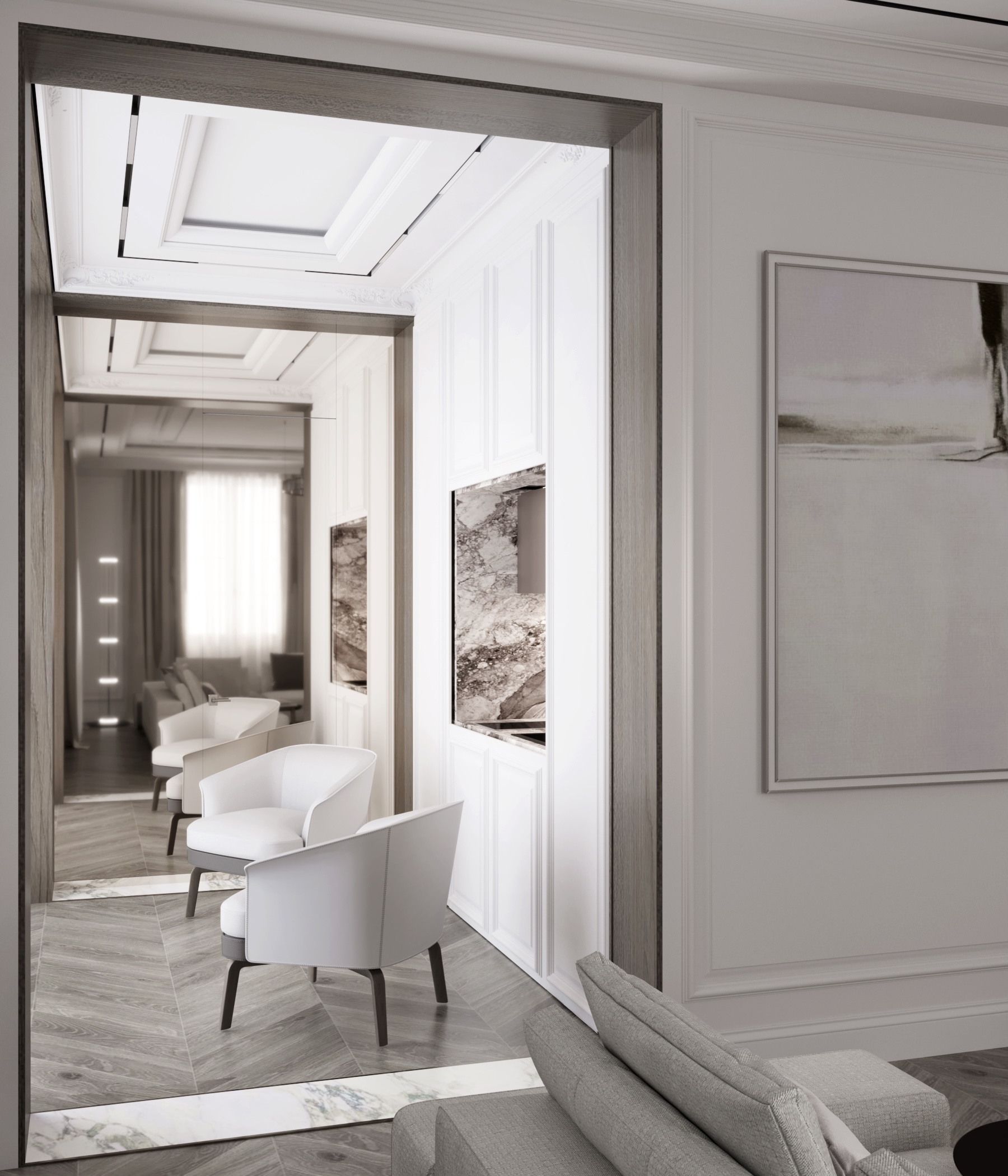 Contemporary luxury home in Rome using modern furniture, boiserie on the walls, decorated ceiling, use of materials such as marble, wood and mirrors.