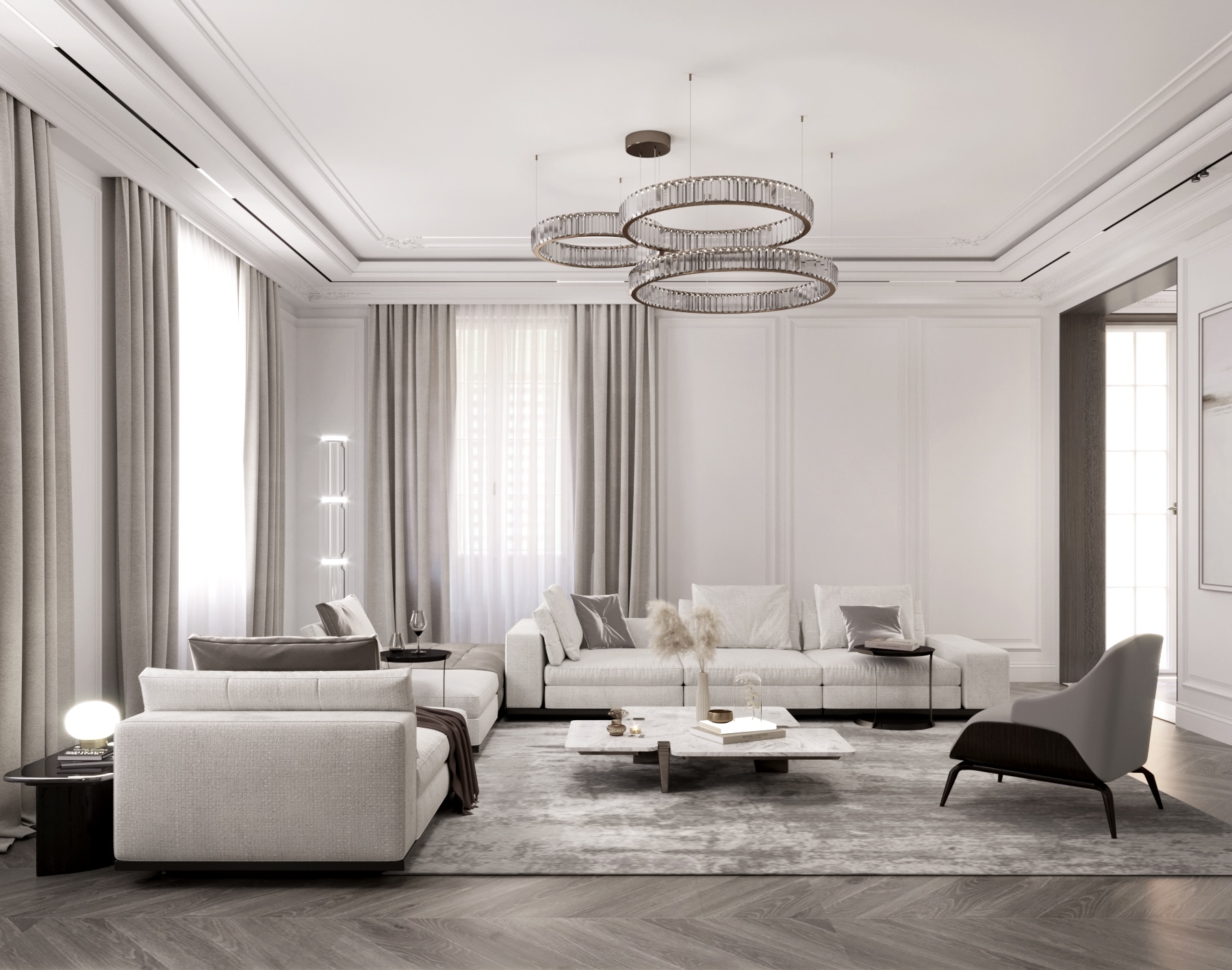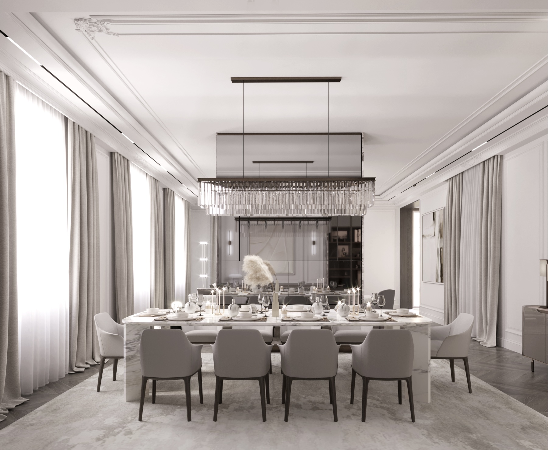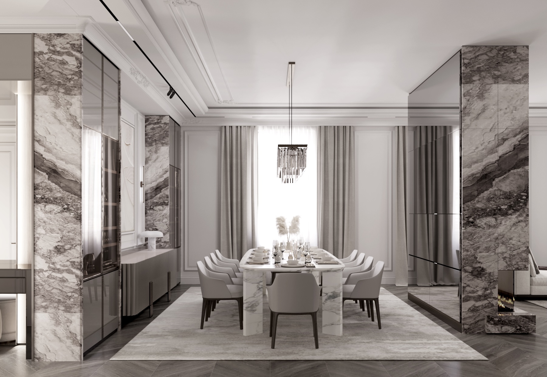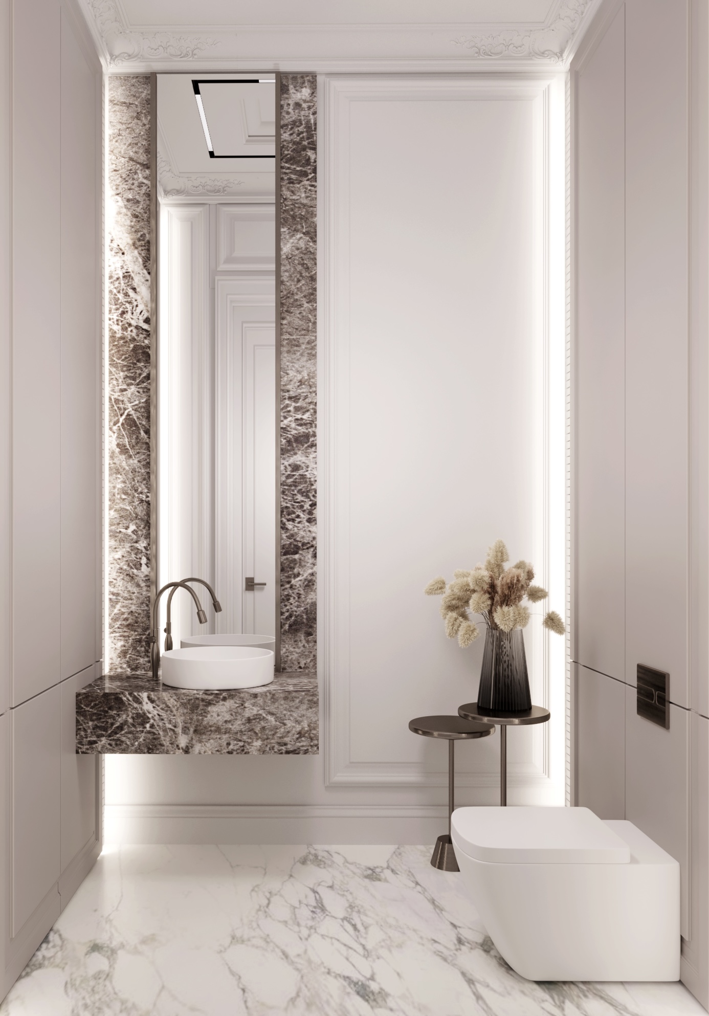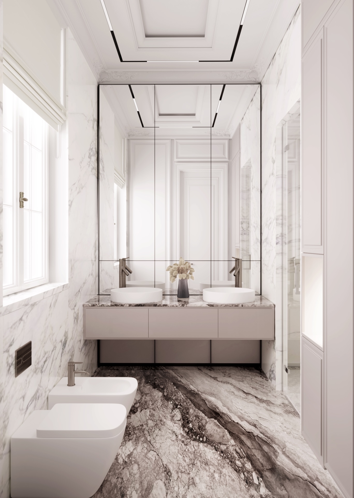 Contemporary luxury home in Rome using modern furniture, boiserie on the walls, decorated ceiling, use of materials such as marble, wood and mirrors.