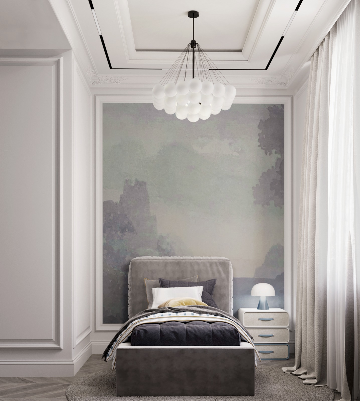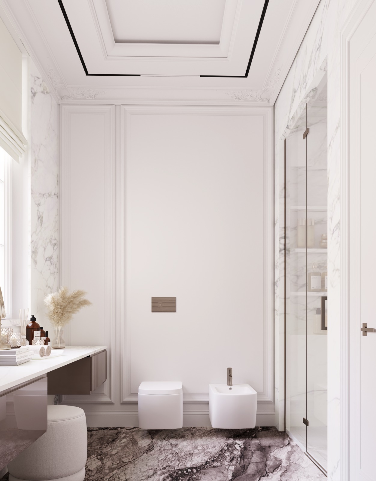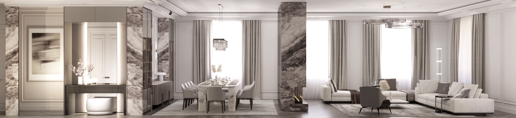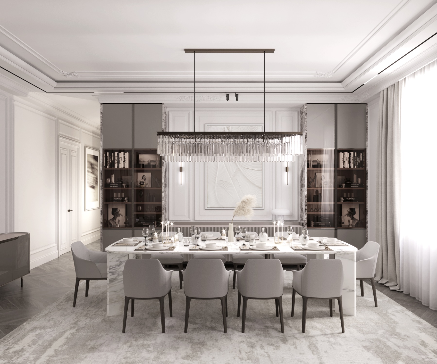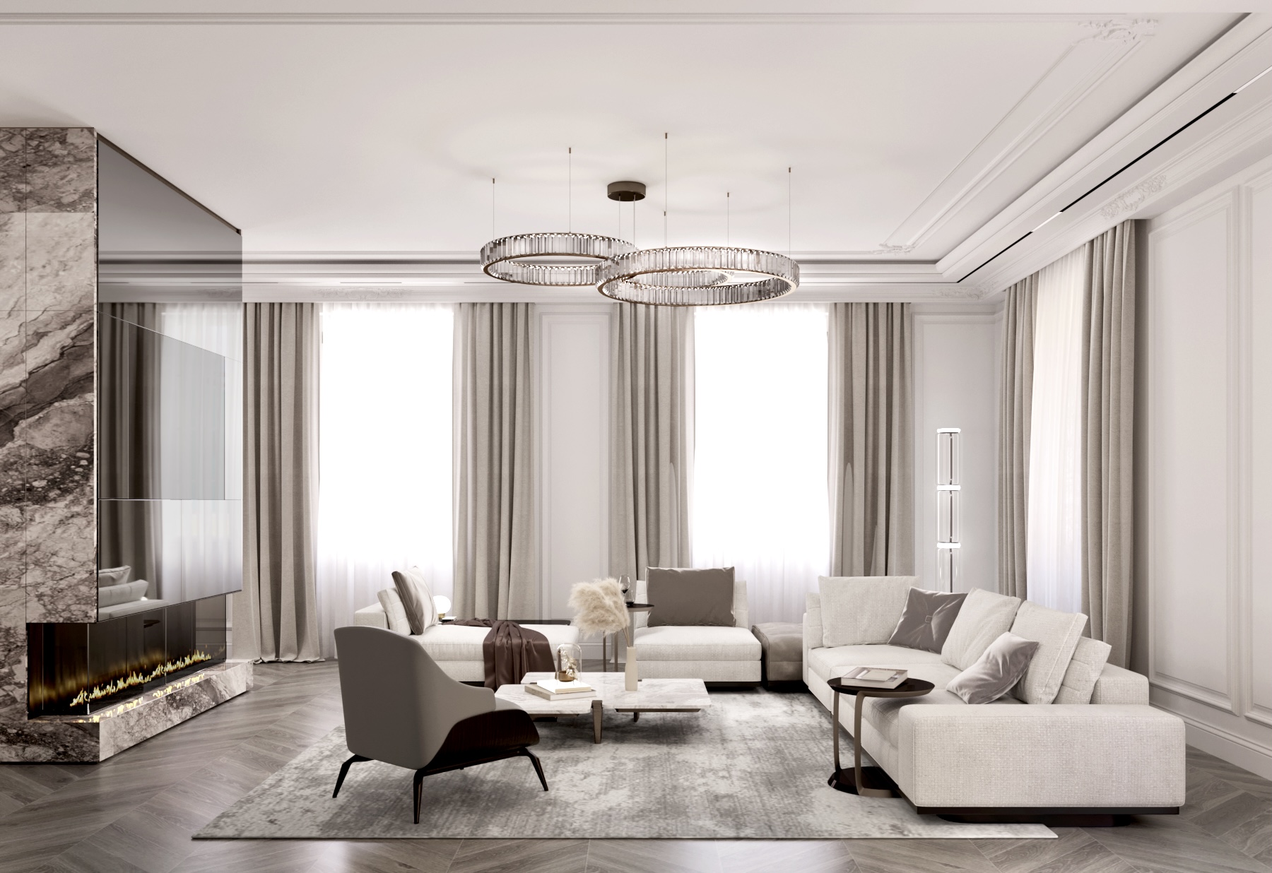 Contemporary luxury home in Rome using modern furniture, boiserie on the walls, decorated ceiling, use of materials such as marble, wood and mirrors.