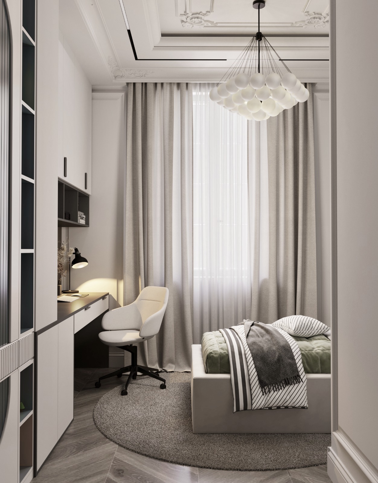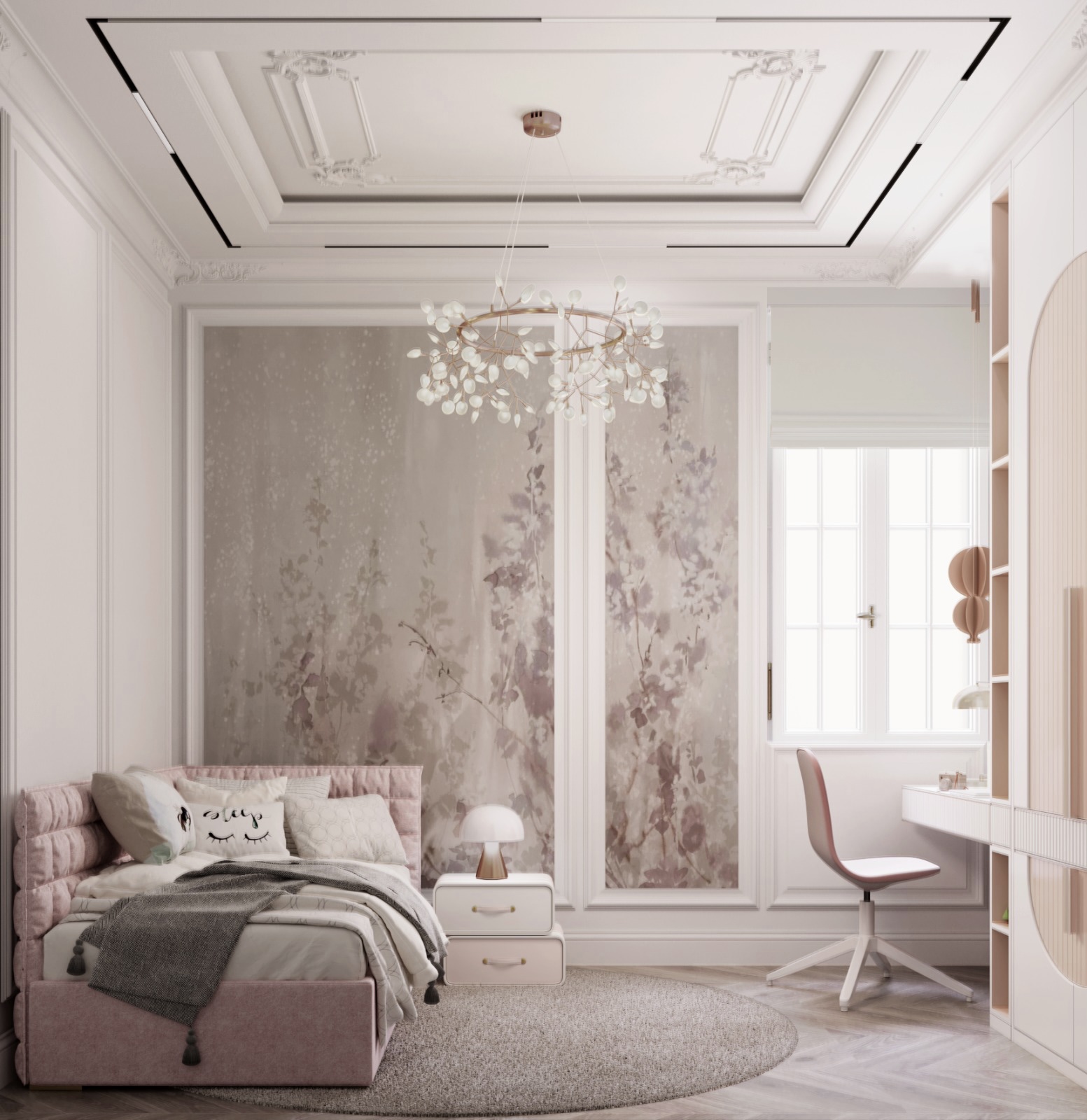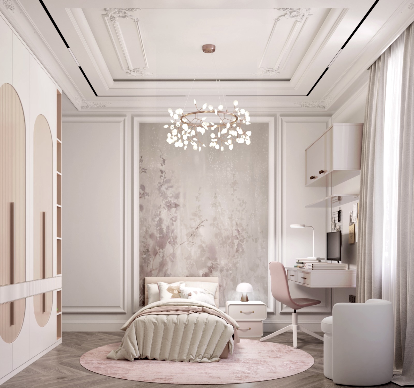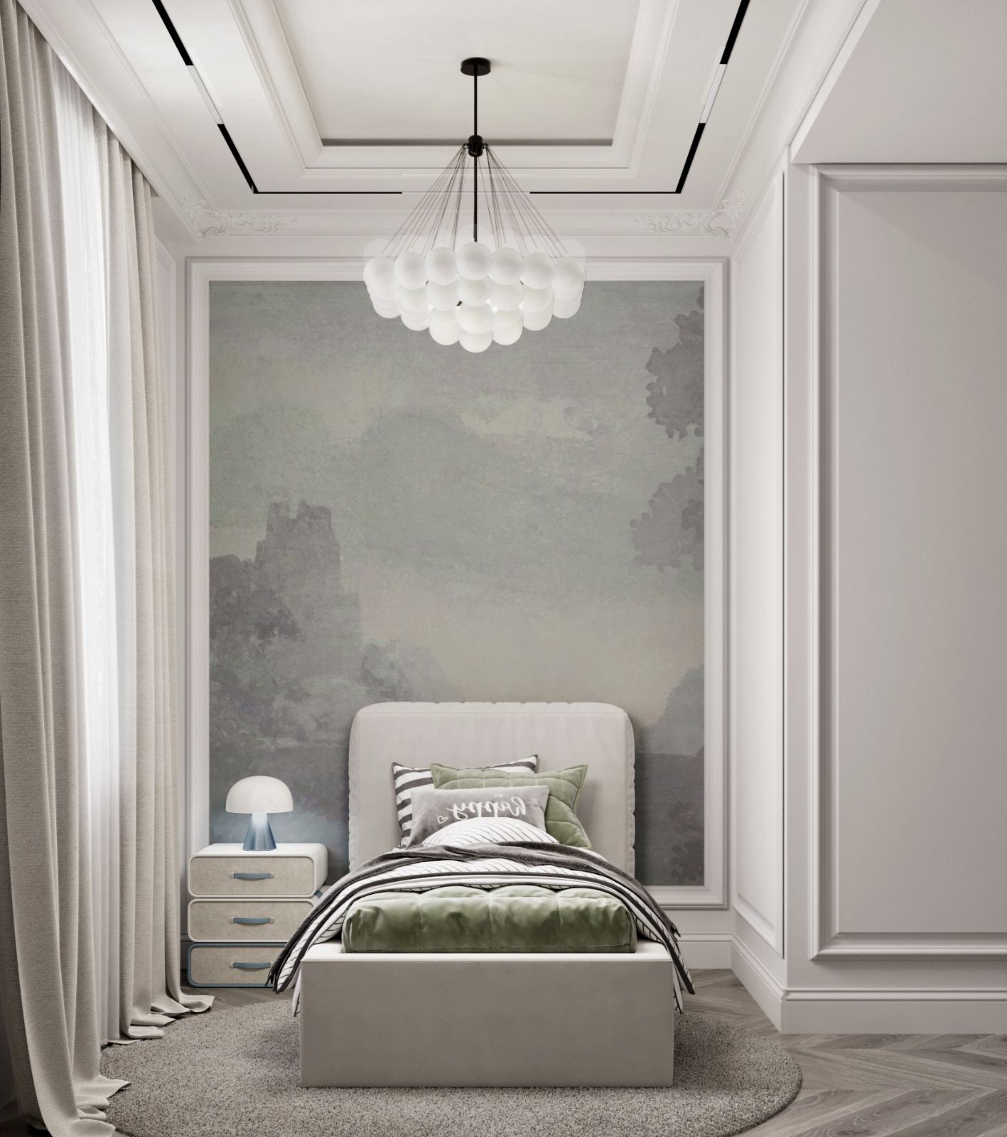 Contemporary luxury home in Rome using modern furniture, boiserie on the walls, decorated ceiling, use of materials such as marble, wood and mirrors.