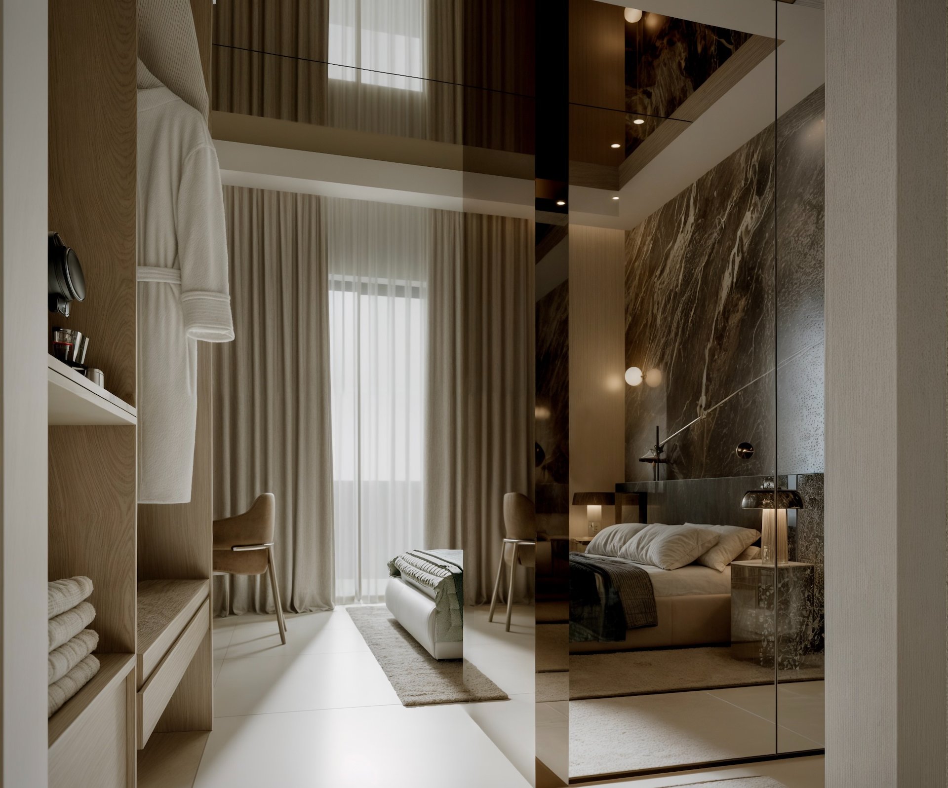 Linee contemporanee si fondono con materiali pregiati come marmo, legno, vetro bronzato e carte da parati materiche. La distribuzione ottimizza lo spazio mantenendo un’atmosfera intima e sofisticata, grazie a elementi su misura e a un’attenta progettazione della luce. Ogni dettaglio è pensato per raccontare il fascino di Roma con uno sguardo moderno, offrendo agli ospiti un soggiorno unico e memorabile.