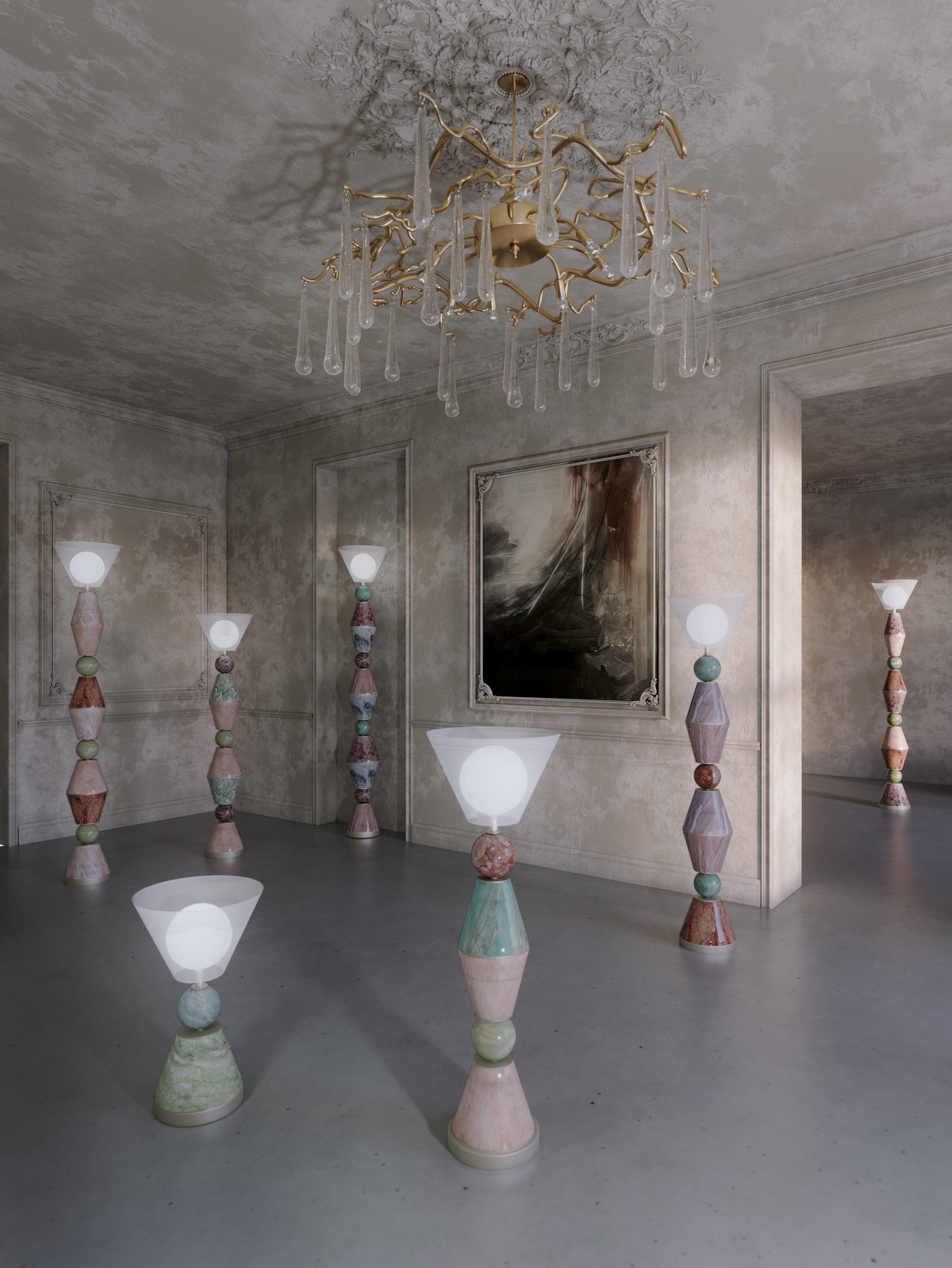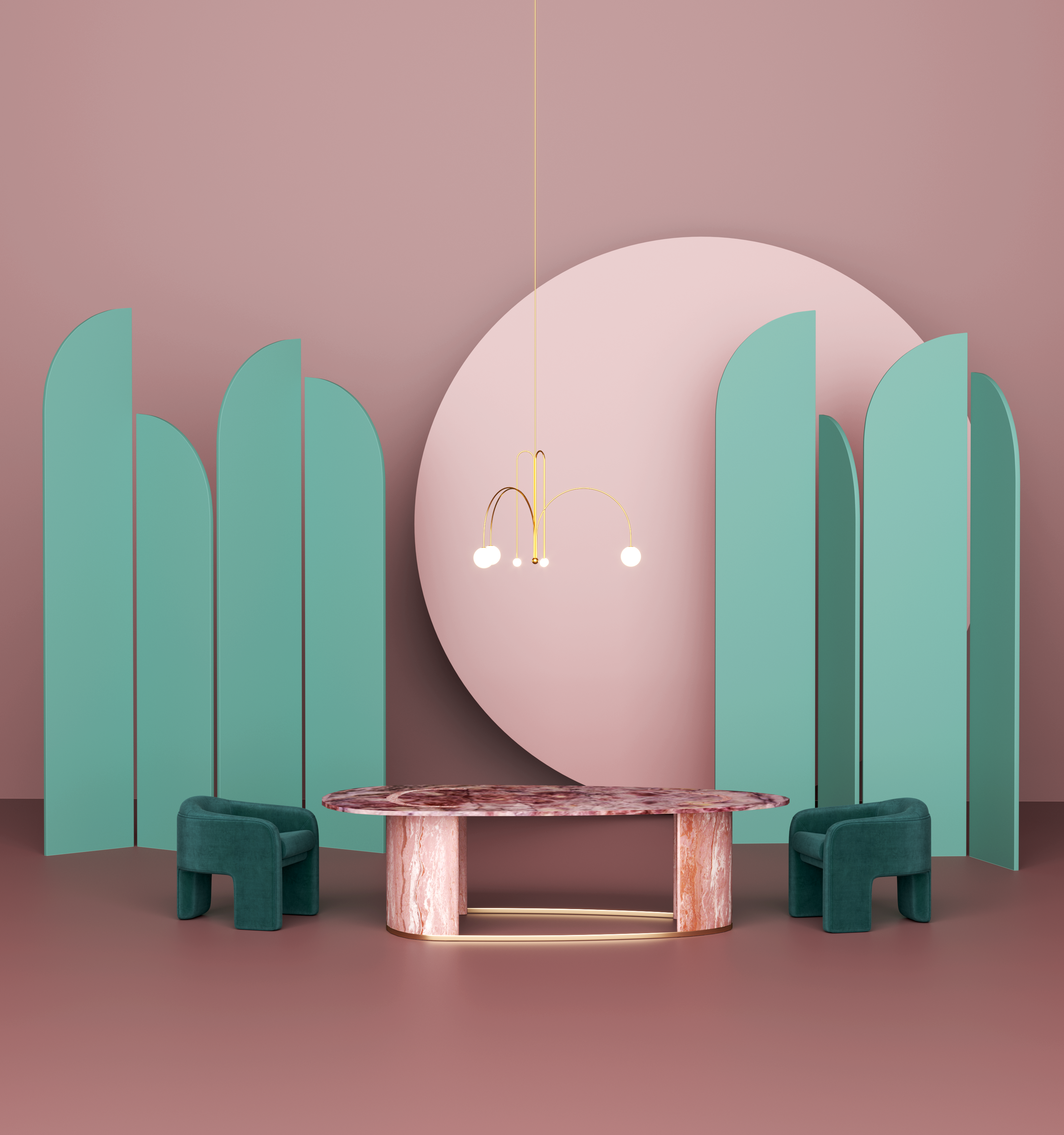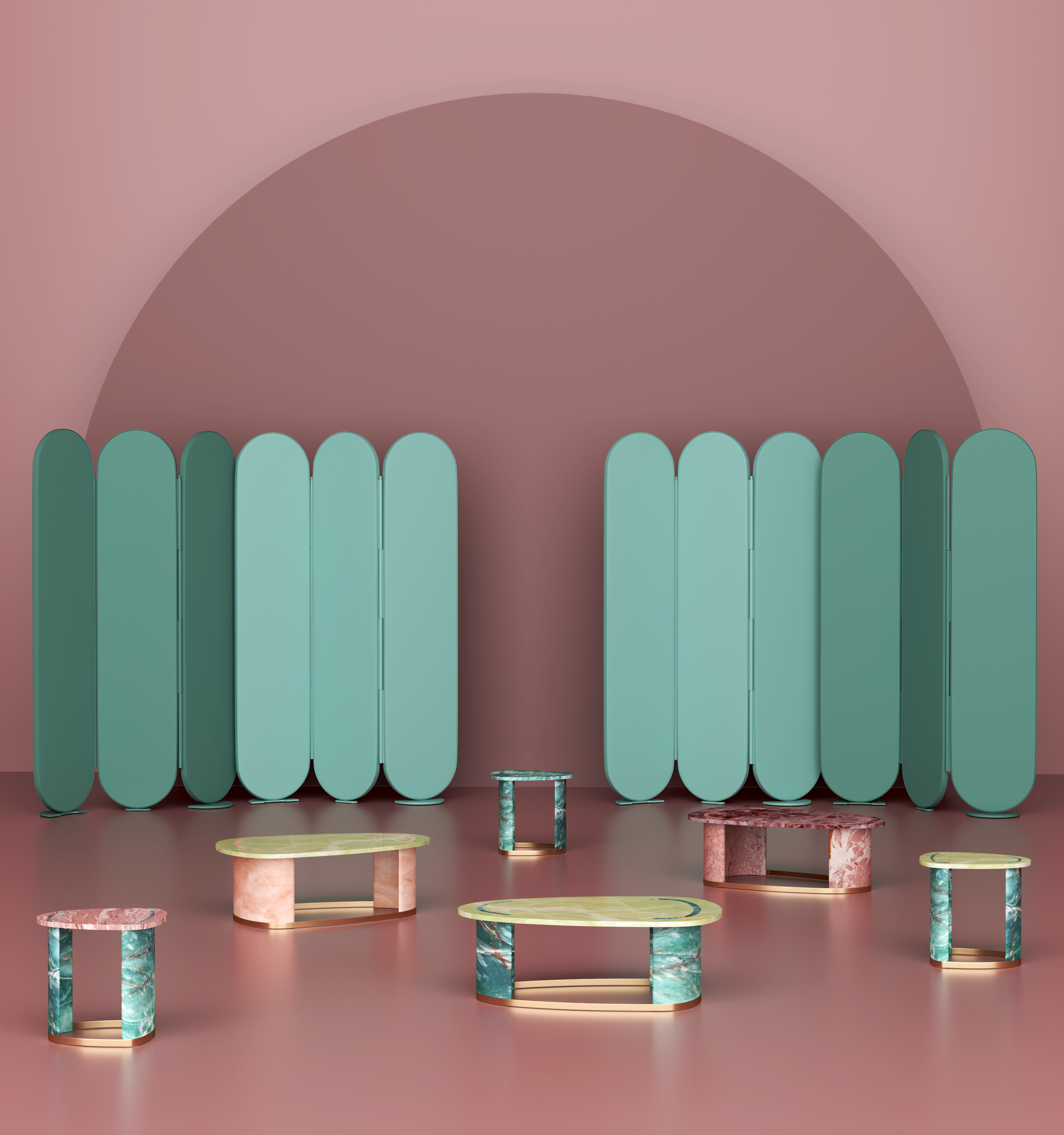 THIS COLLECTION IS CHAR ACTERIZED BY THE USE OF PRECIOUS AND COLORED MARBLES WITH WHICH STRONG CHROMATIC CONTR ASTS ARE CREATED. YOU CAN ALSO SEE UNUSUAL LINES, CURVES, IRREGULAR SHAPES, WITHOUT LOSING THE ELEGANCE OF THE LINES BUT GIVING, INSTEAD, A MAGICAL TOUCH THANKS TO THE COLORS OF THESE PRECIOUS MARBLES.