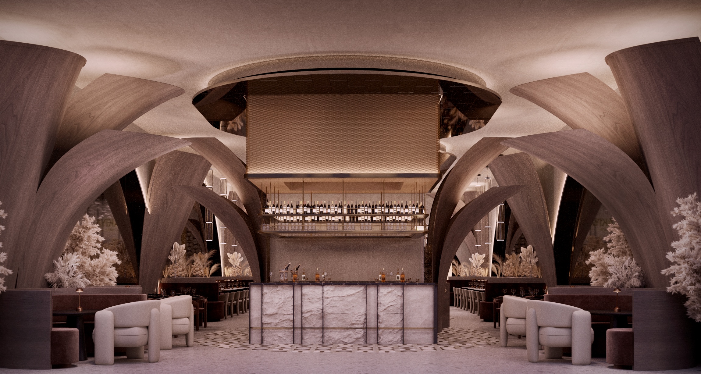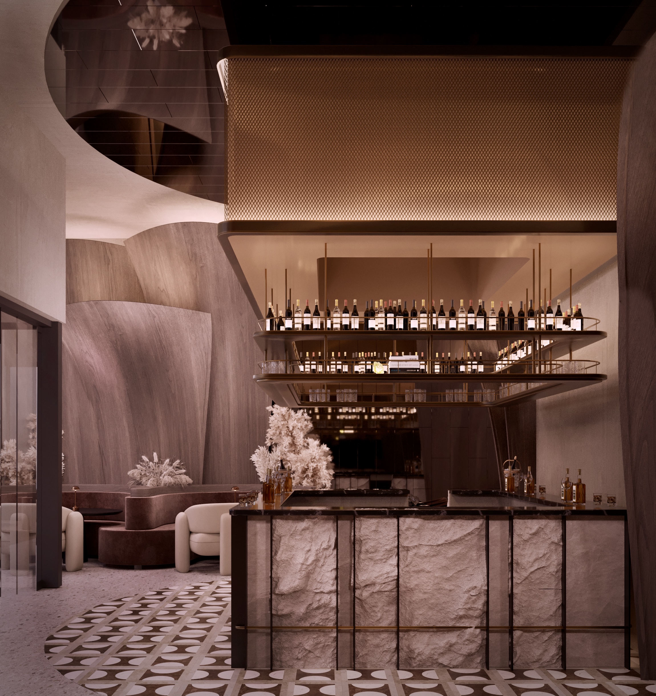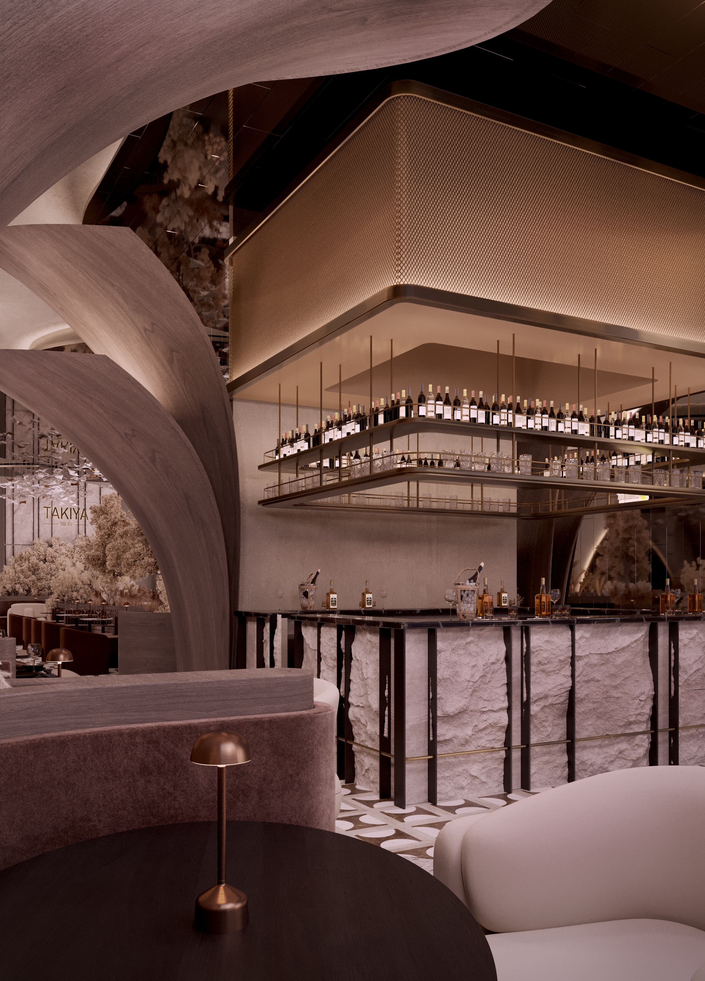 detail — from the curved seating arrangements to the illuminated bar carved in rough stone — is conceived to celebrate craftsmanship, sophistication, and the timeless artistry of Japanese culture.