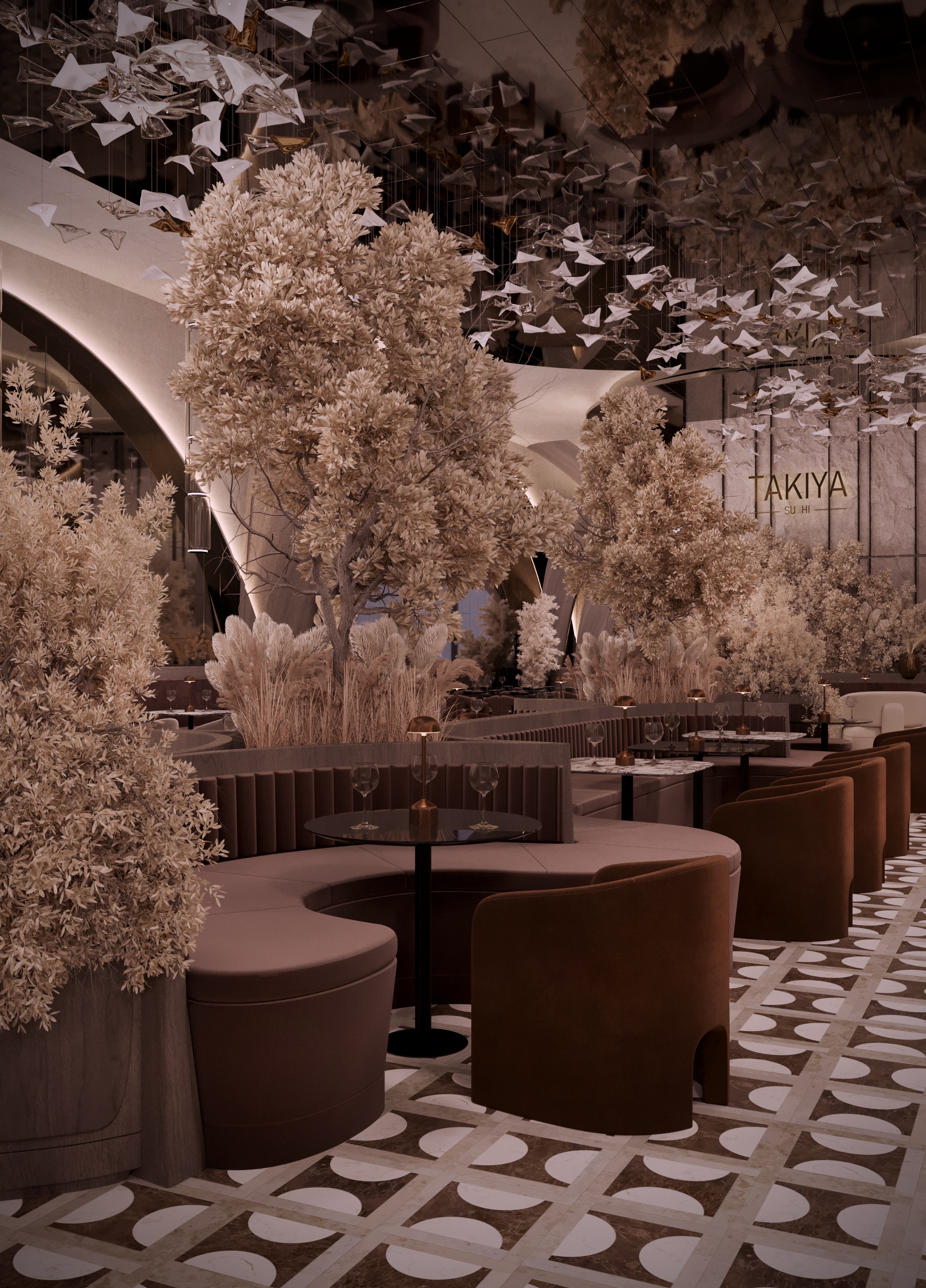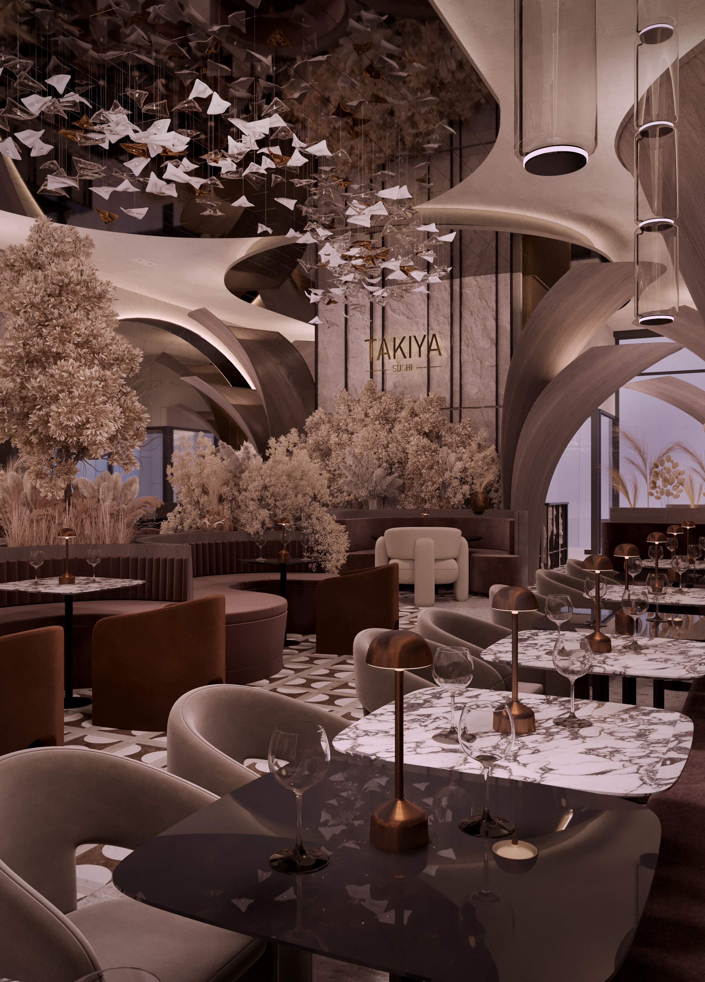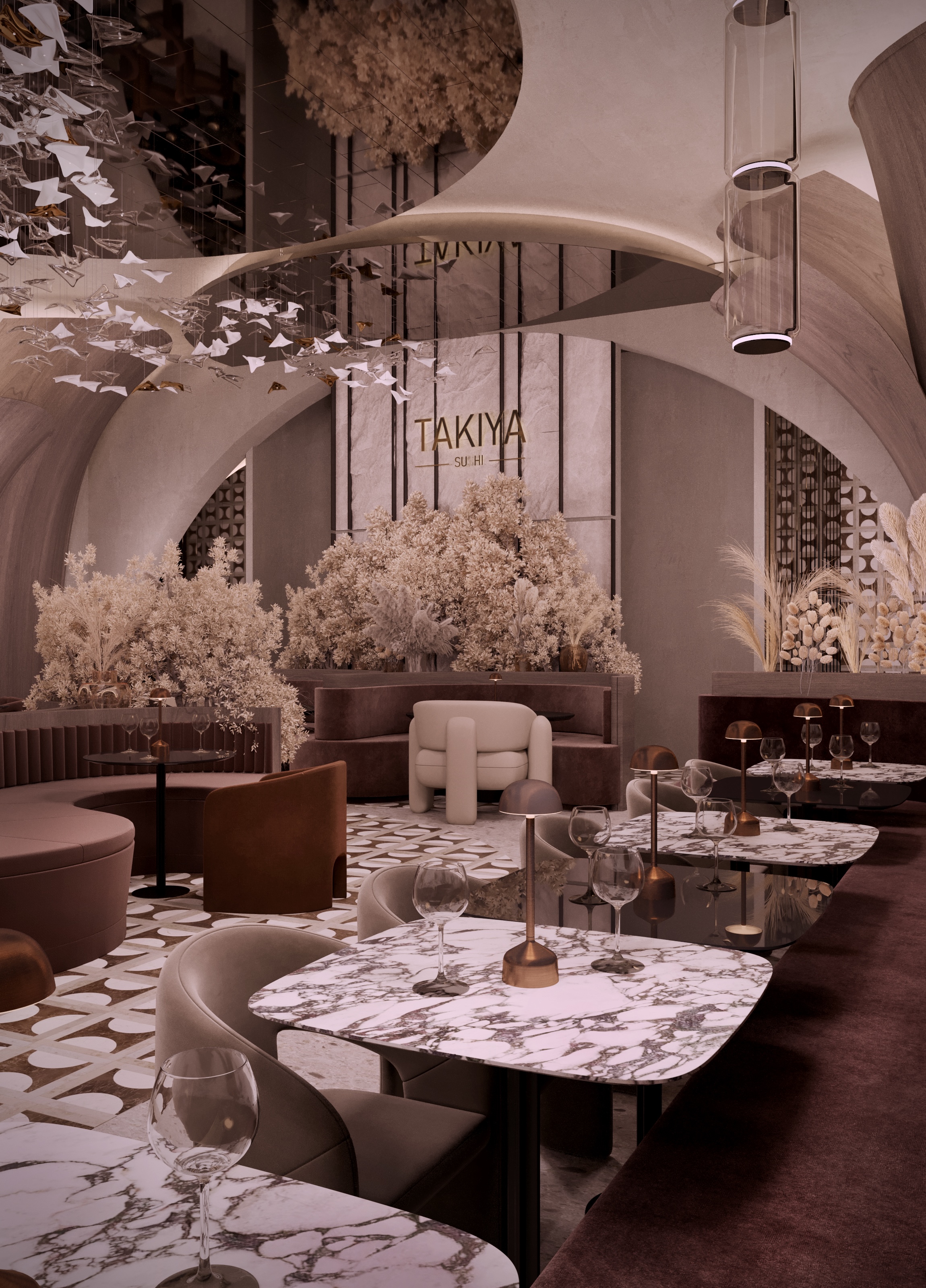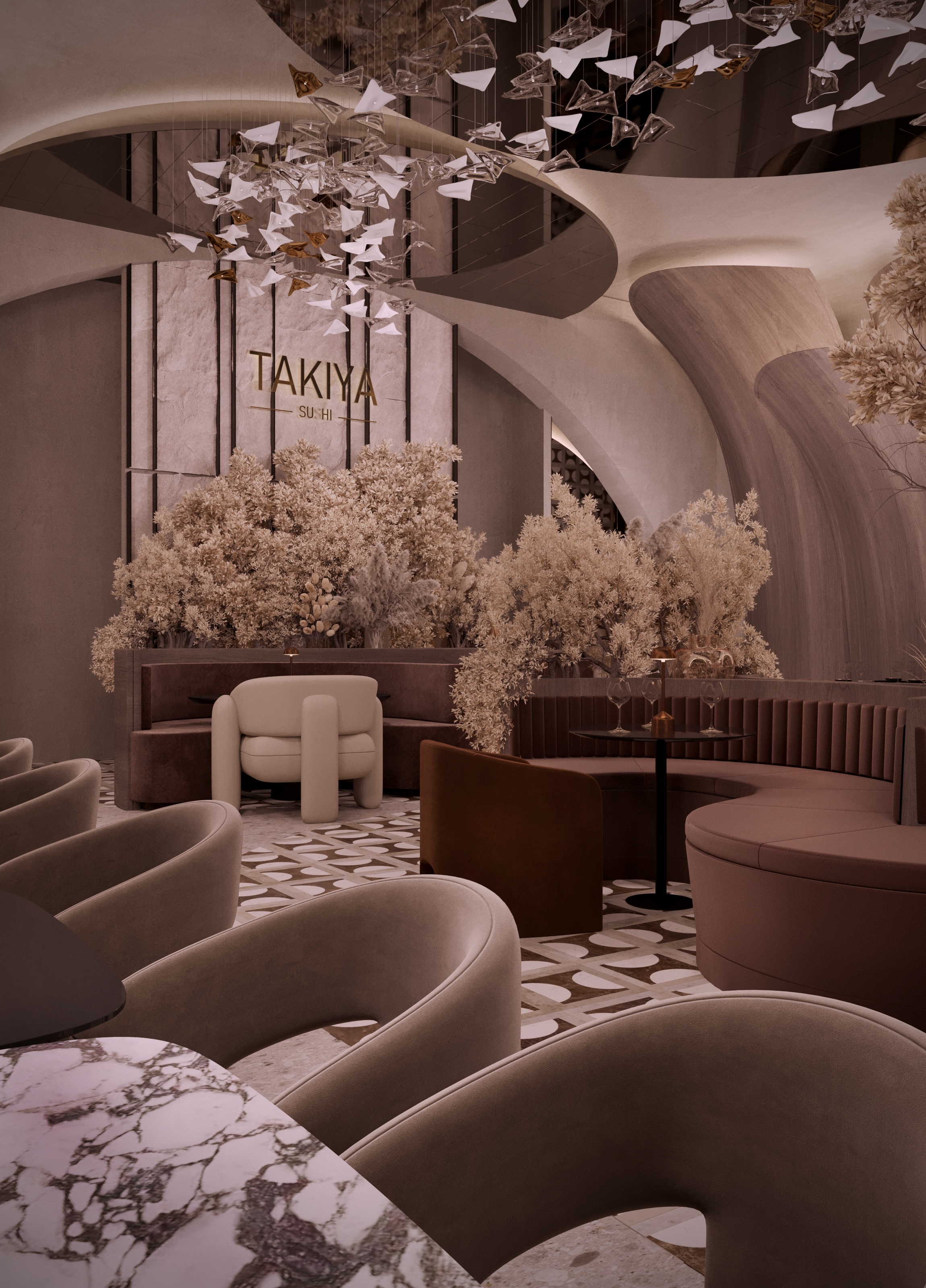 Takiya ridefinisce il concetto di ristorante giapponese contemporaneo attraverso un’atmosfera che fonde forme architettoniche fluide, materiali tattili e una scenografia luminosa dal carattere teatrale.