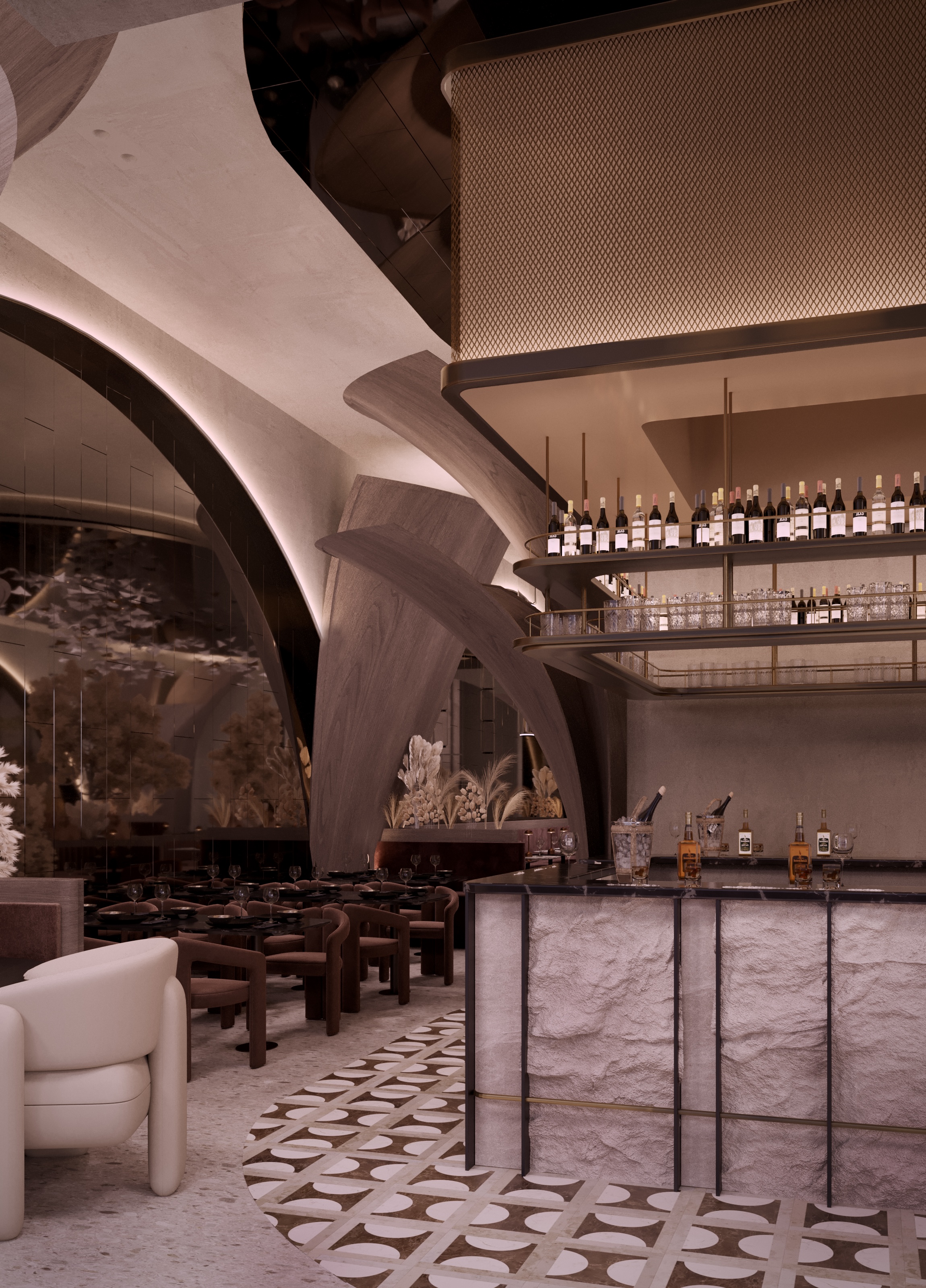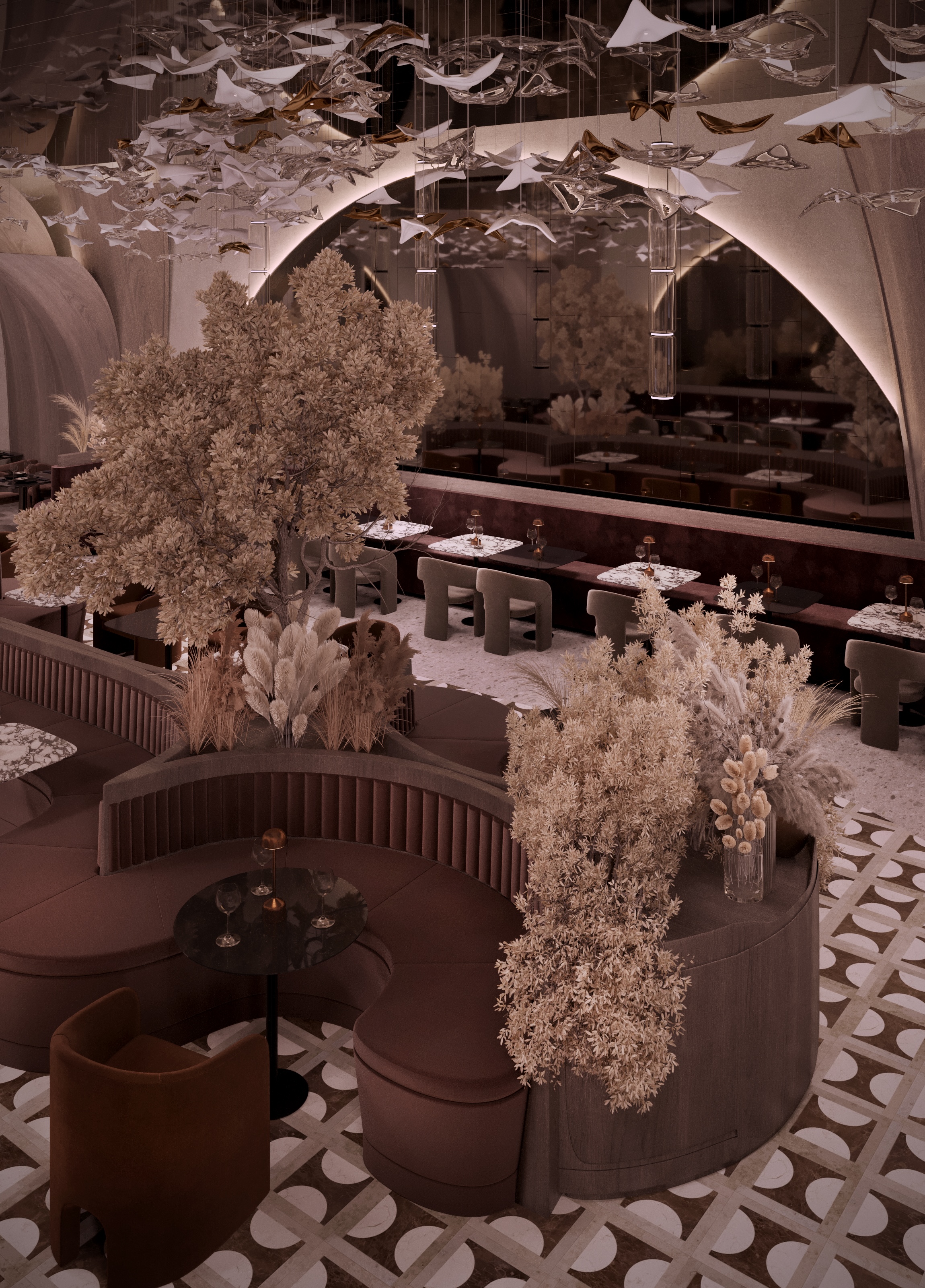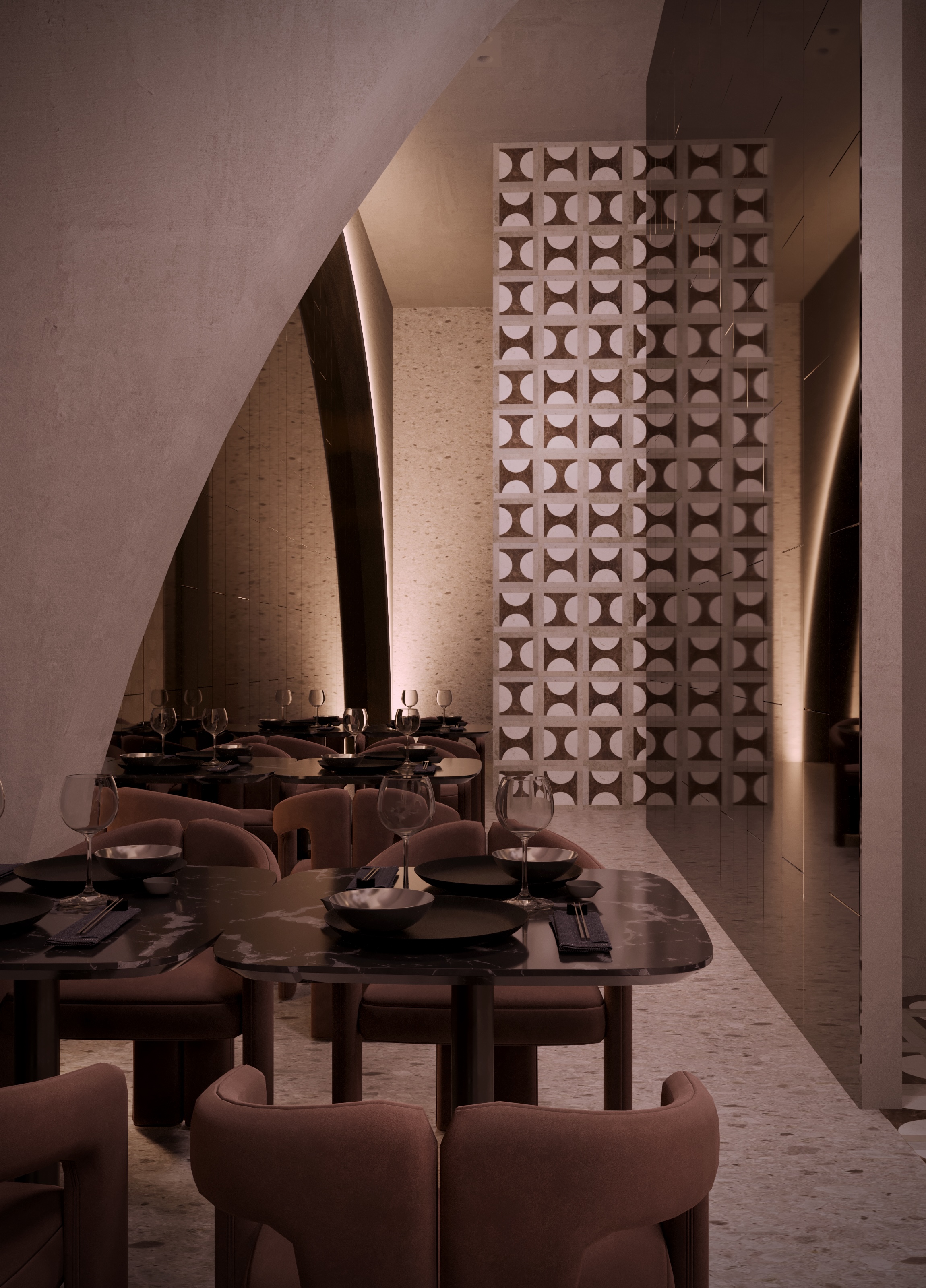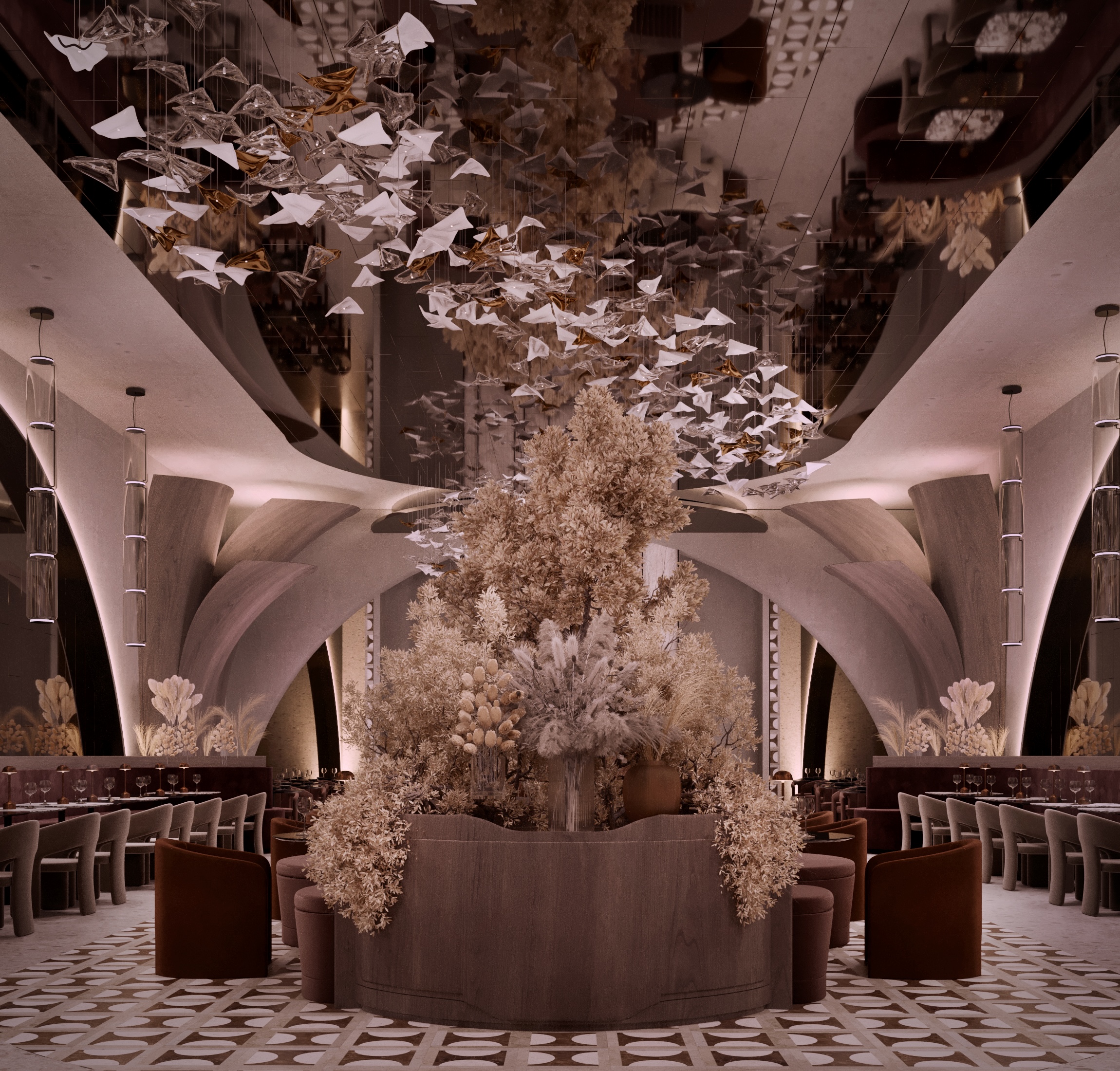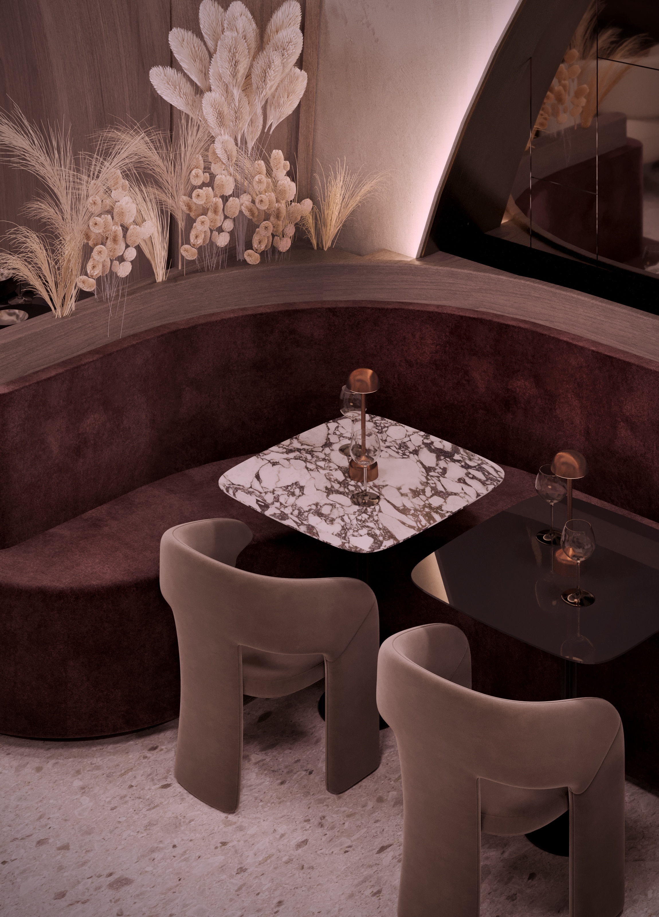 Warm earthy tones, textured stone, and velvet upholstery create a refined yet sensorial ambience. Floral compositions of dried botanicals and golden lighting reflections enhance the depth and drama of the interior, inviting guests to experience a journey through material and emotion.