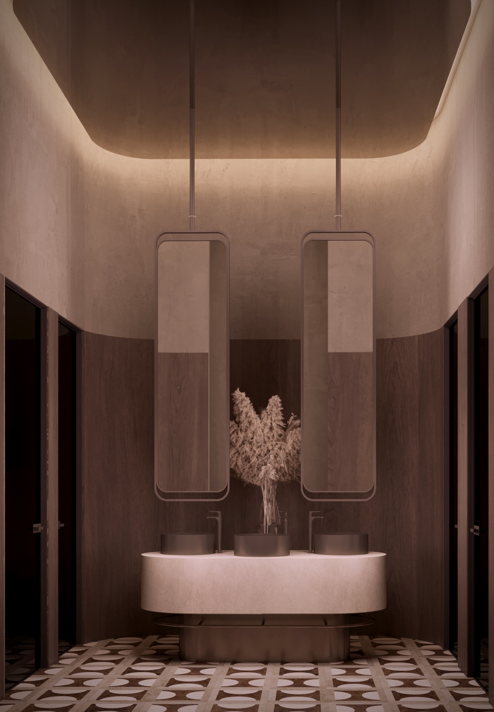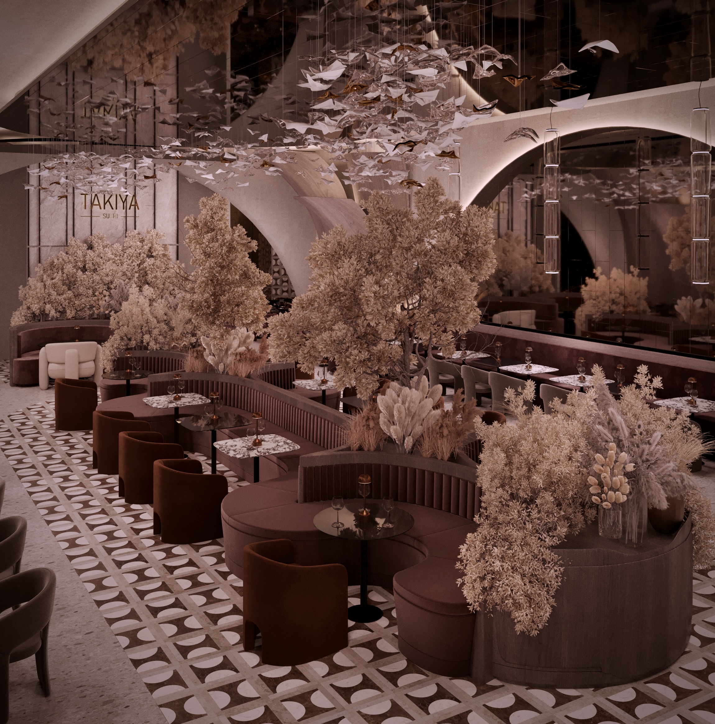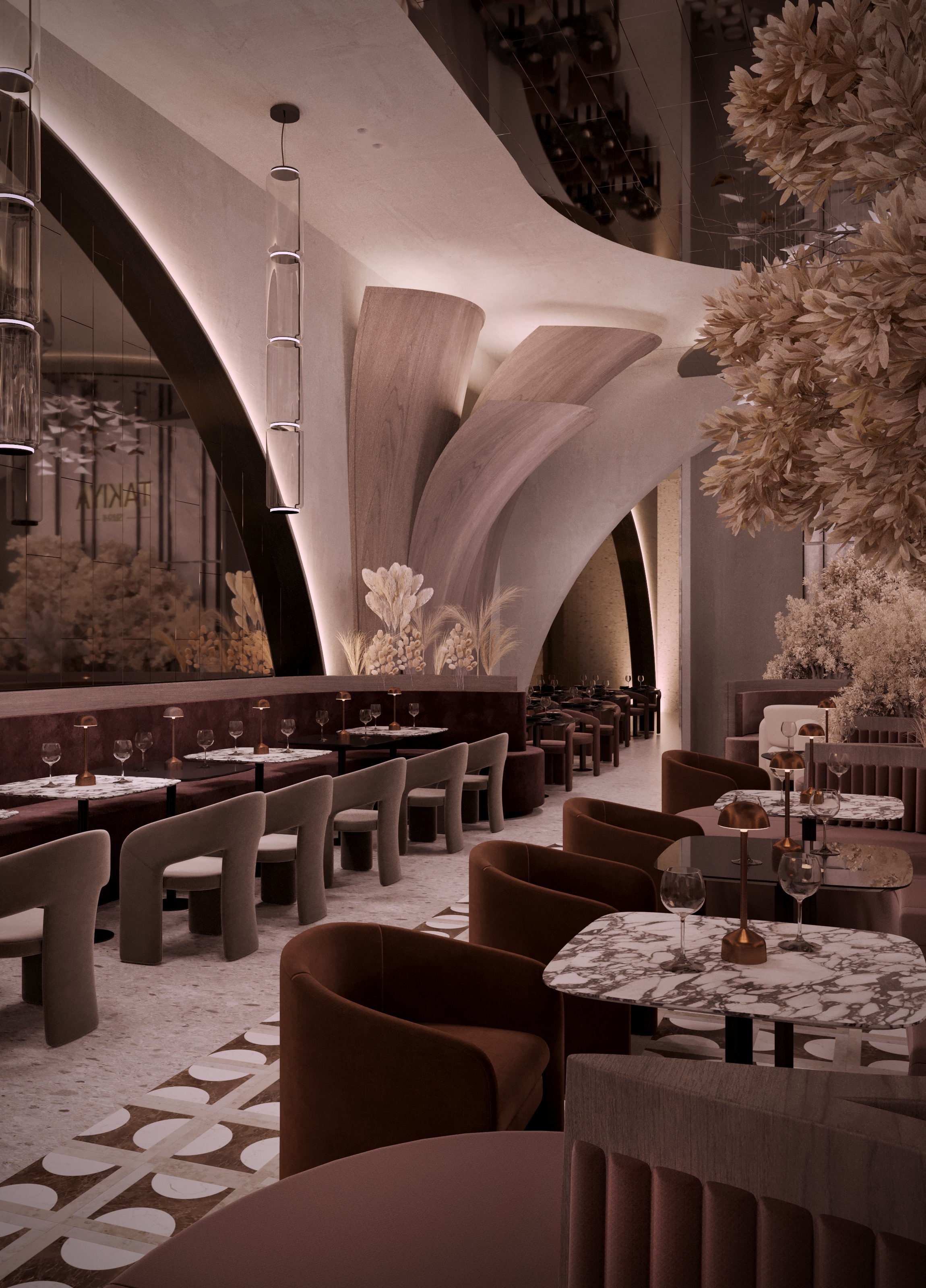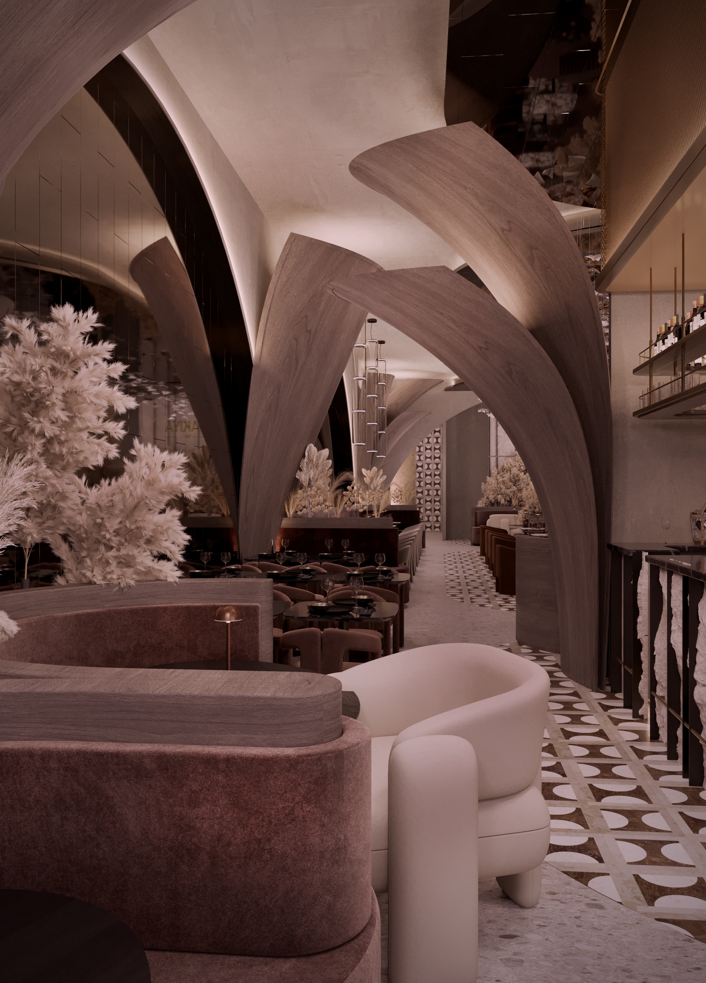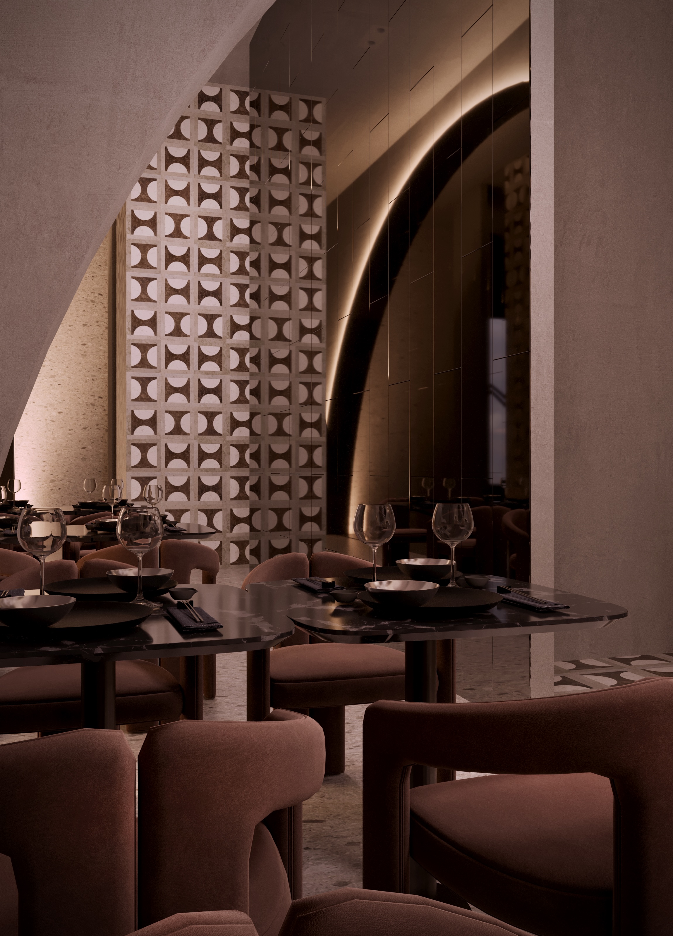 Warm earthy tones, textured stone, and velvet upholstery create a refined yet sensorial ambience. Floral compositions of dried botanicals and golden lighting reflections enhance the depth and drama of the interior, inviting guests to experience a journey through material and emotion.