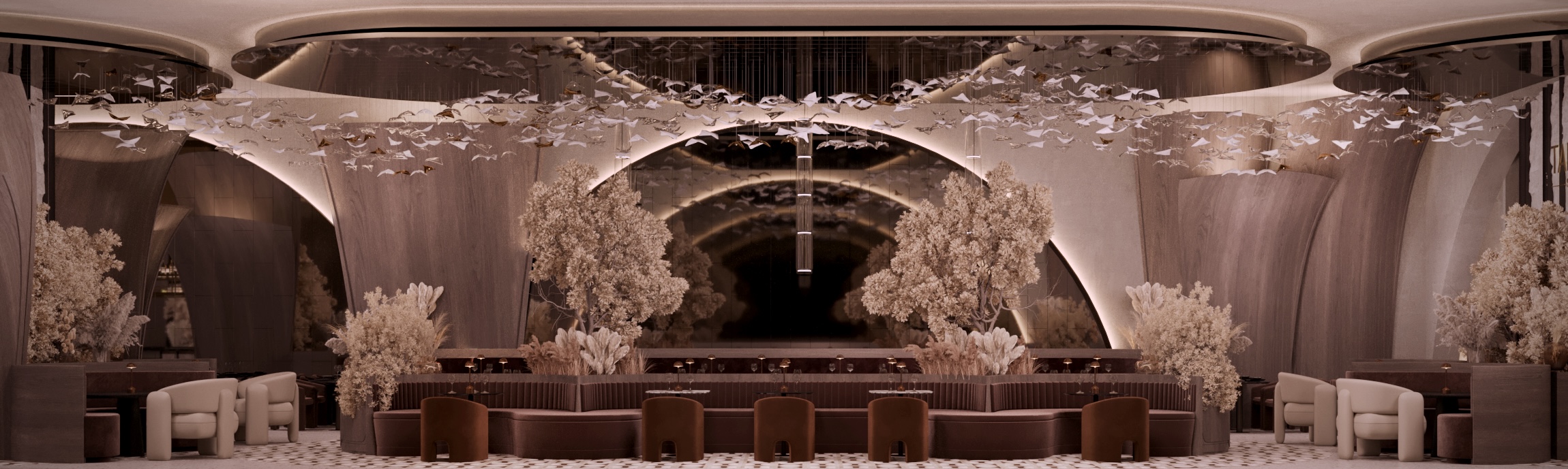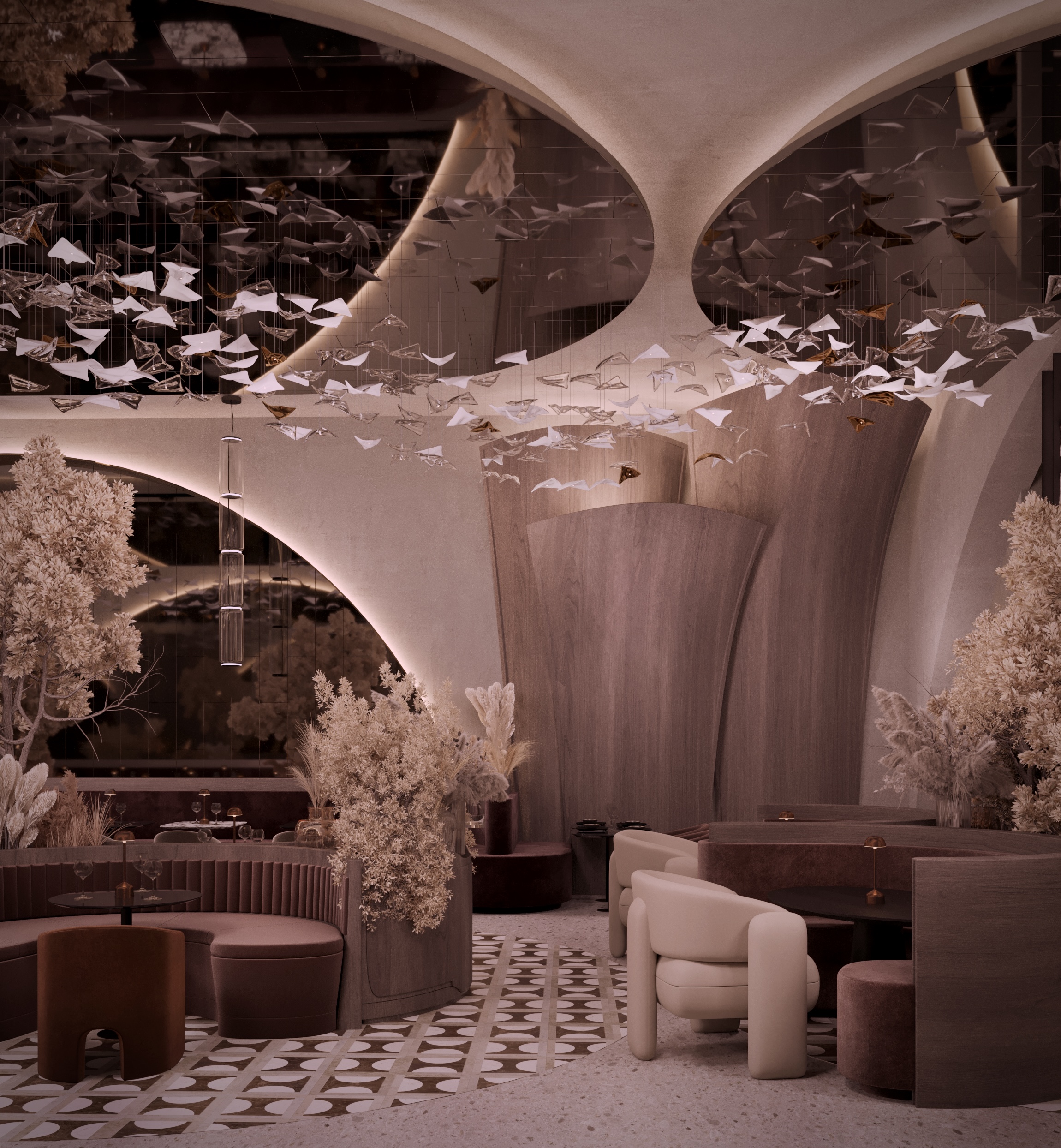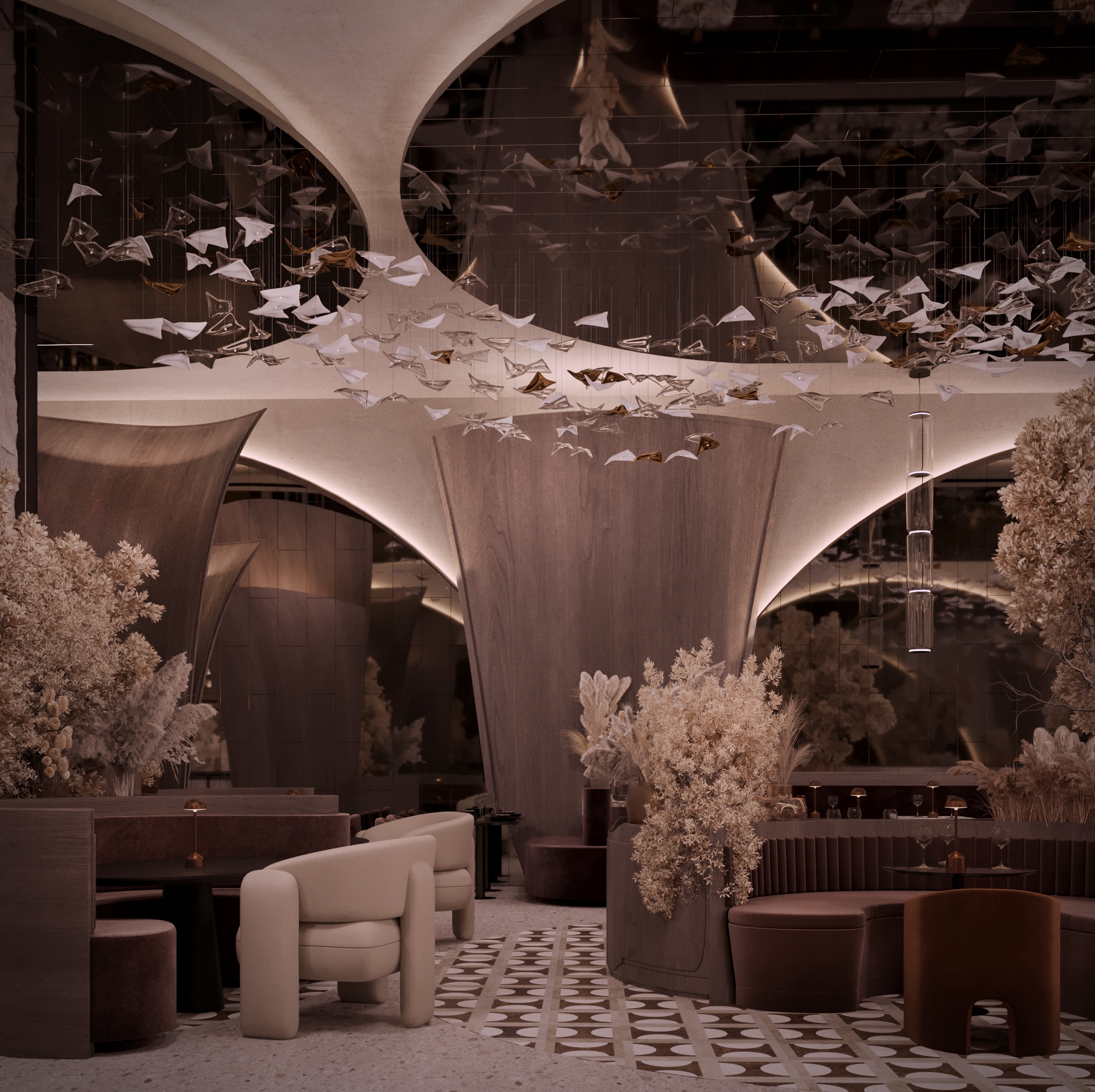 The design evokes a sense of motion and natural elegance — soft, sculptural volumes embrace the space, while the ceiling installation of hand-crafted glass fish creates a mesmerizing underwater illusion.