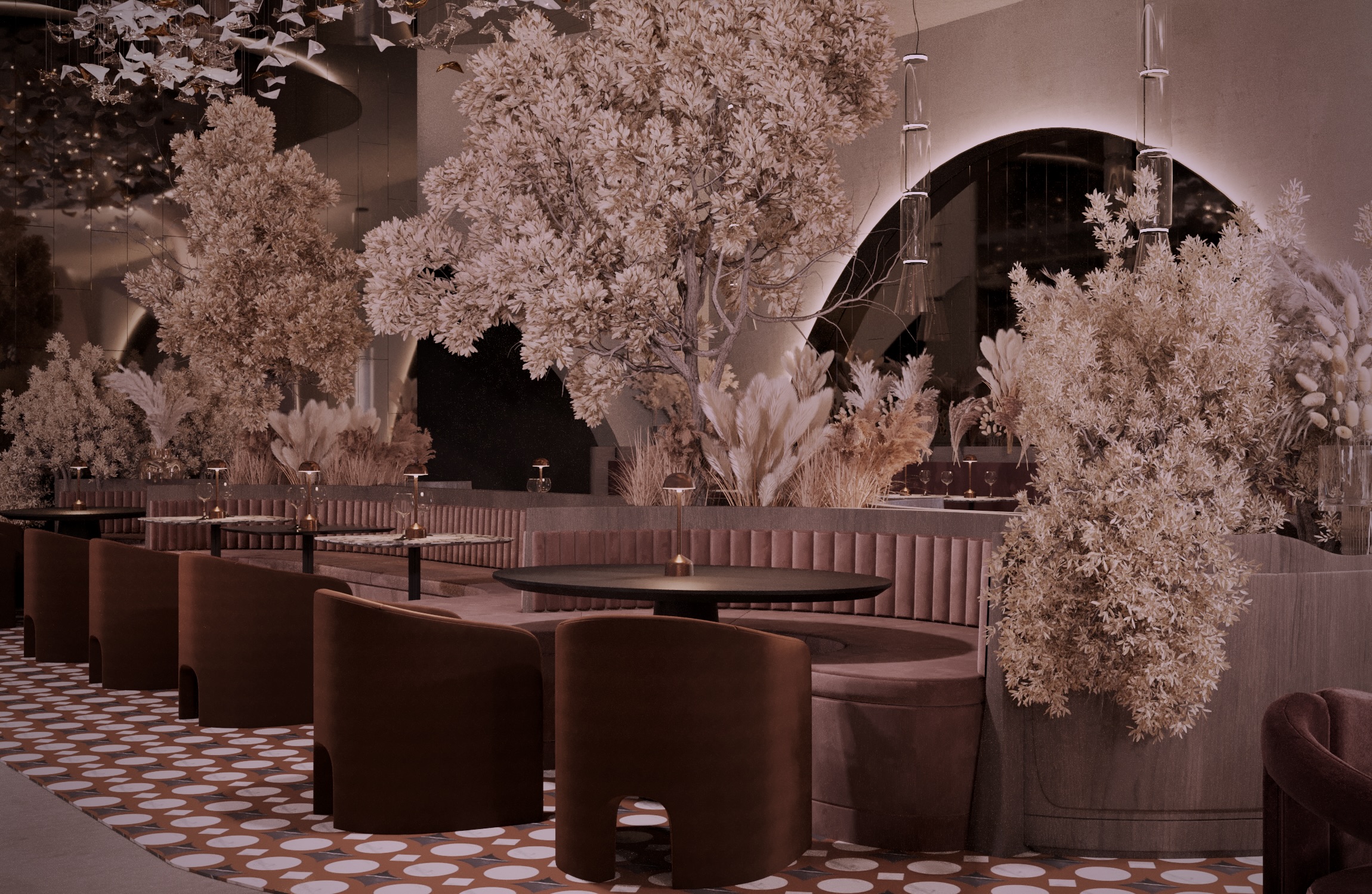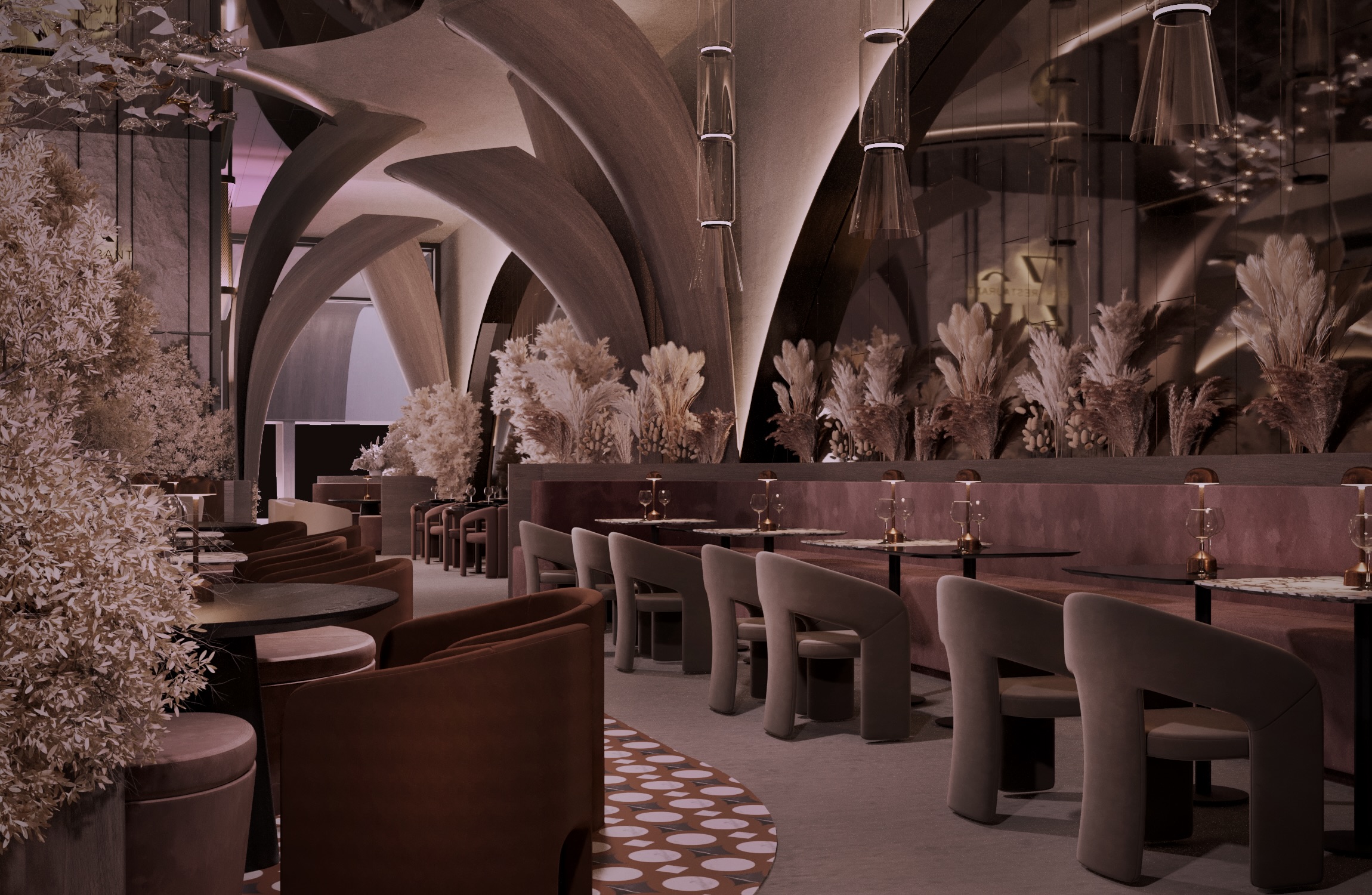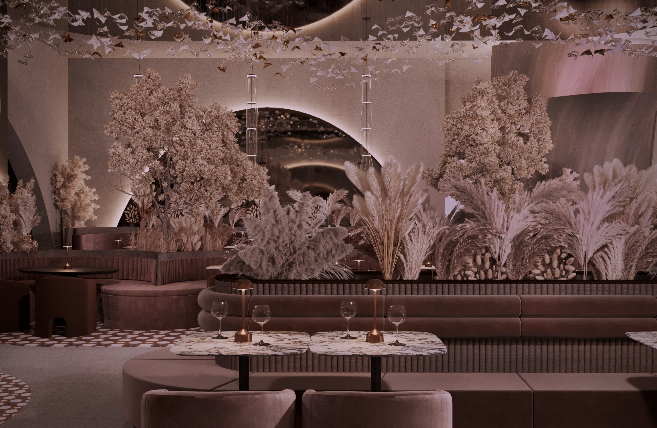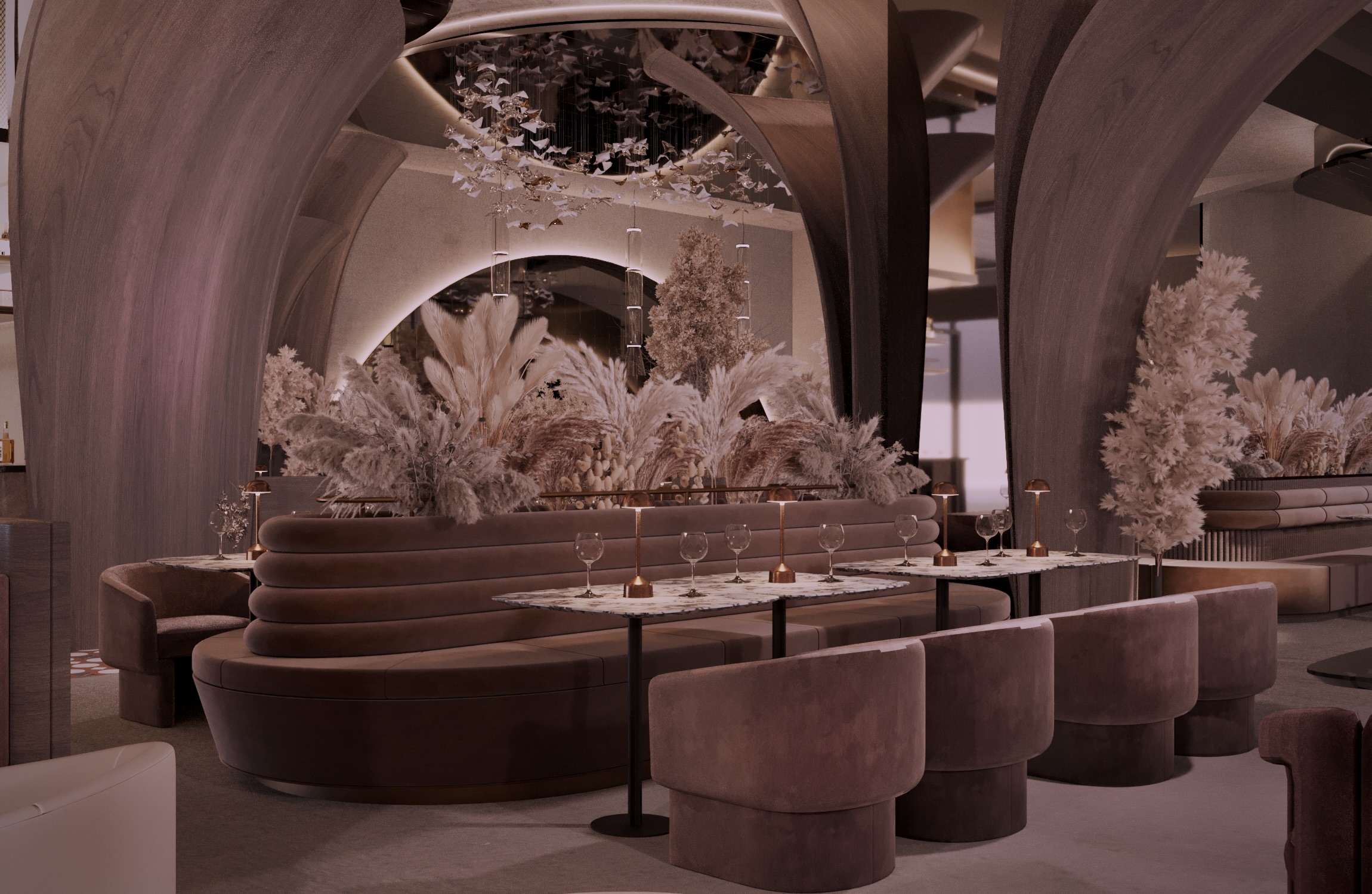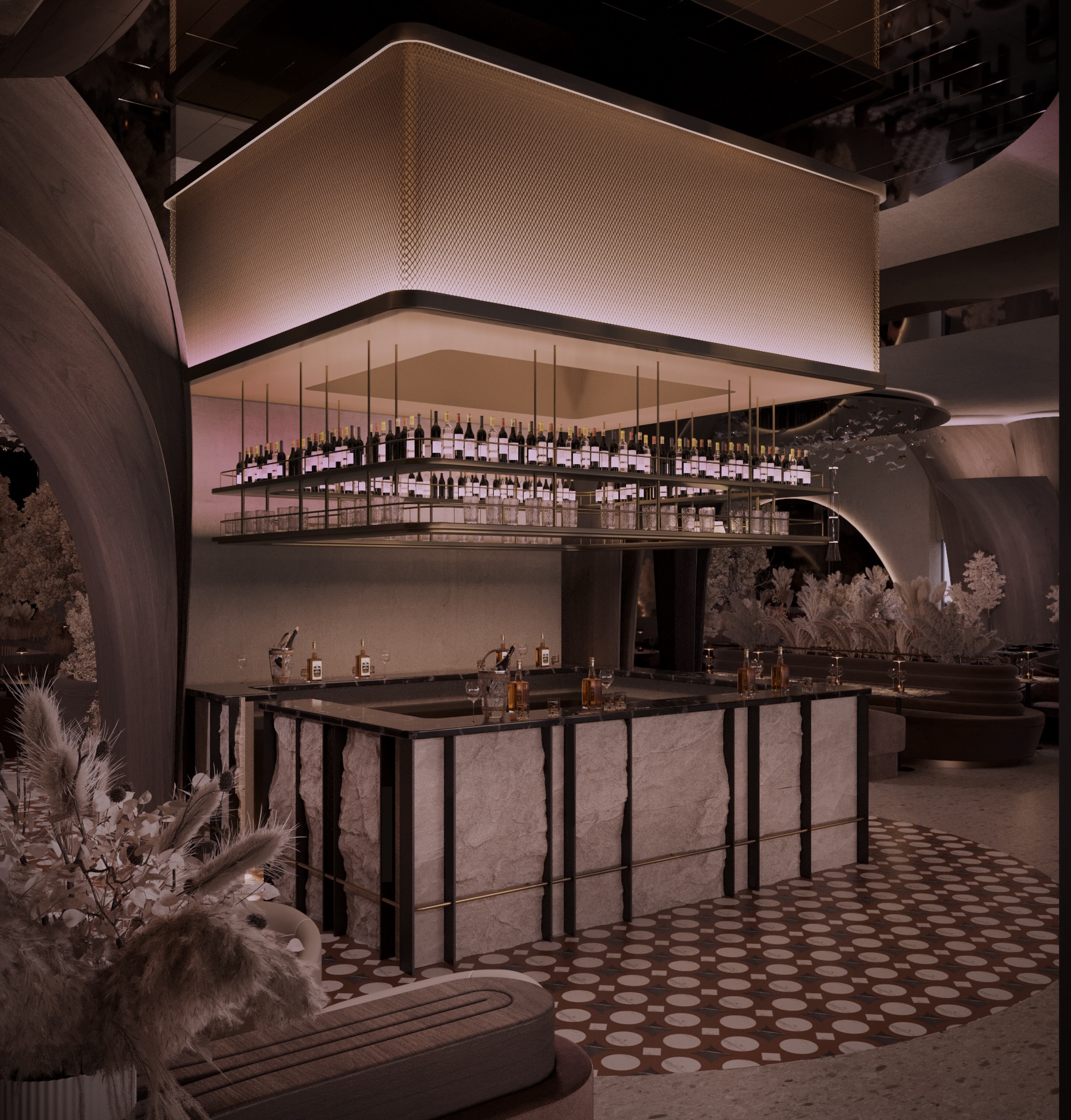 Warm earthy tones, textured stone, and velvet upholstery create a refined yet sensorial ambience. Floral compositions of dried botanicals and golden lighting reflections enhance the depth and drama of the interior, inviting guests to experience a journey through material and emotion.