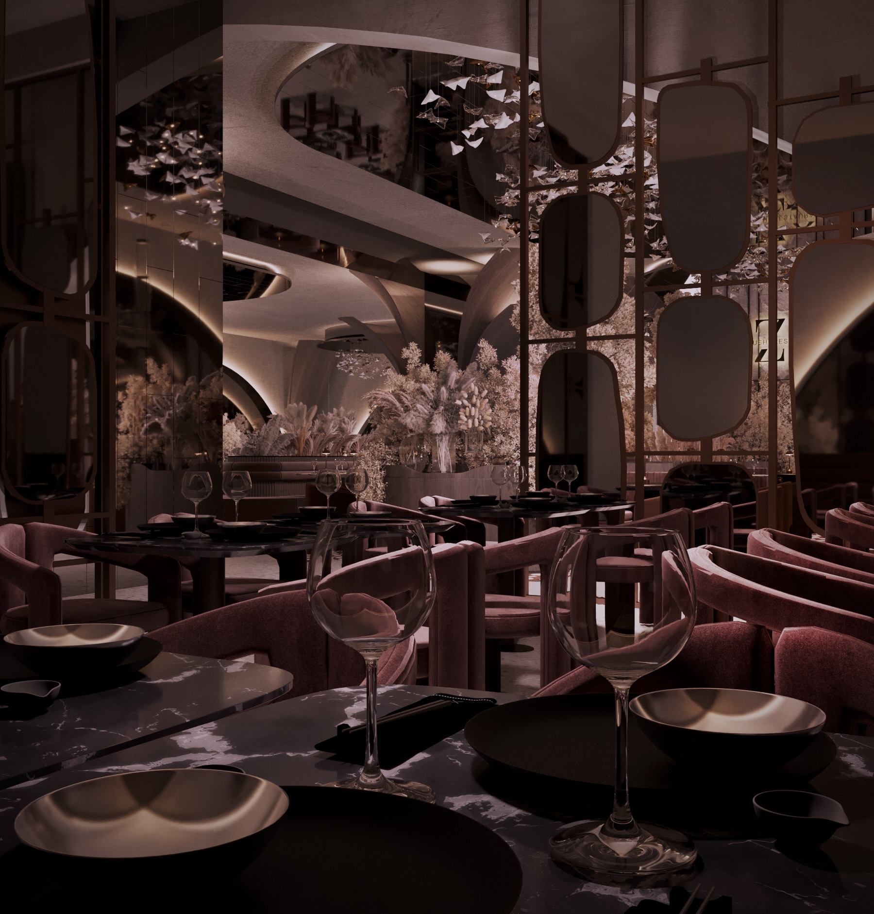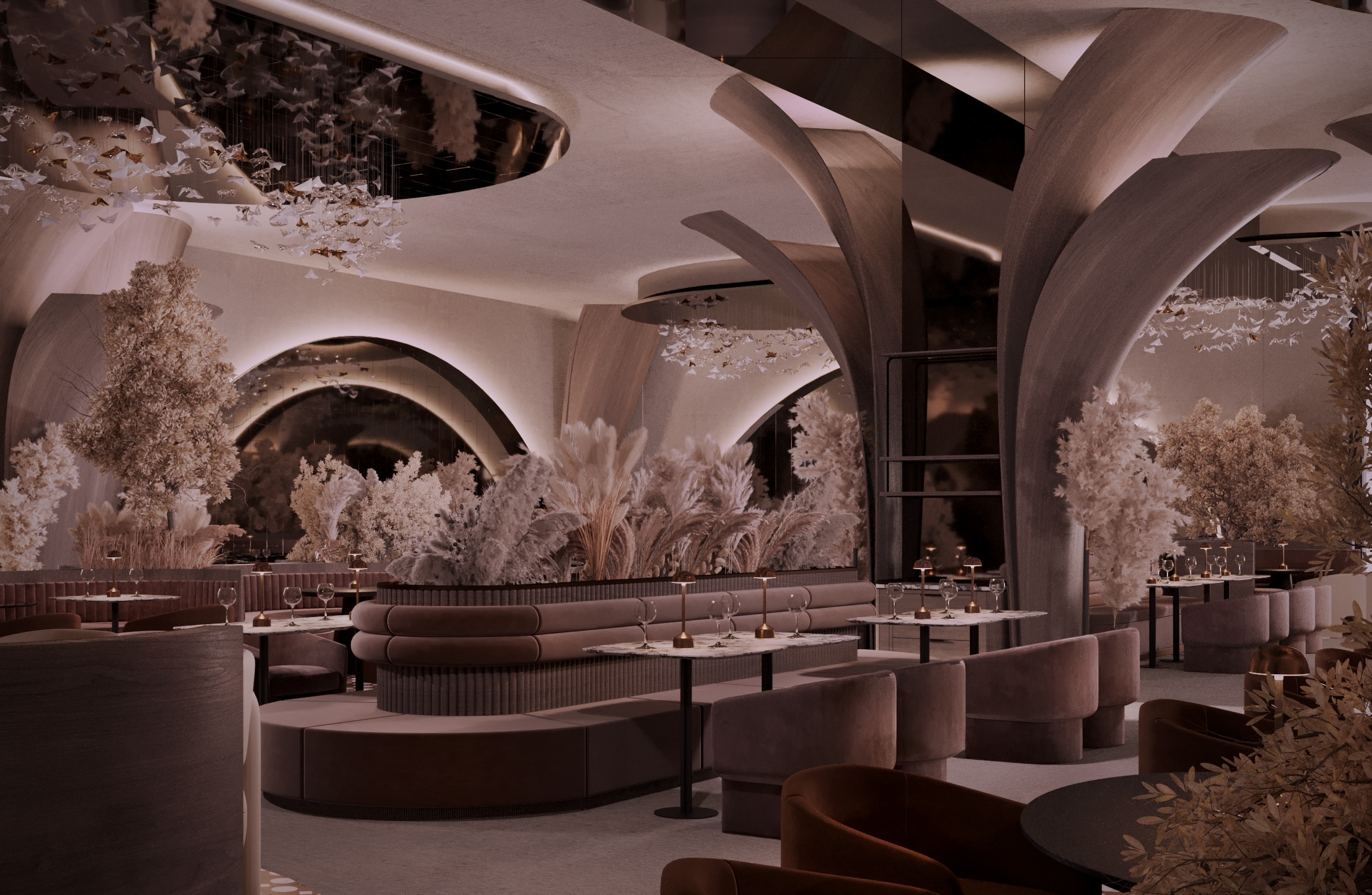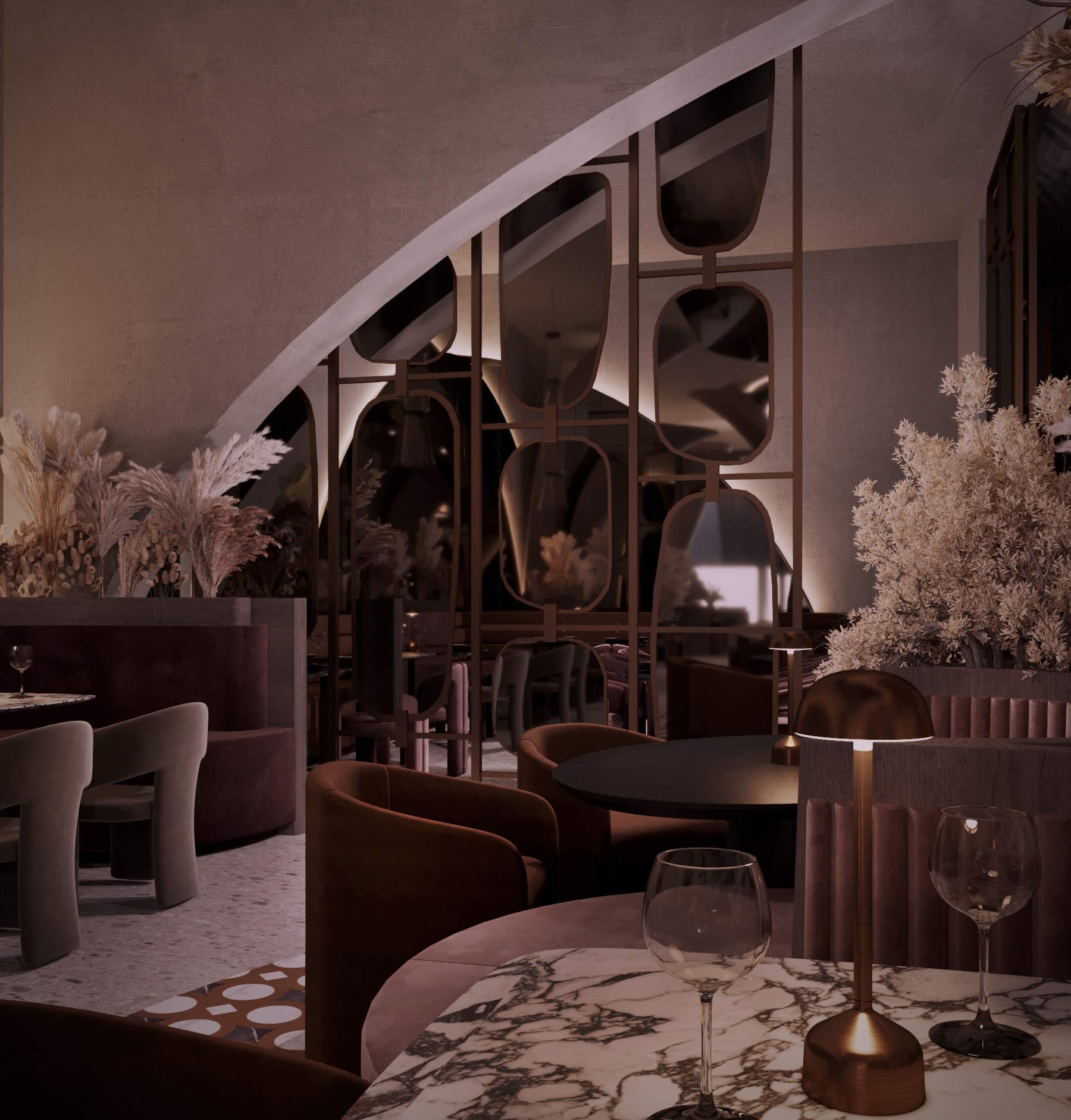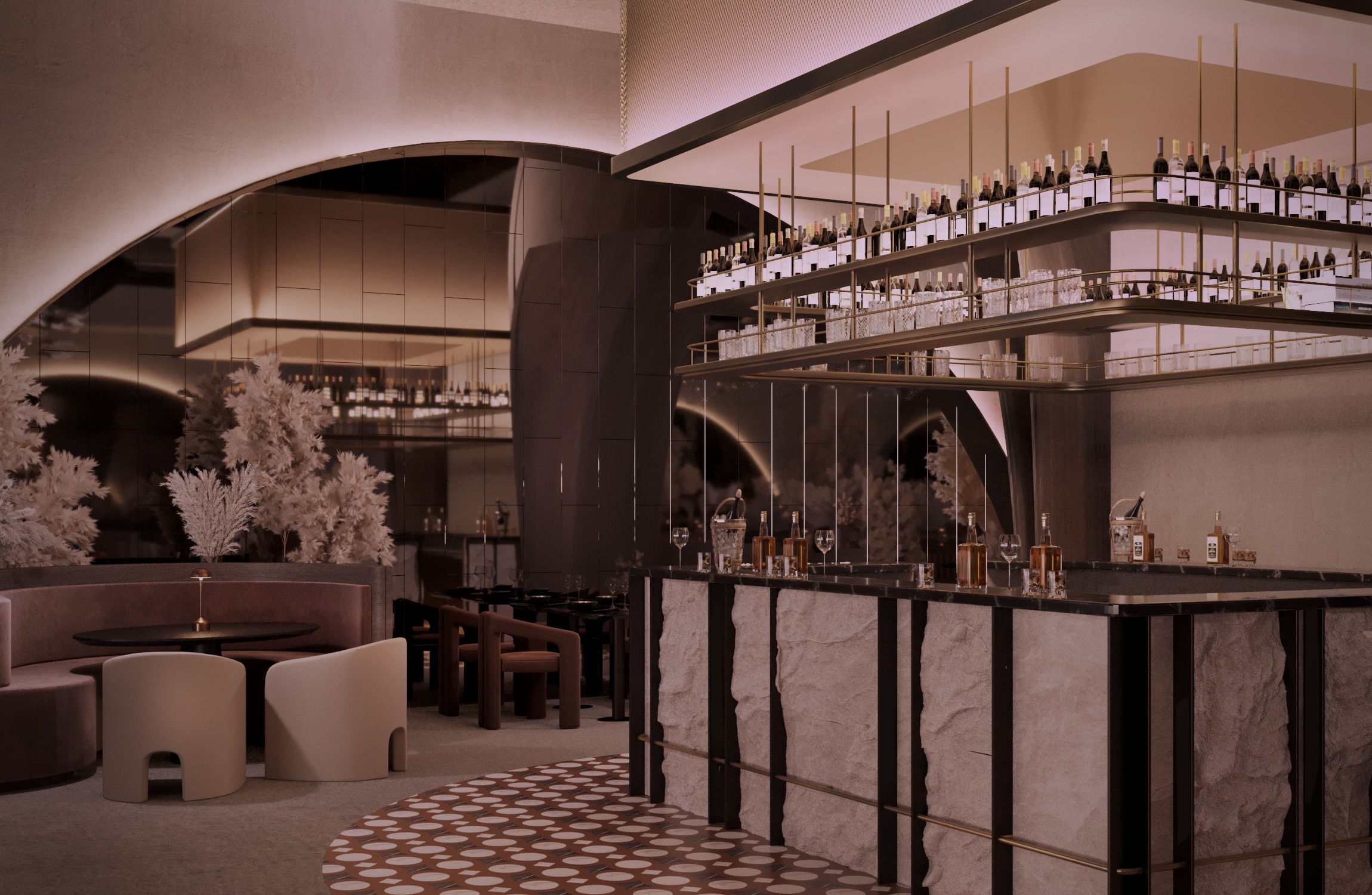 Warm earthy tones, textured stone, and velvet upholstery create a refined yet sensorial ambience. Floral compositions of dried botanicals and golden lighting reflections enhance the depth and drama of the interior, inviting guests to experience a journey through material and emotion.