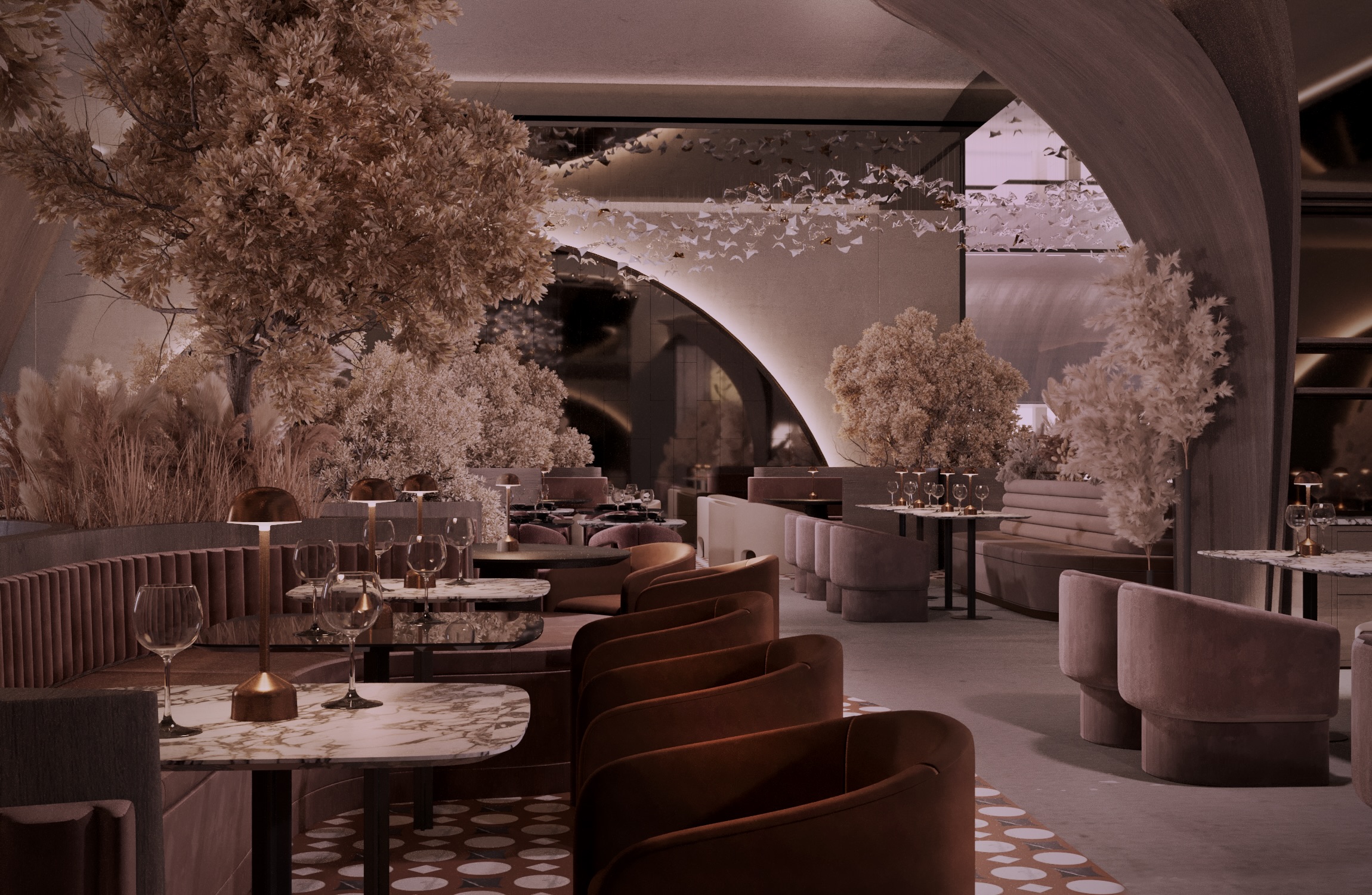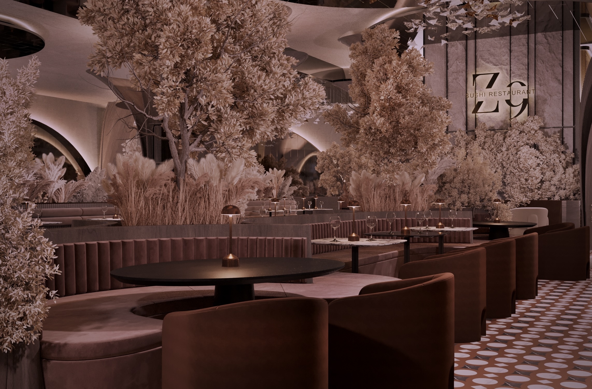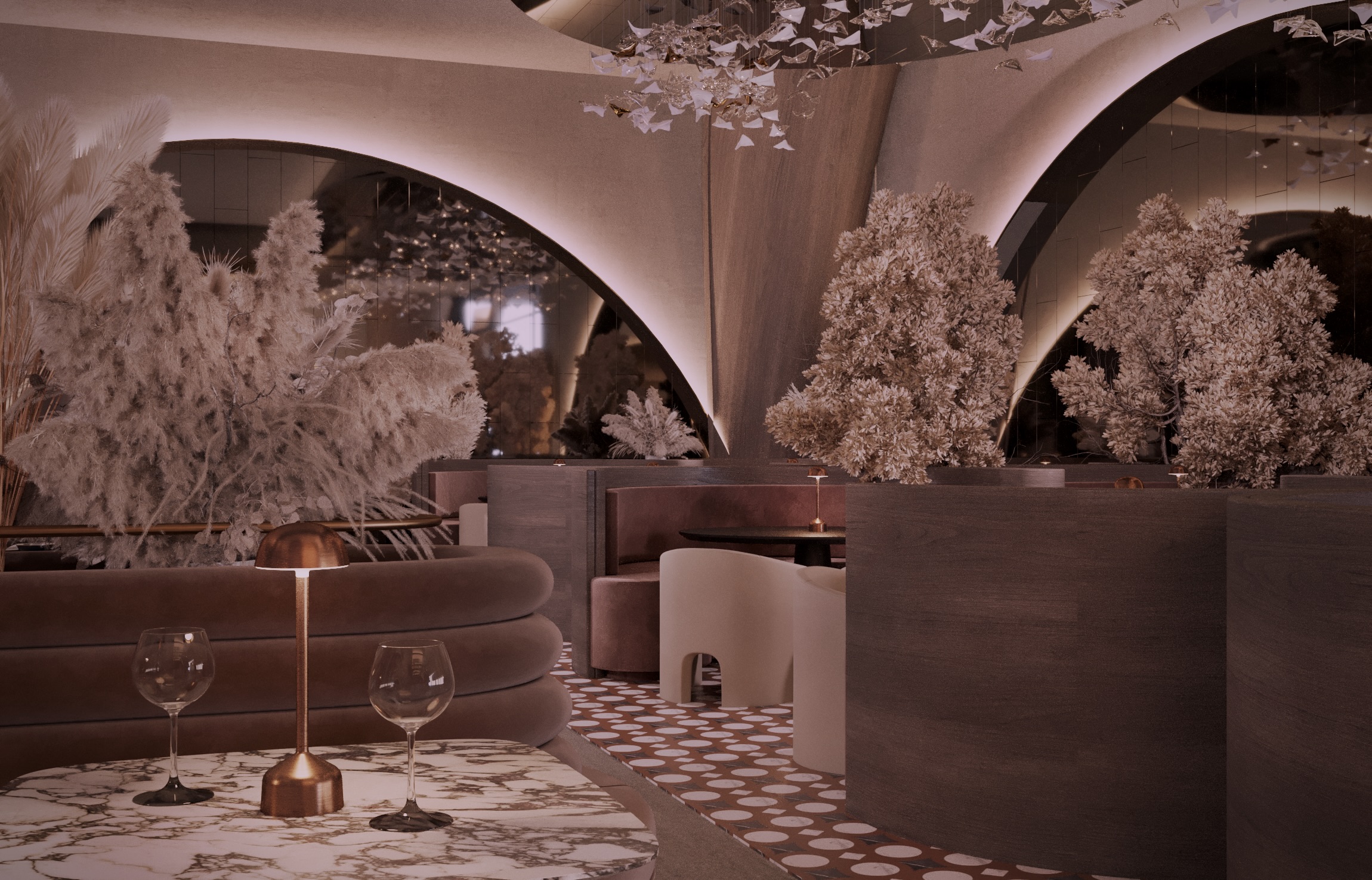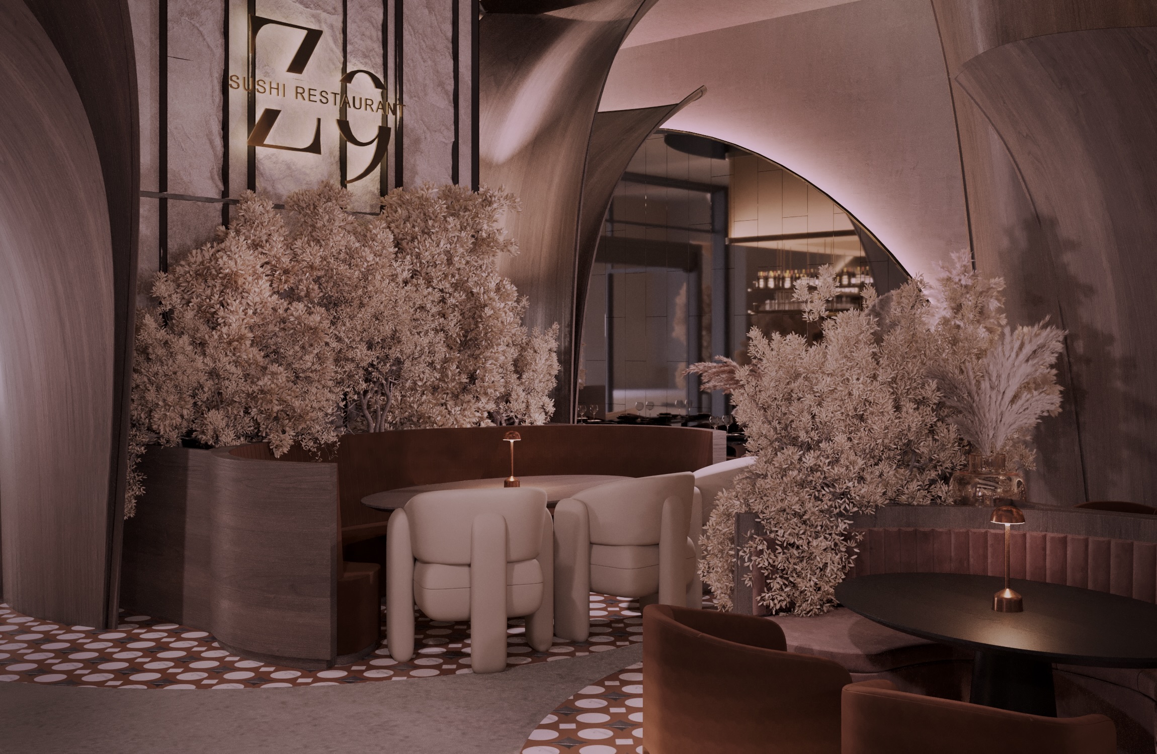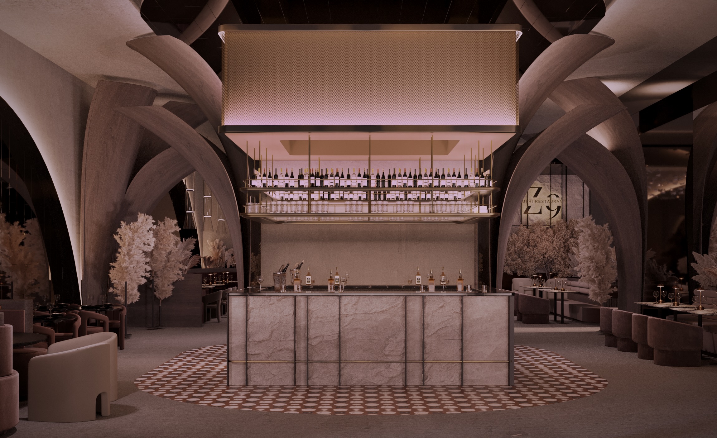 Warm earthy tones, textured stone, and velvet upholstery create a refined yet sensorial ambience. Floral compositions of dried botanicals and golden lighting reflections enhance the depth and drama of the interior, inviting guests to experience a journey through material and emotion.
