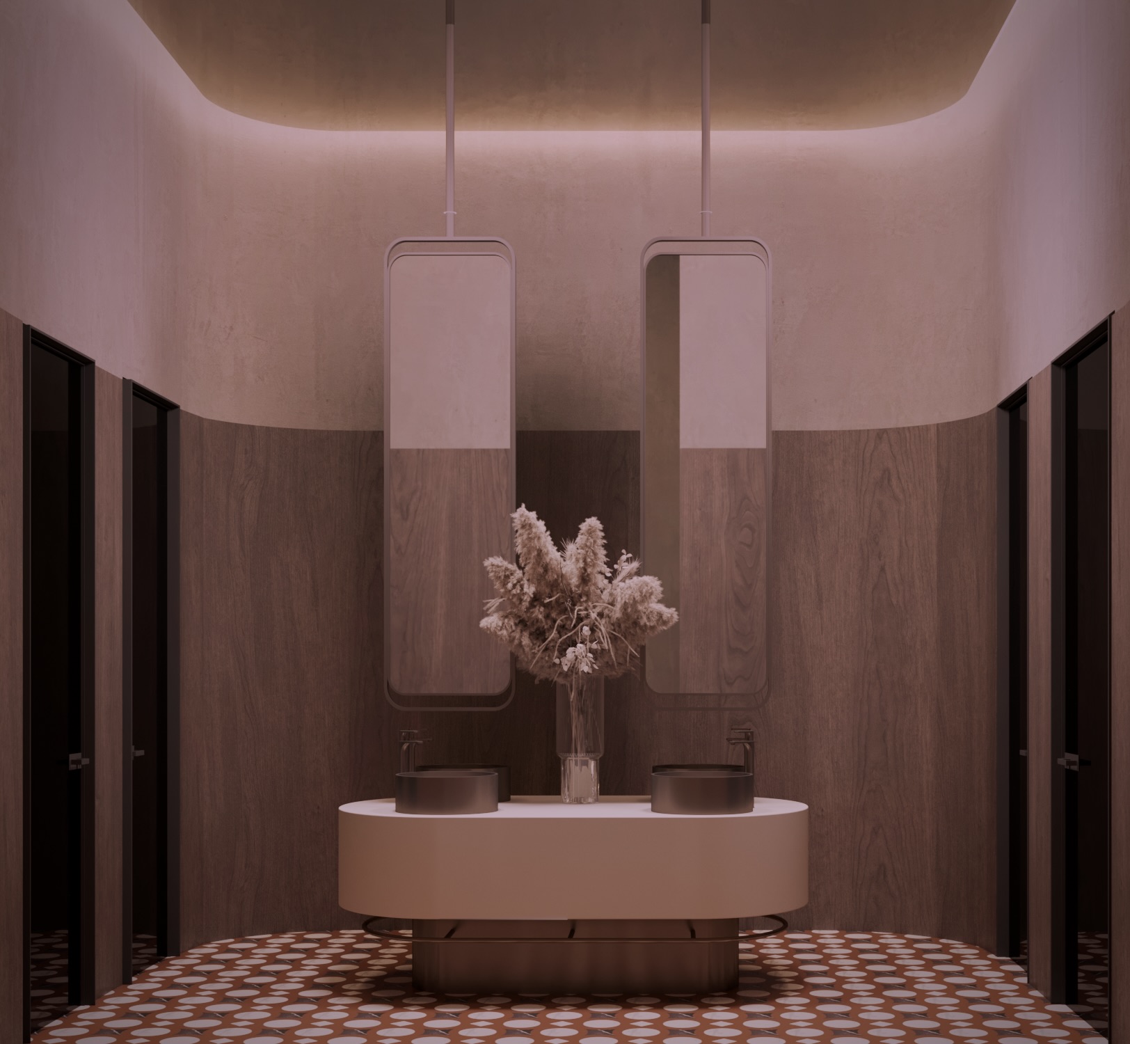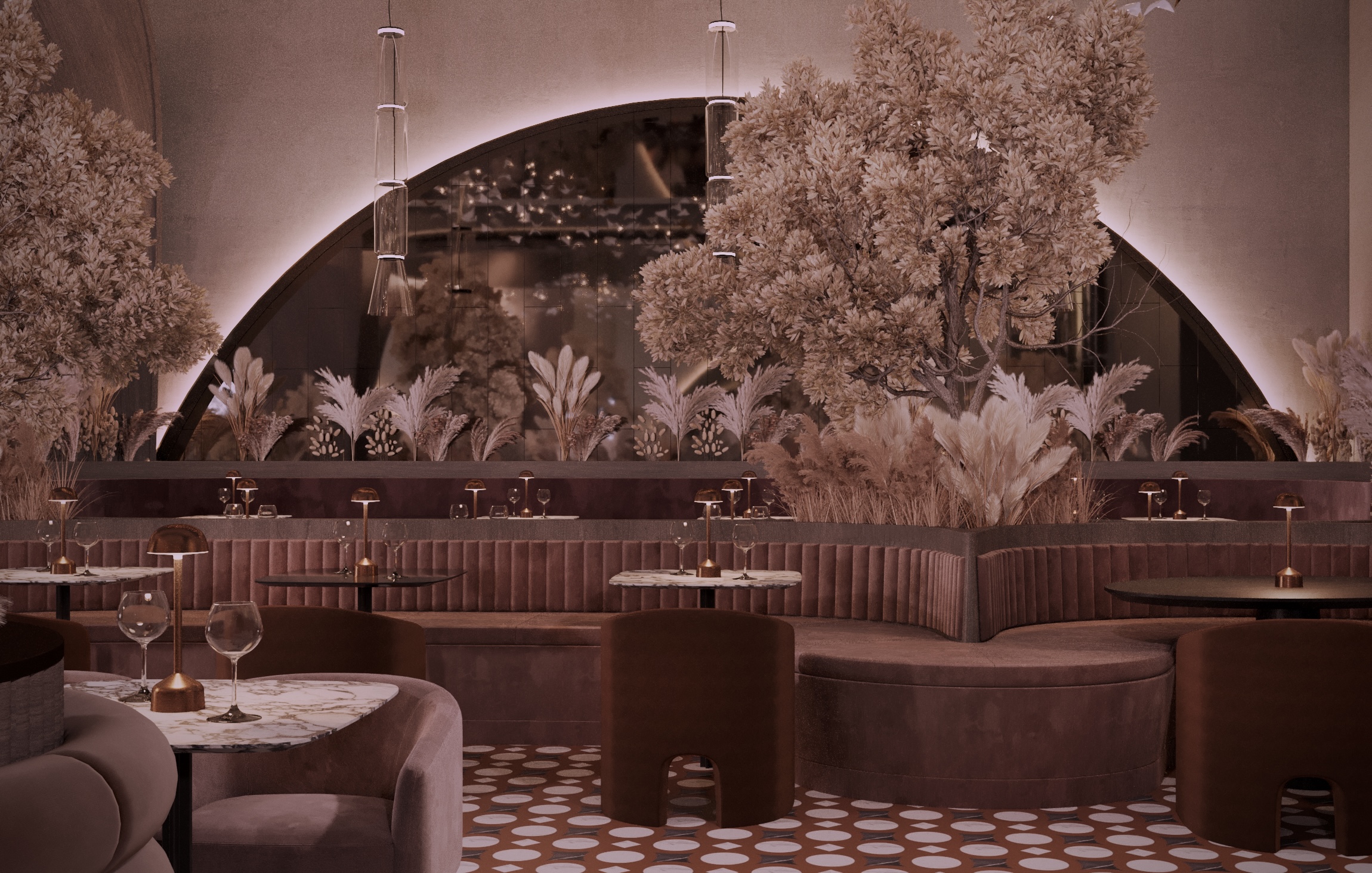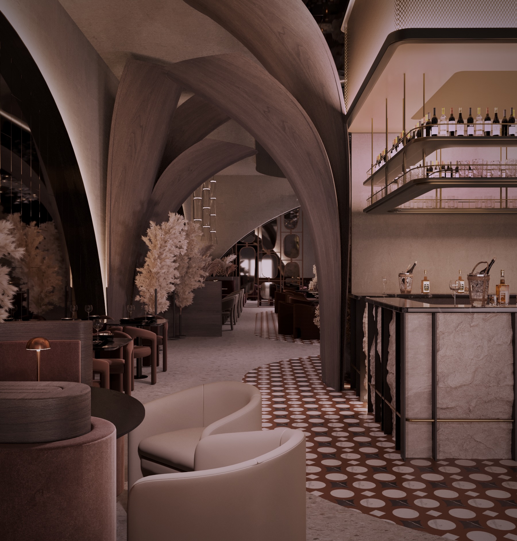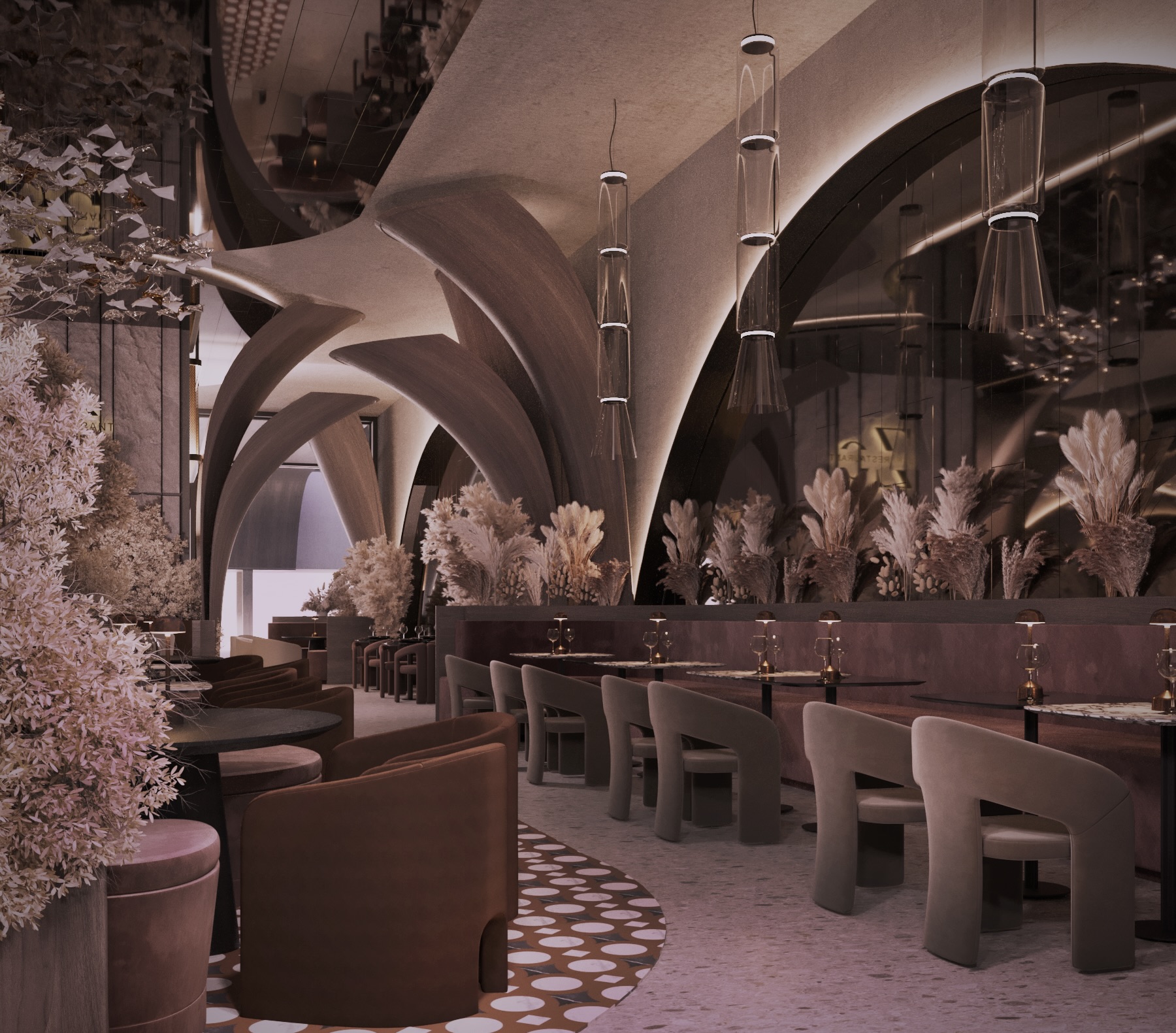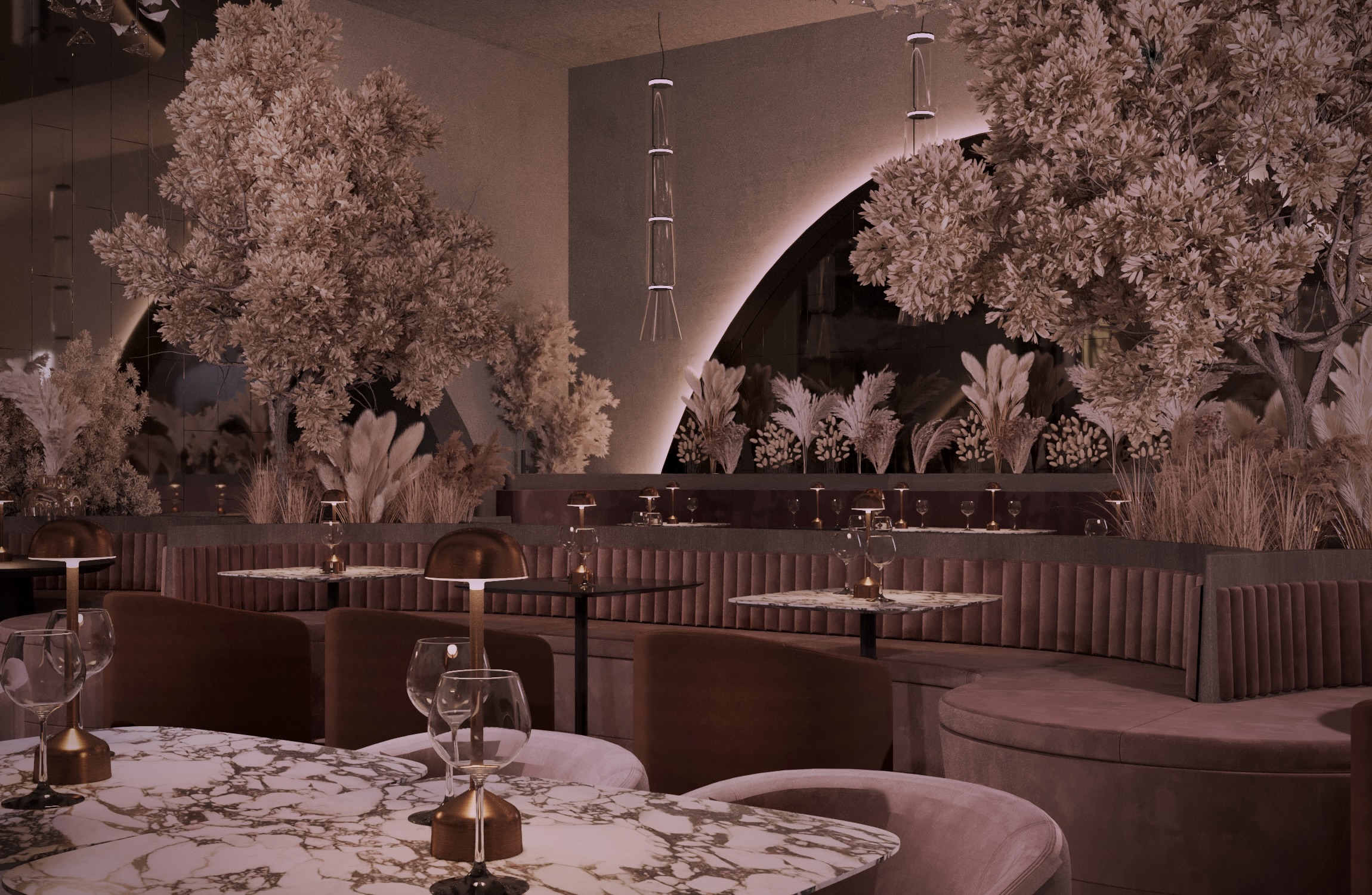 Warm earthy tones, textured stone, and velvet upholstery create a refined yet sensorial ambience. Floral compositions of dried botanicals and golden lighting reflections enhance the depth and drama of the interior, inviting guests to experience a journey through material and emotion.