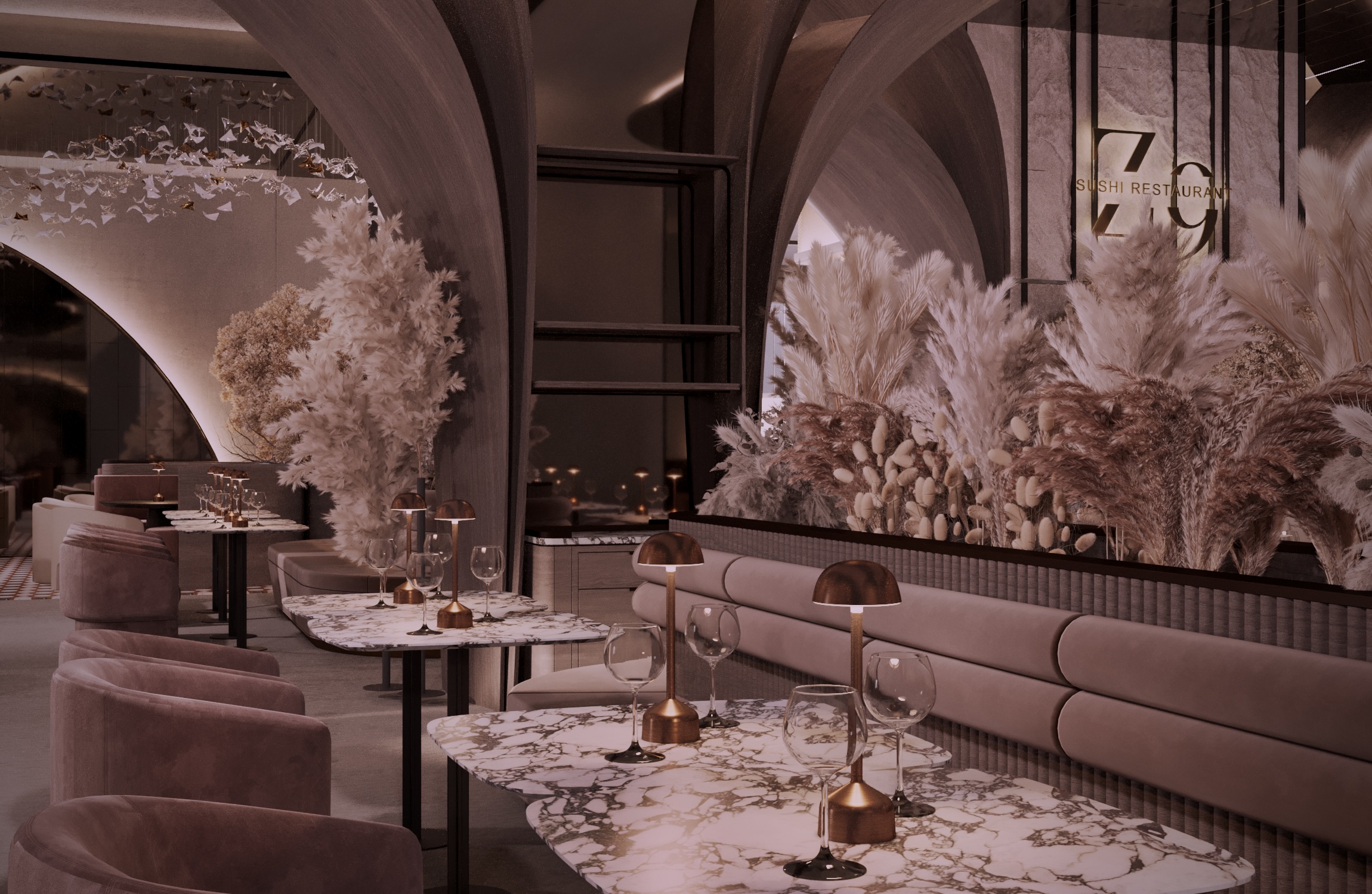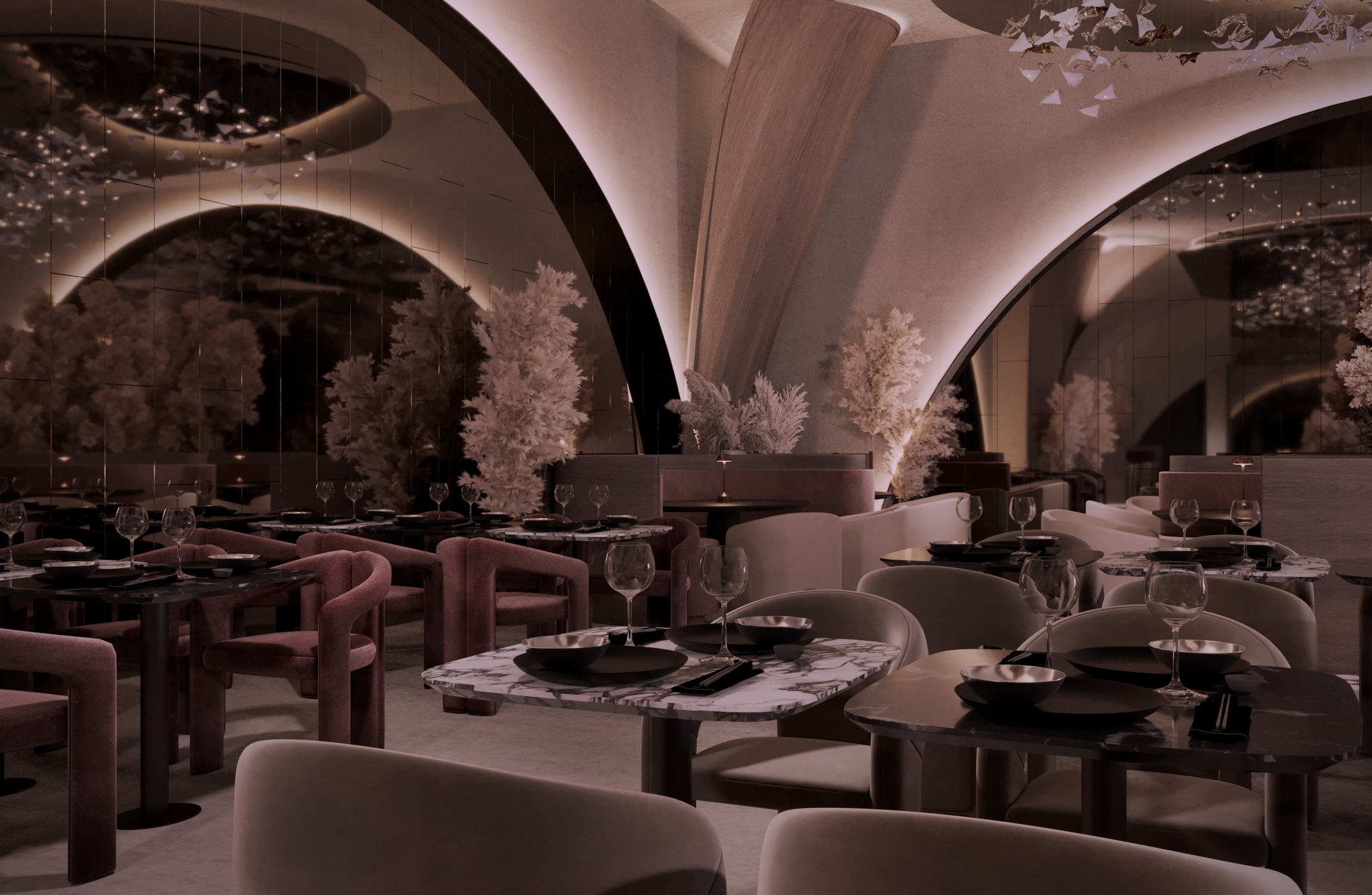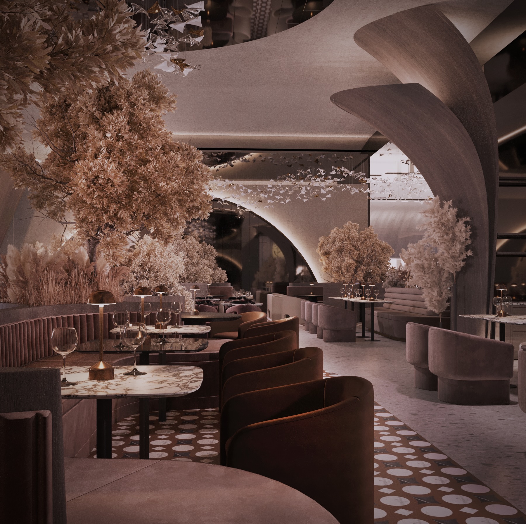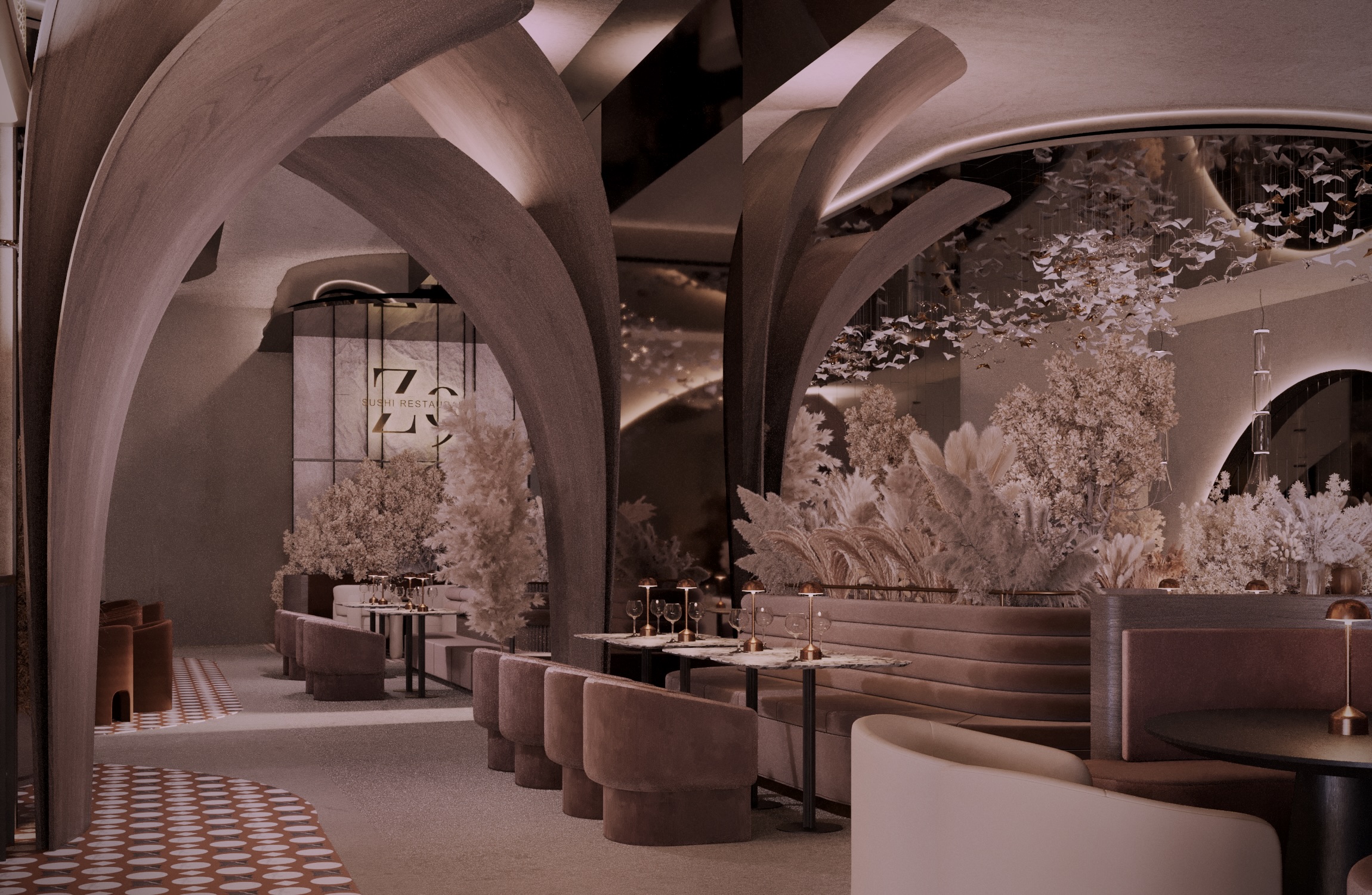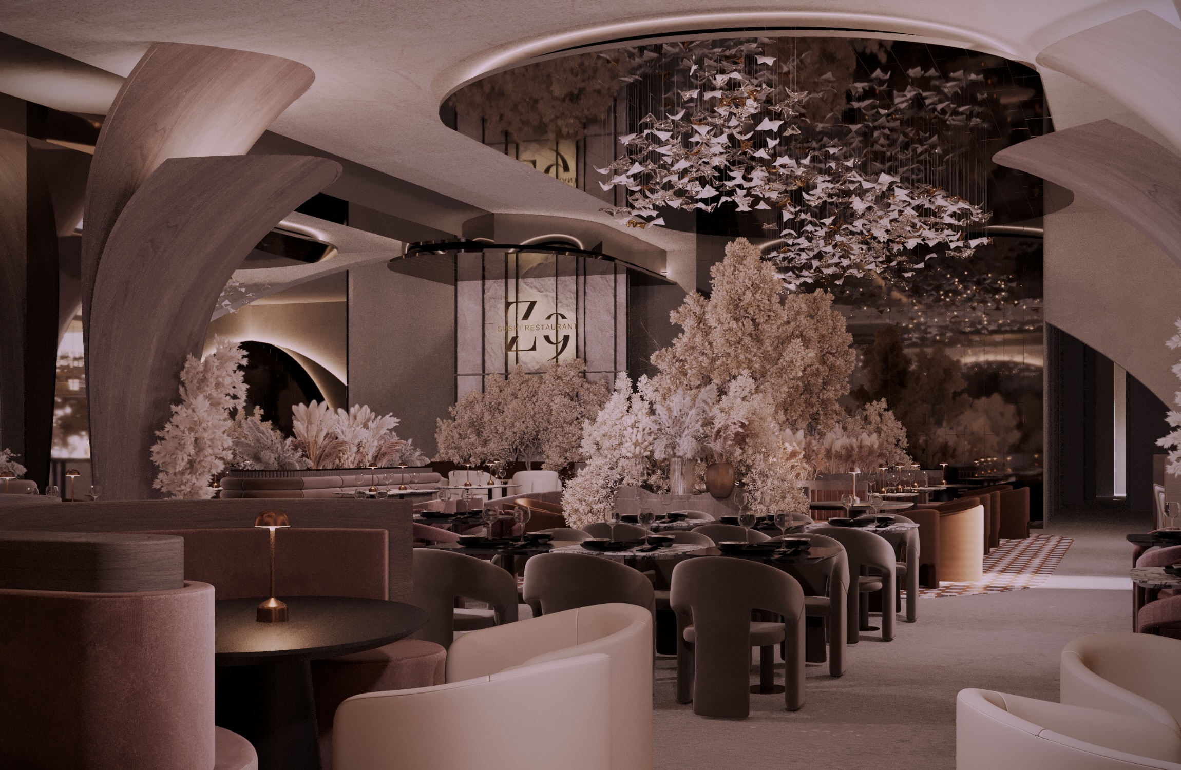 The design evokes a sense of motion and natural elegance — soft, sculptural volumes embrace the space, while the ceiling installation of hand-crafted glass fish creates a mesmerizing underwater illusion.