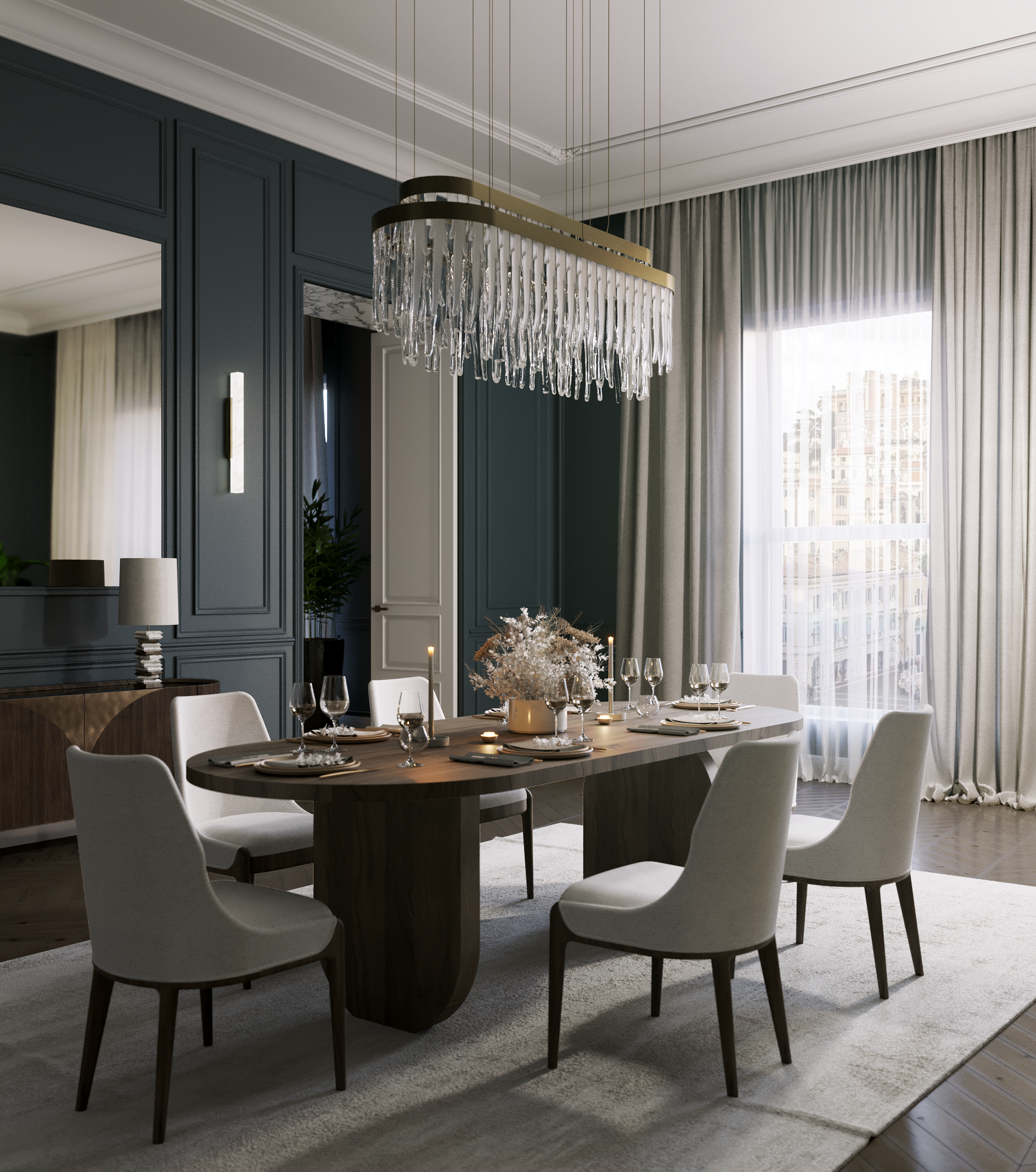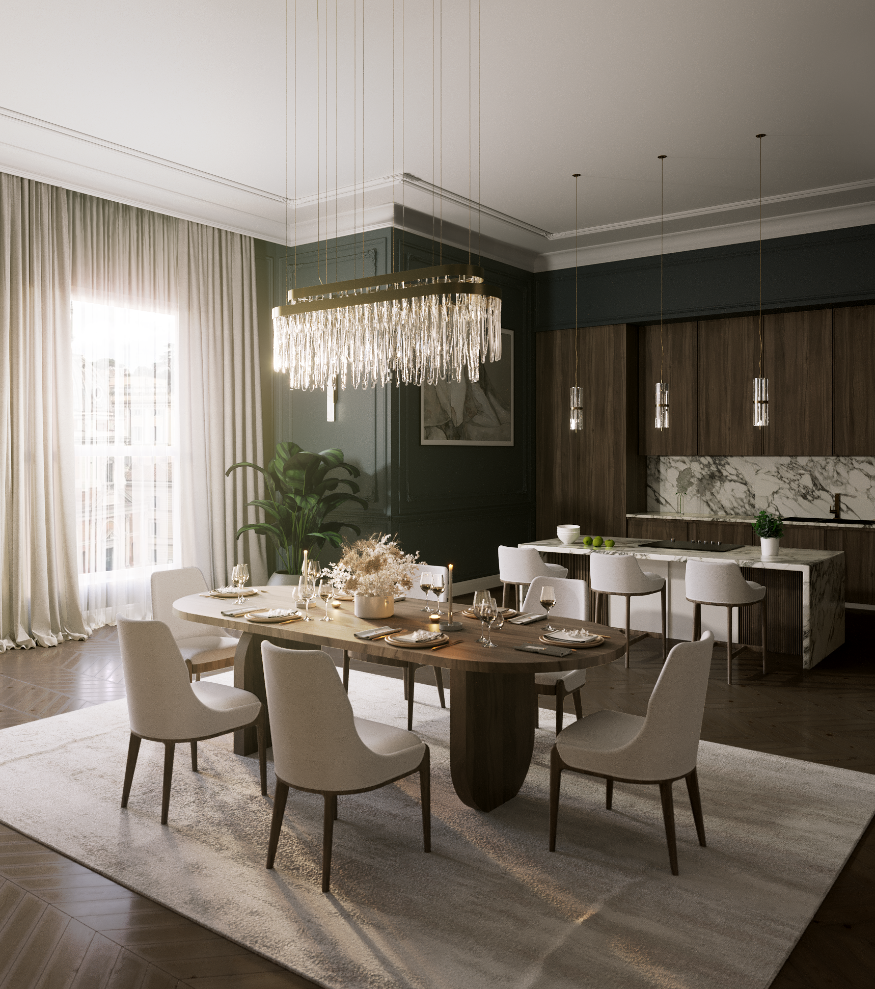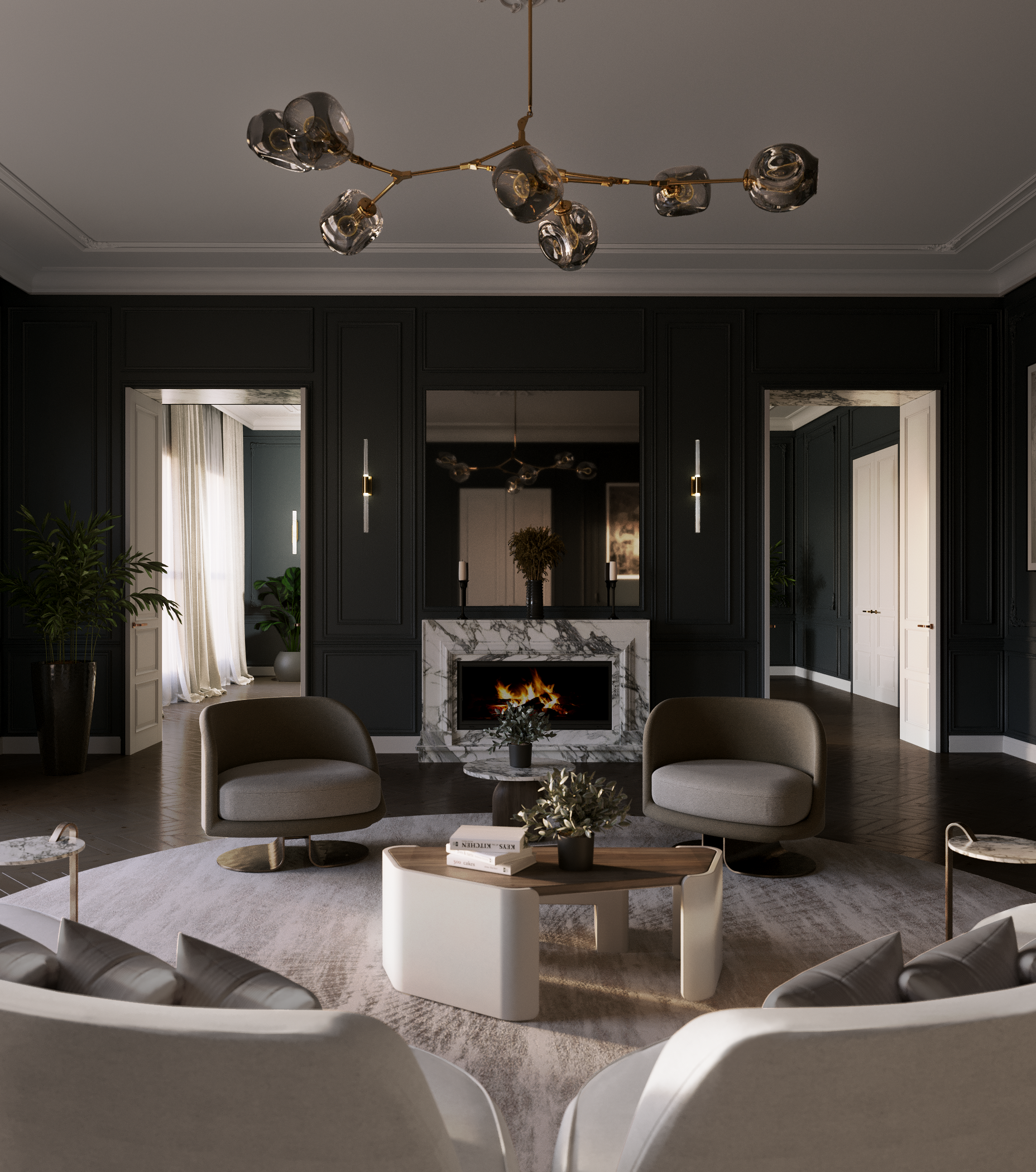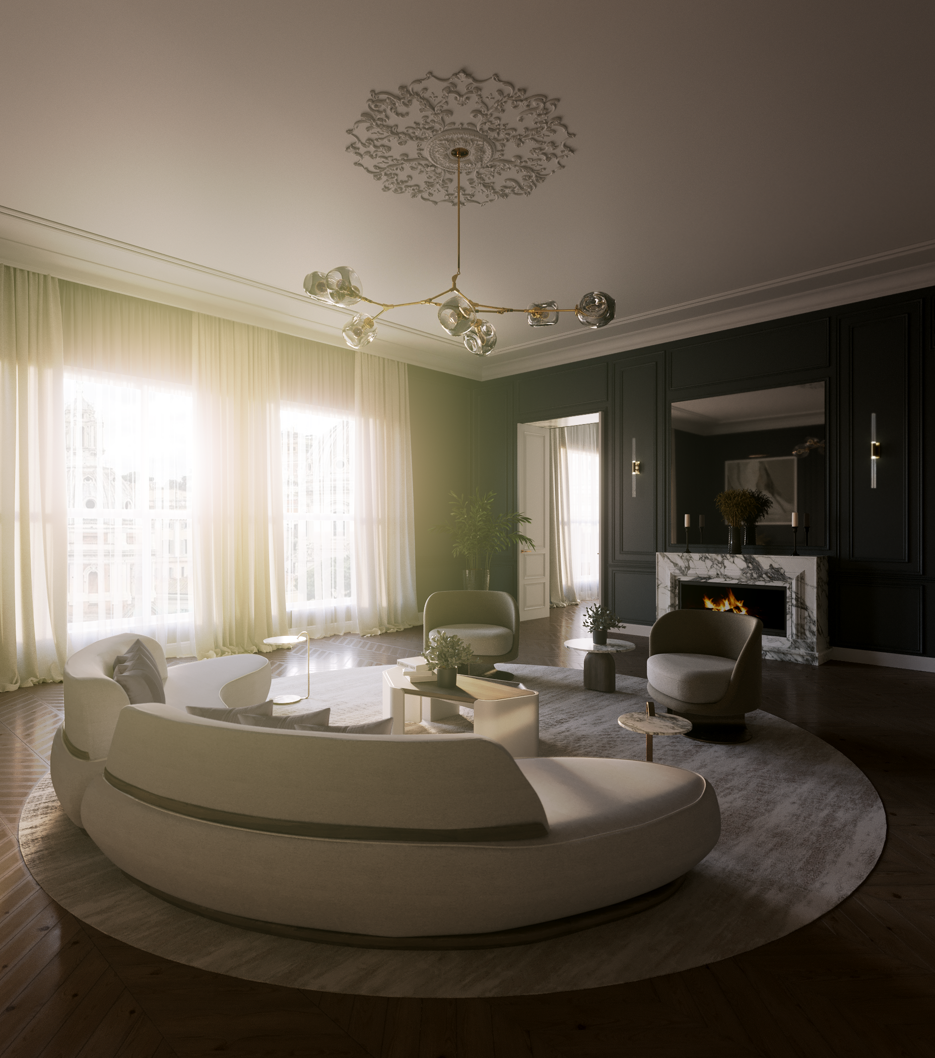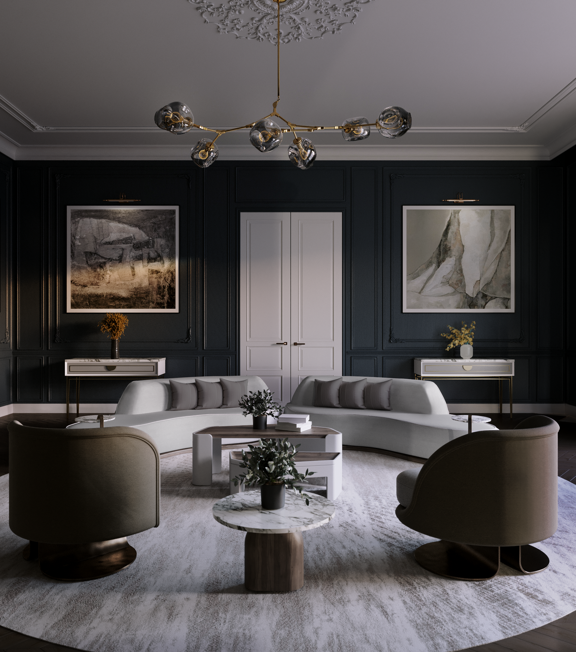 Per quanto riguarda l'area principale dell'appartamento, il soggiorno è più convenzionale, presentandosi in un tipico stile classico moderno, senza mai venir meno al principio di funzionalità e benessere che dovrebbe guidare ogni interno. Attraverso un design curvilineo, il divano Odette, di Boca do Lobo, offre eleganza e puro relax, insieme alla poltrona Demitasse, di Caffe Latte, dal design minimalista e unico. Per quanto riguarda i tavoli, l'attenzione si concentra principalmente sull'uso del legno e del marmo, che mette in risalto la qualità e la ricchezza di Minas Small Center Table o Cutty Side Table, di Caffe Latte, così come Philip Side Table, progettato da Essential Home.