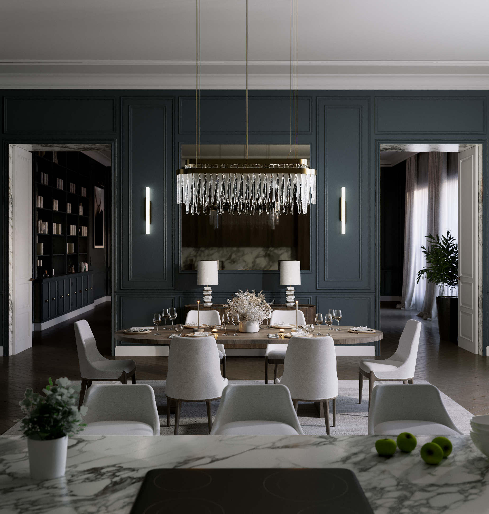 Large and spacious, the dining room is the ideal example of minimalism and functionality, with a slight touch of luxury to the mix, given by the magnificent Luxxu lighting pieces, such as the imposing Babel Snooker Suspension, or the discreet, but still irreverent Skyline Wall Lamp.