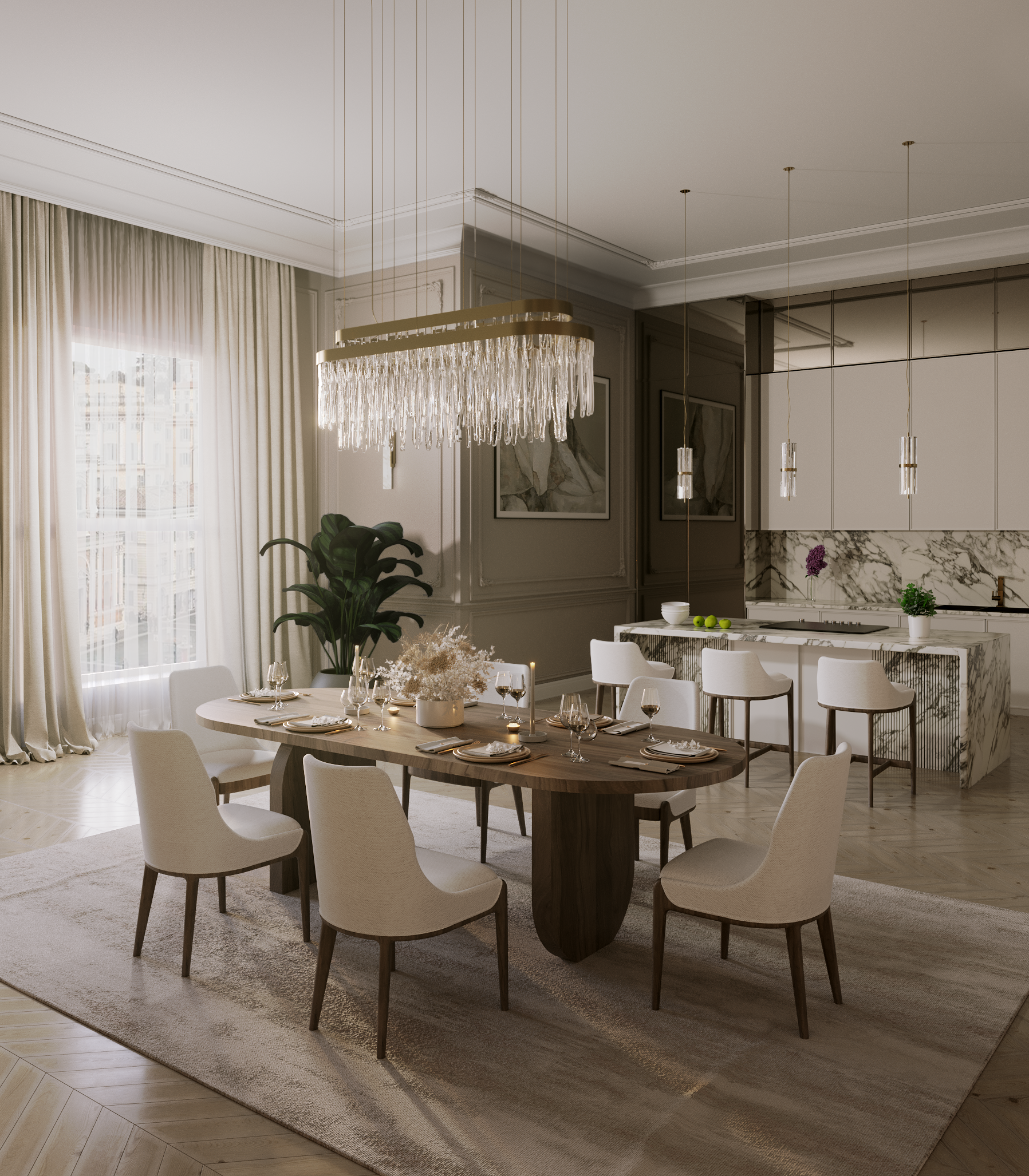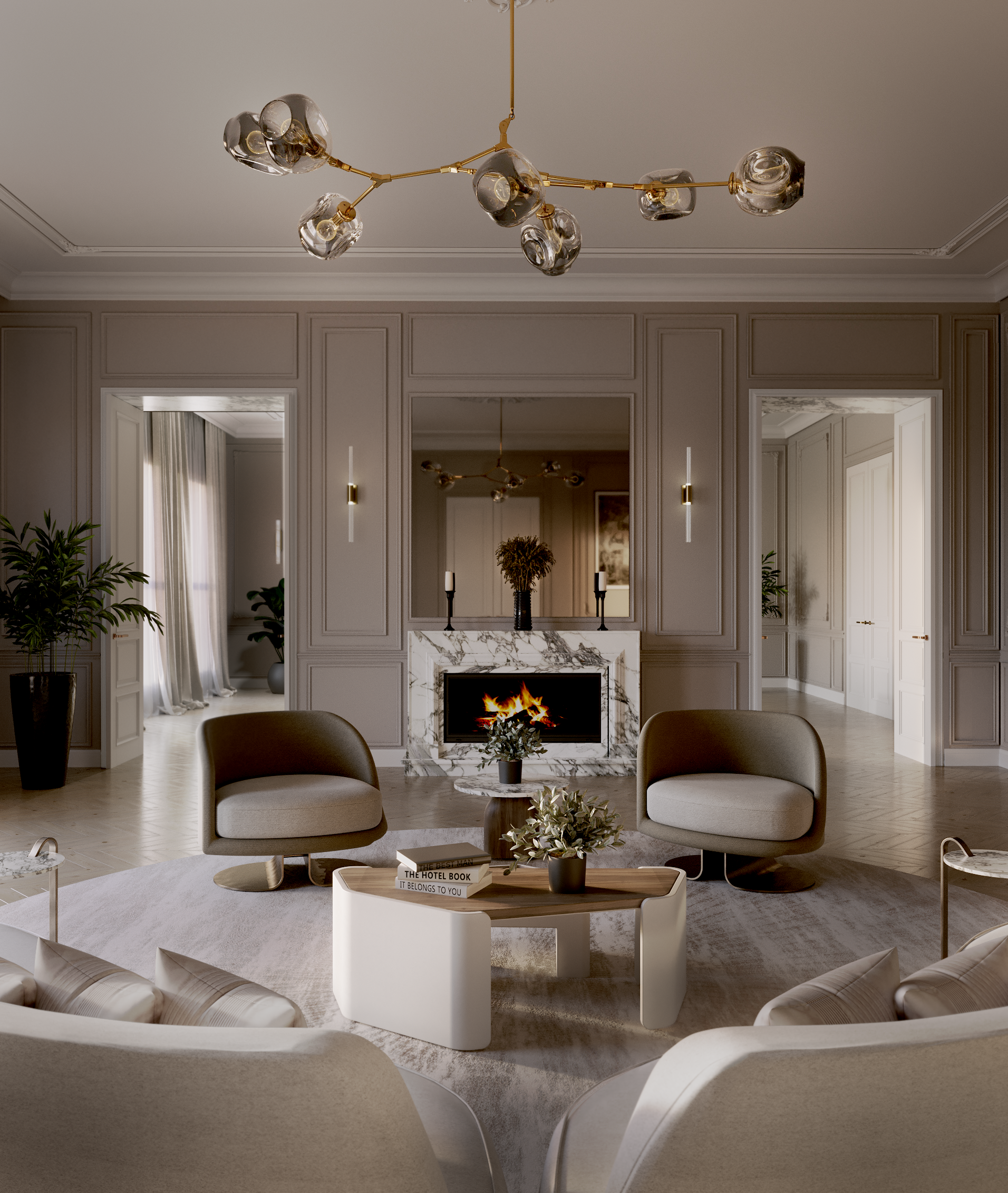 Per quanto riguarda l'area principale dell'appartamento, il soggiorno è più convenzionale, presentandosi in un tipico stile classico moderno, senza mai venir meno al principio di funzionalità e benessere che dovrebbe guidare ogni interno. Attraverso un design curvilineo, il divano Odette, di Boca do Lobo, offre eleganza e puro relax, insieme alla poltrona Demitasse, di Caffe Latte, dal design minimalista e unico. Per quanto riguarda i tavoli, l'attenzione si concentra principalmente sull'uso del legno e del marmo, che mette in risalto la qualità e la ricchezza di Minas Small Center Table o Cutty Side Table, di Caffe Latte, così come Philip Side Table, progettato da Essential Home.