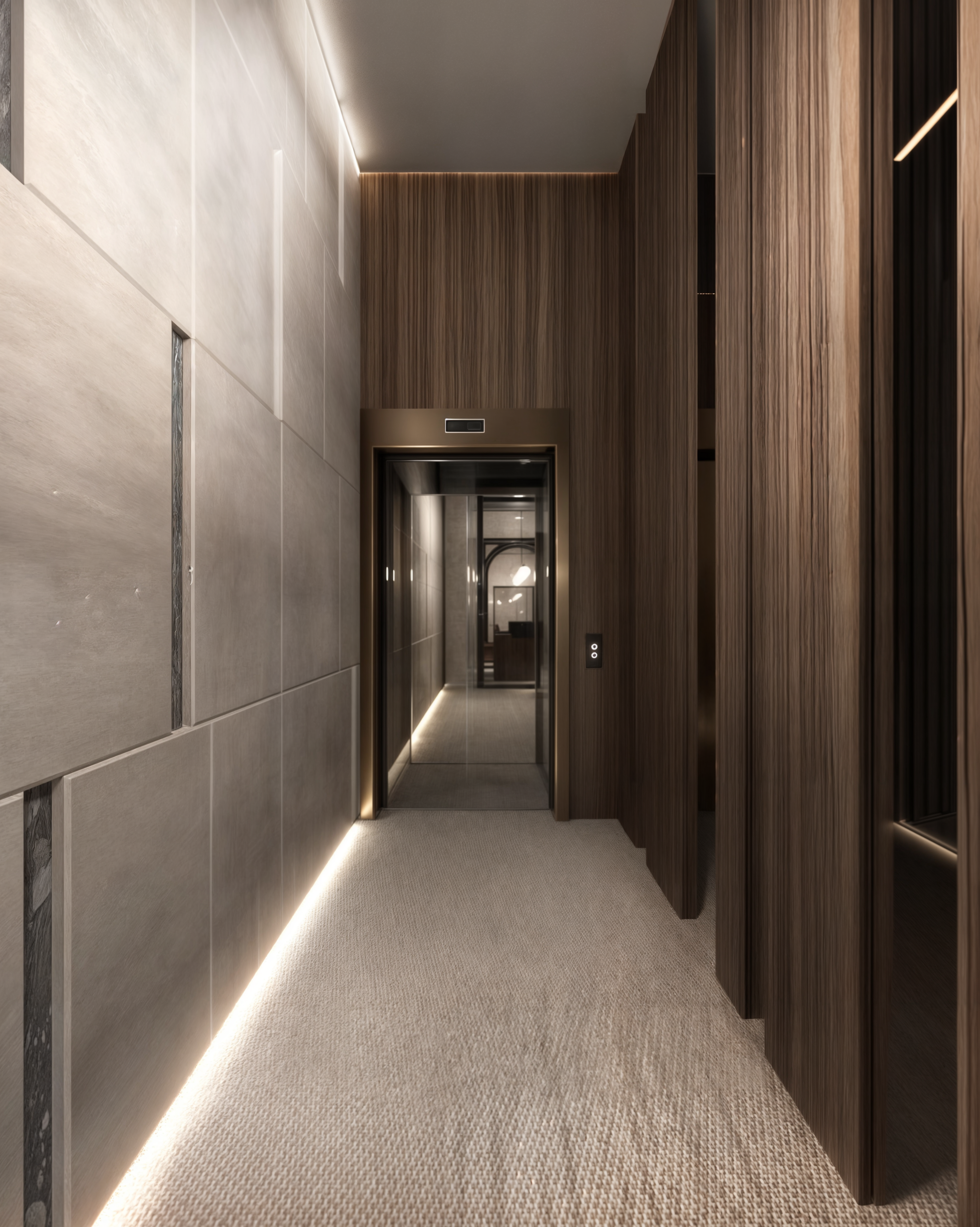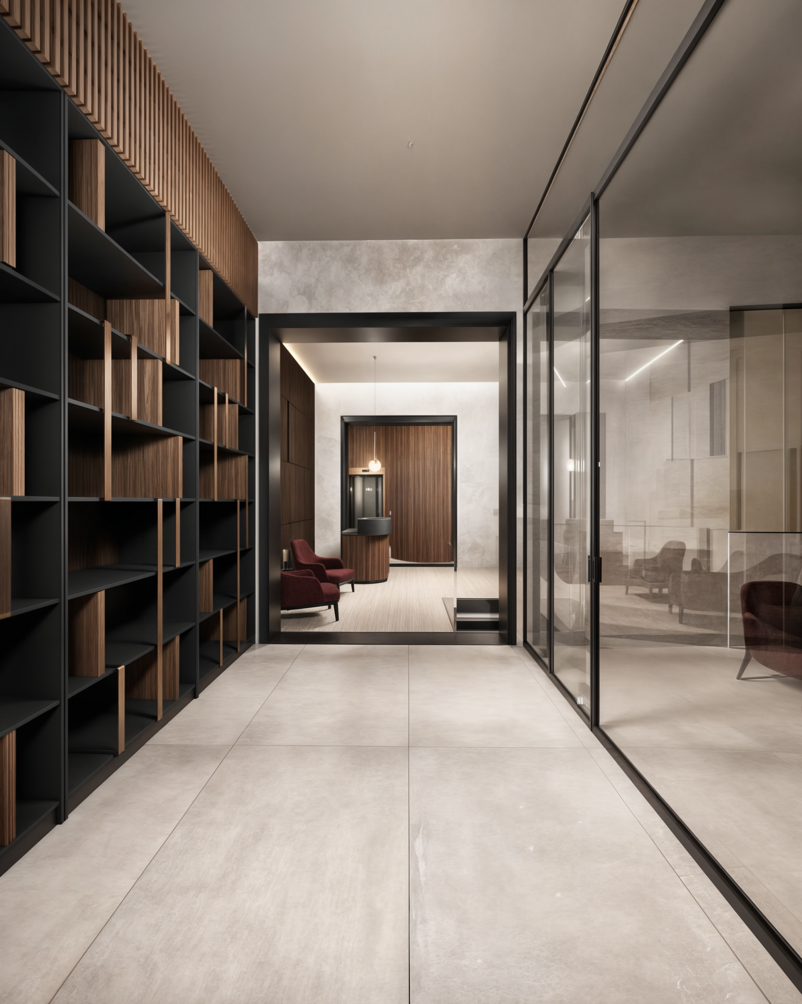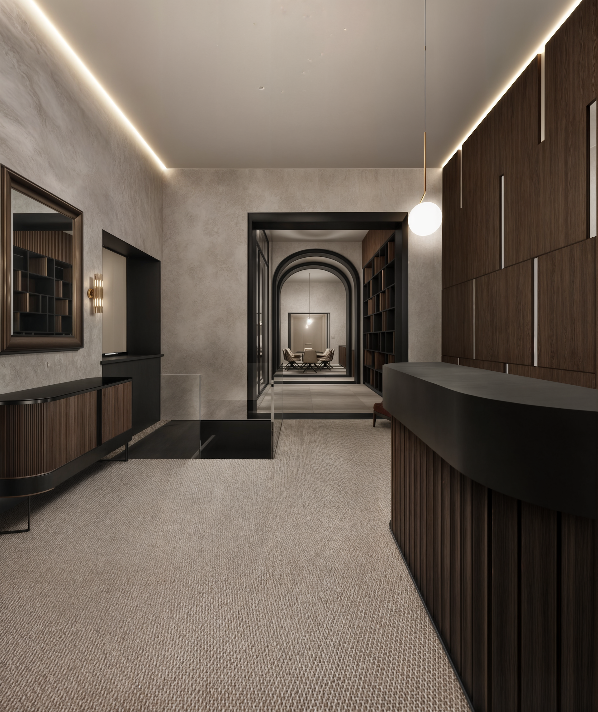 Il lavoro è consistito nella progettazione di uno studio legale a Roma, in cui sono stati utilizzati colori neutri e materiali come il cemento, legno ed ottone, in quanto maggiormente espressivi della serietà della professione.