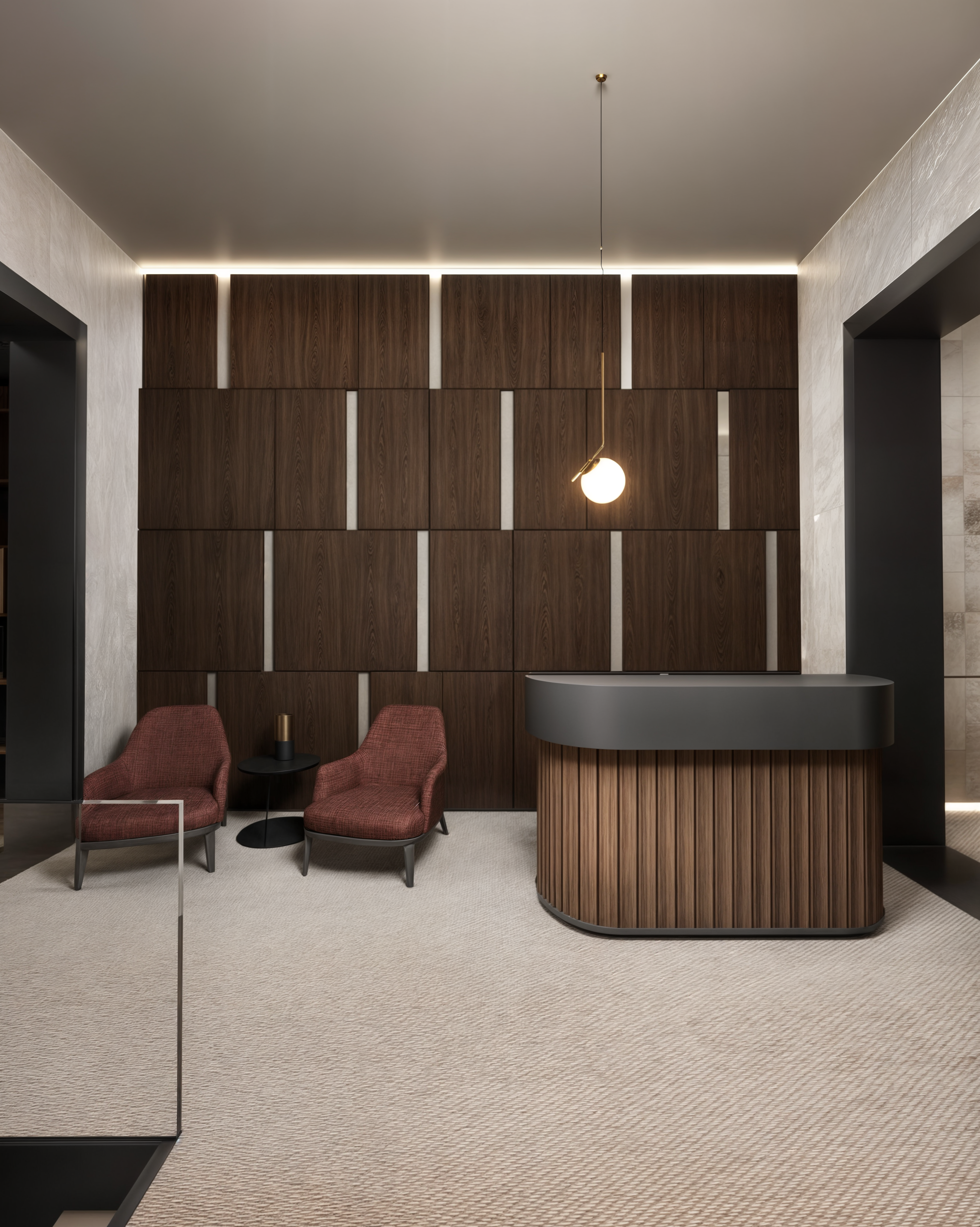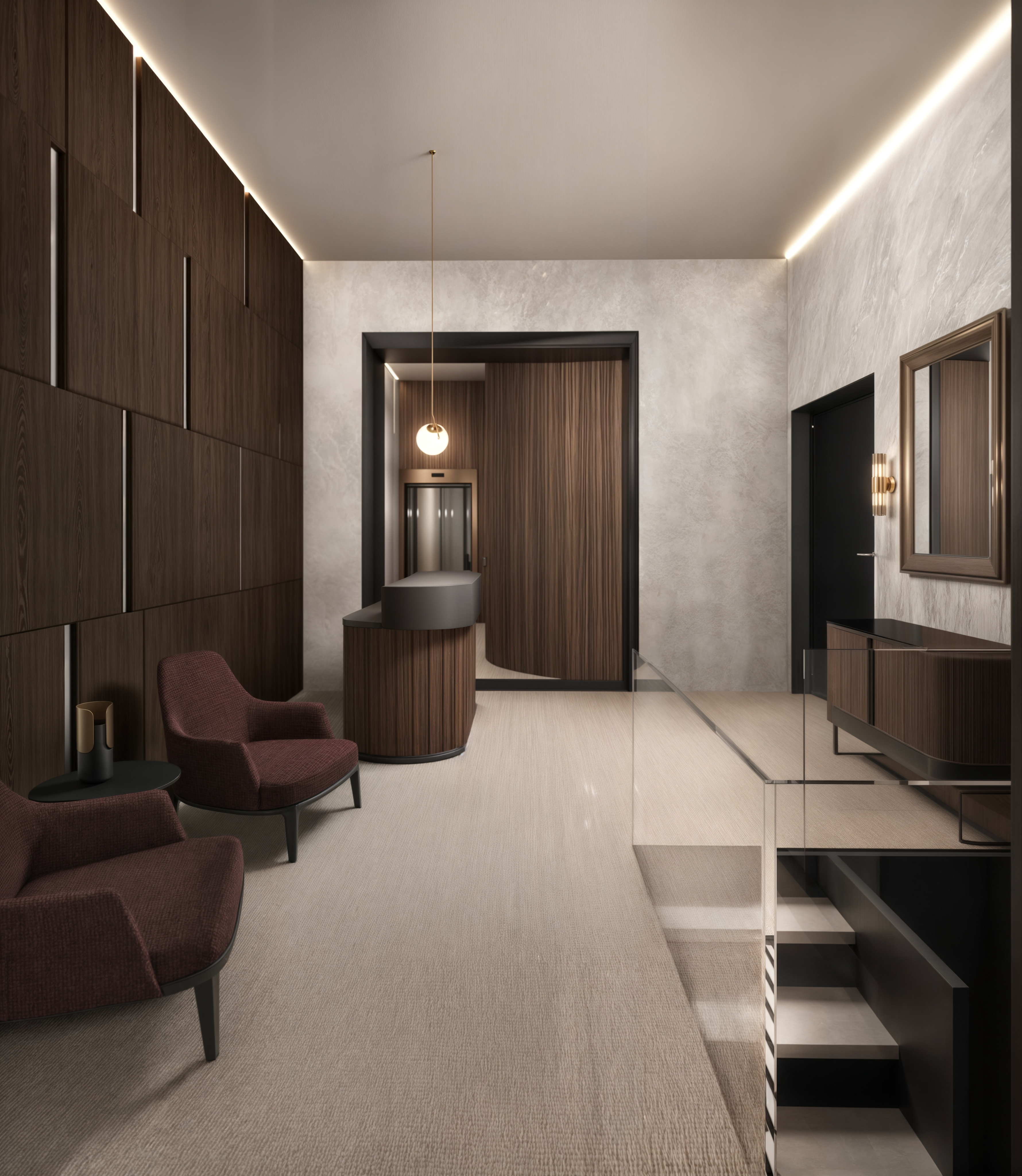 concrete, wood and brass were used, as they were more expressive of the seriousness of the profession.