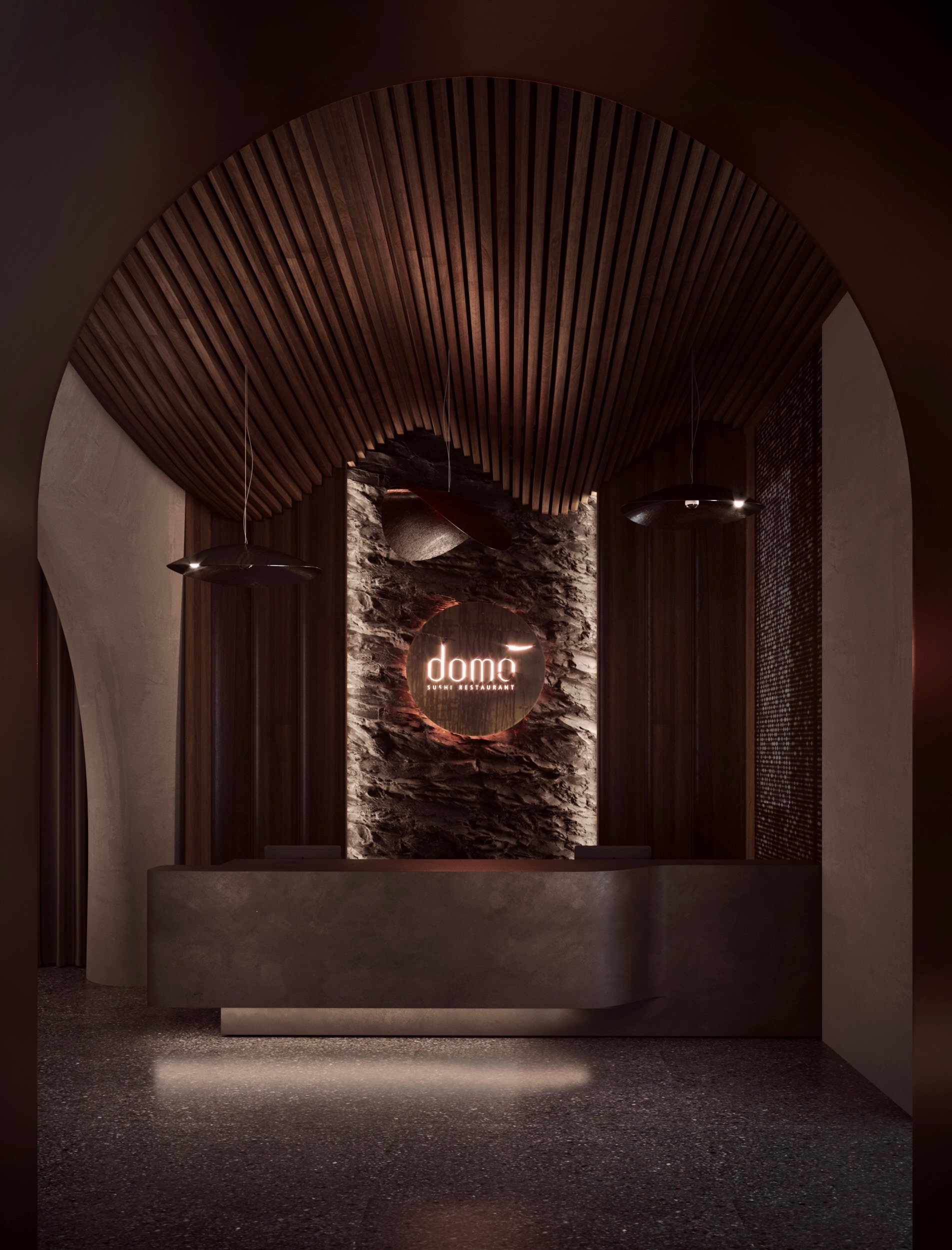 L’ispirazione è quella di un locale internazionale, grandioso e scenografico sin dal lussuoso atrio, così come appare la sala centrale dopo aver varcato l’essenziale ingresso aperto sulla facciata d’epoca. Vele come quinte scenografiche si inclinano sulla navata centrale attraversata dalle morbide forme curvilinee dei divani custom disposti a serpentina che circondano i tavoli. La palette scelta è fatta da tonalità naturali, calde, che giocano con la sabbia, la terra, il travertino, la ruggine e il legno.